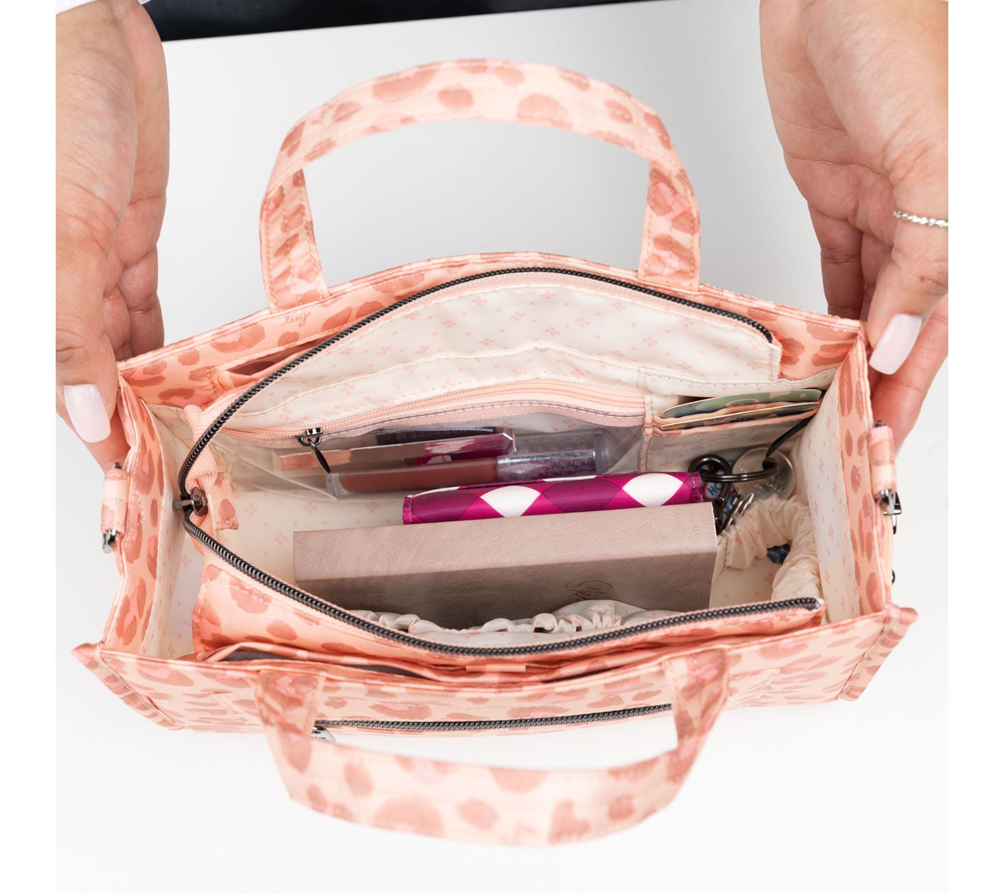 Lined interior, bungee keychain, clear zip pocket, two soft-lined cargo pockets, two RFID card slots