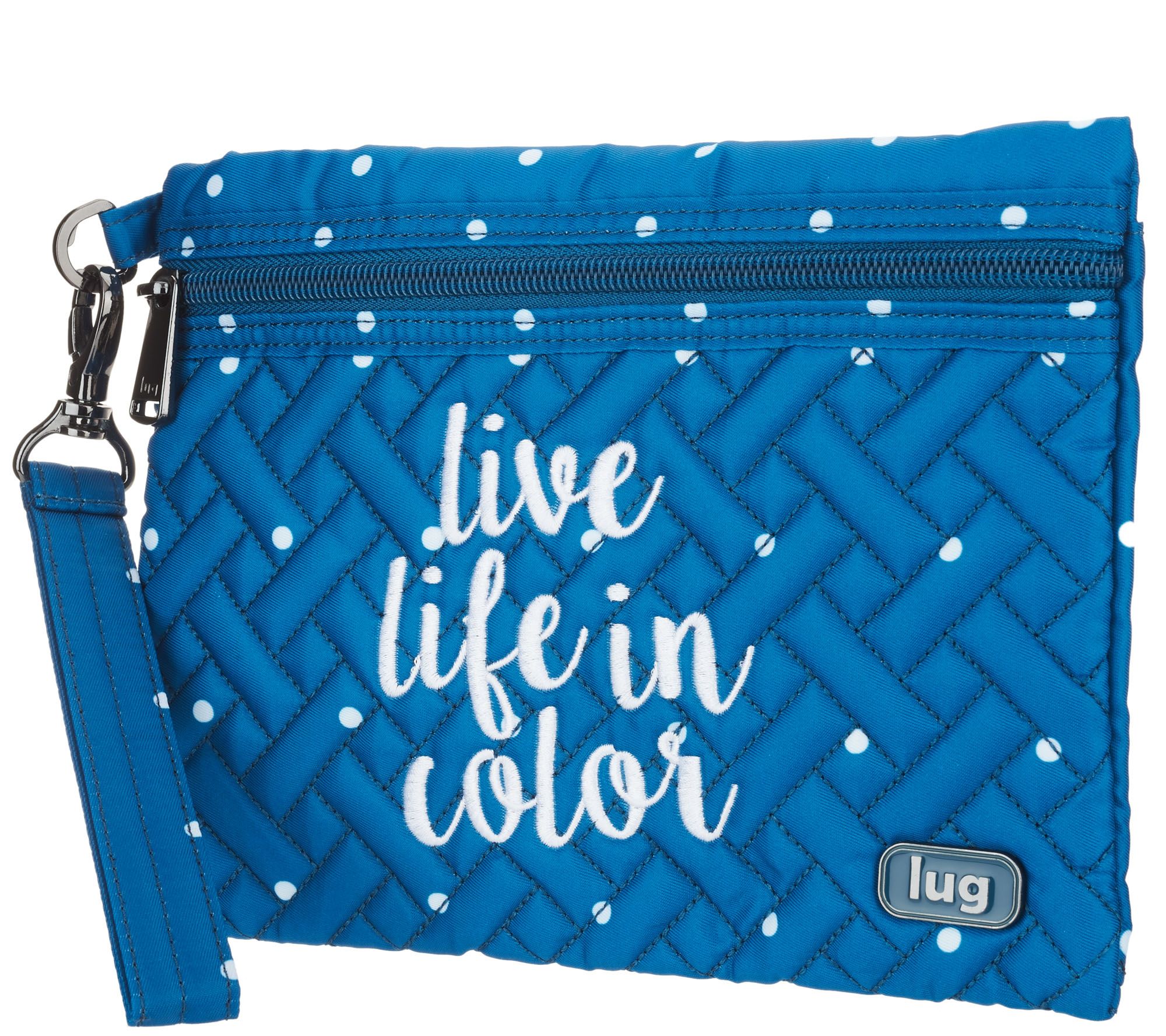 • Wristlet: zipper closure, strap, slip pocket, gunmetal hardware
