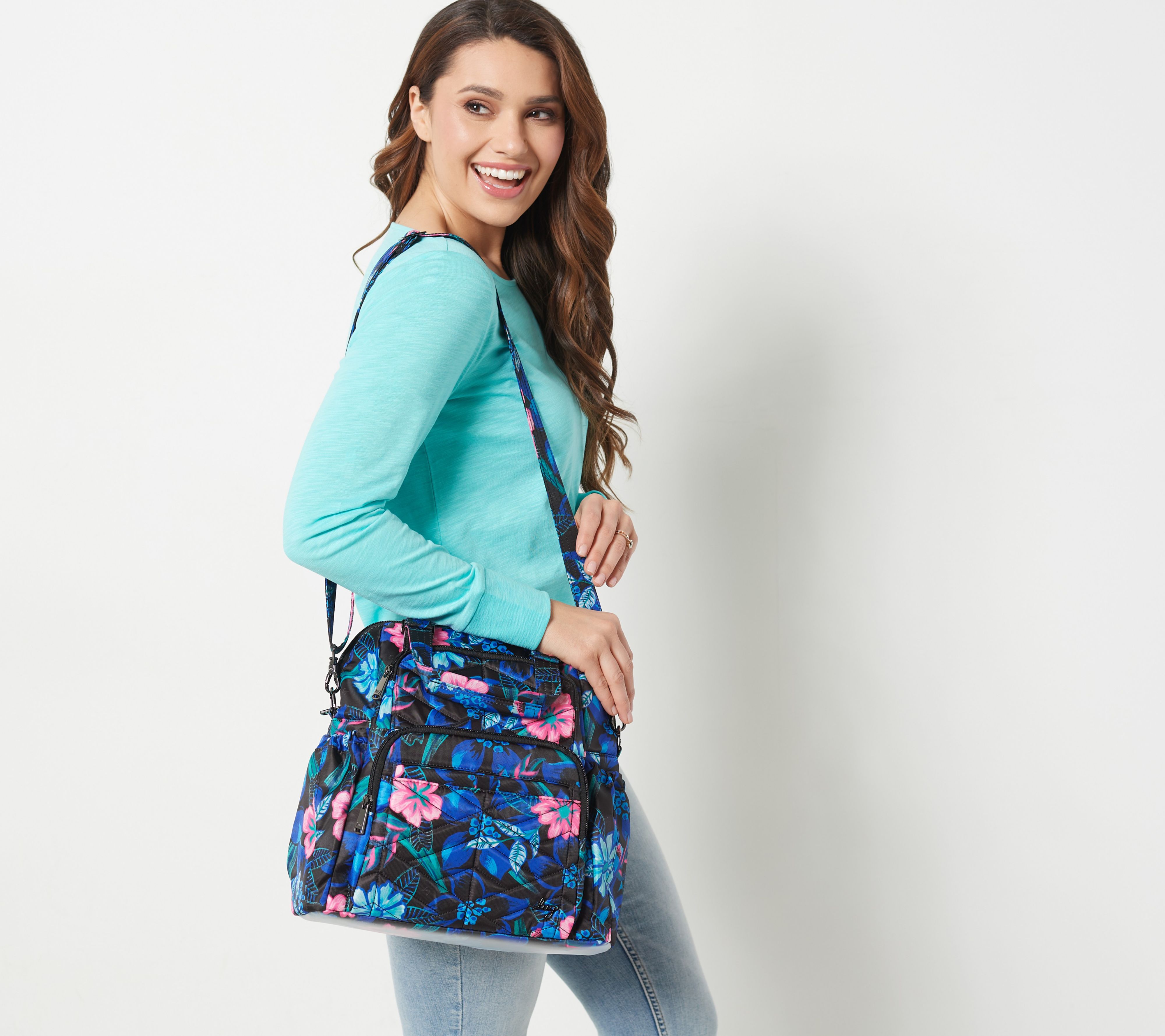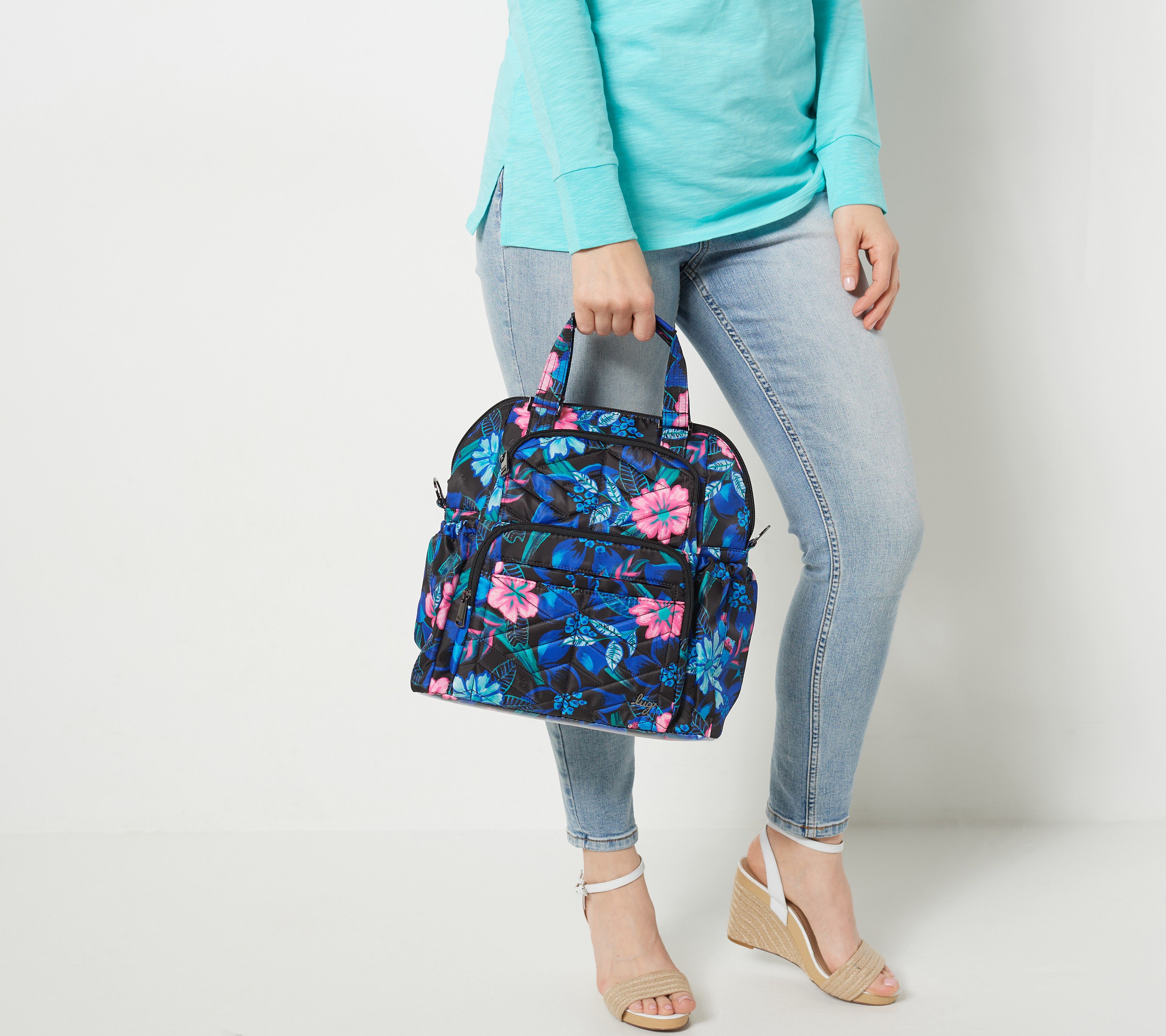 Adjustable and removable crossbody strap, top handles, hideaway adjustable padded non-slip backpack straps, magnetic closure, main zip compartment, front soft-lined slip pockets with magnetic closure, two front zip pockets, back zip pocket, two side cargo pockets with magnetic closure, RFID at front zipper pocket