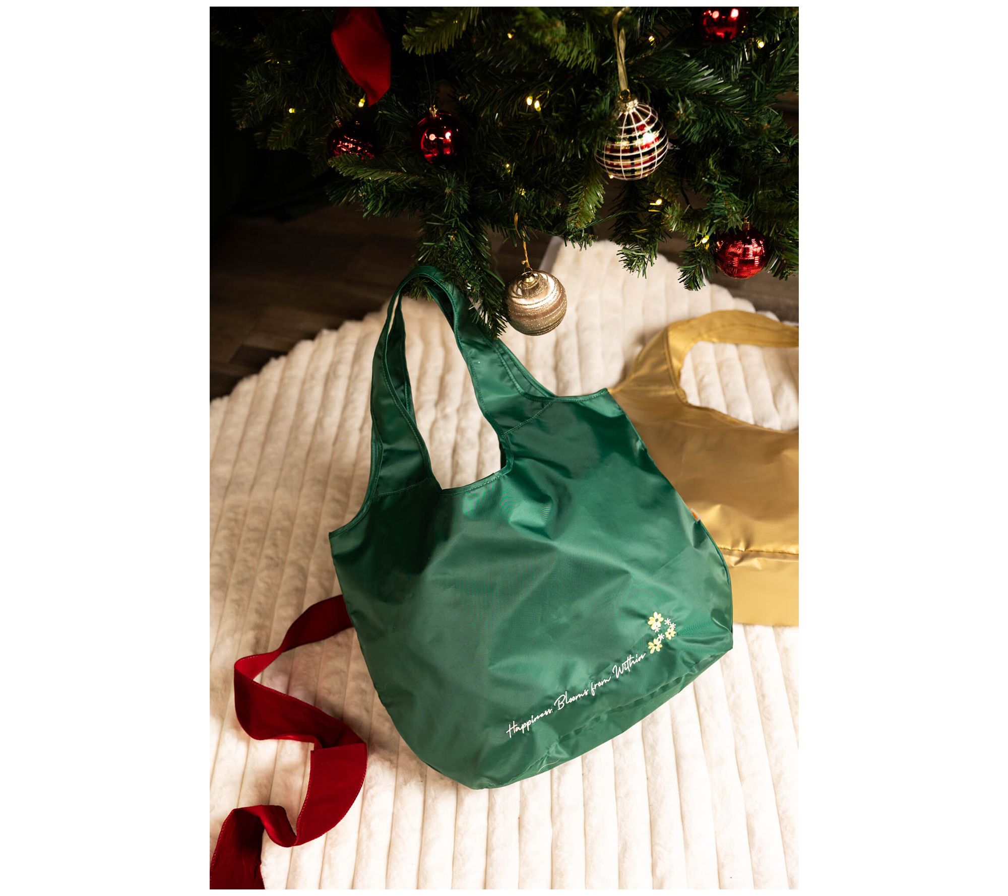 • Wrap strap with snap closure to keep bag folded, embroidered inspirational saying, double handles