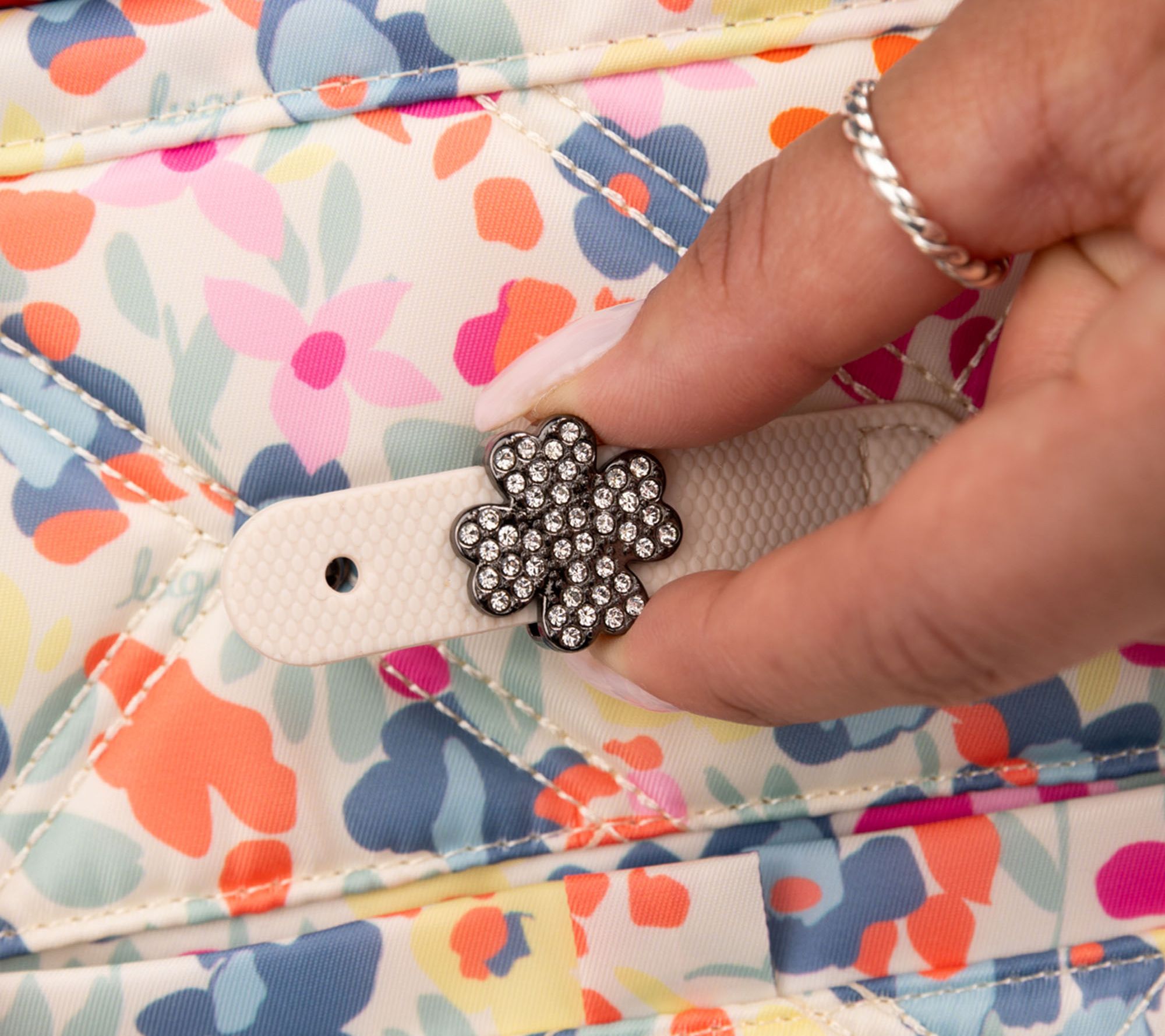 Lined interior, bungee keychain, large privacy zip pocket, clear zip pocket, two soft-lined pockets, two pen holders