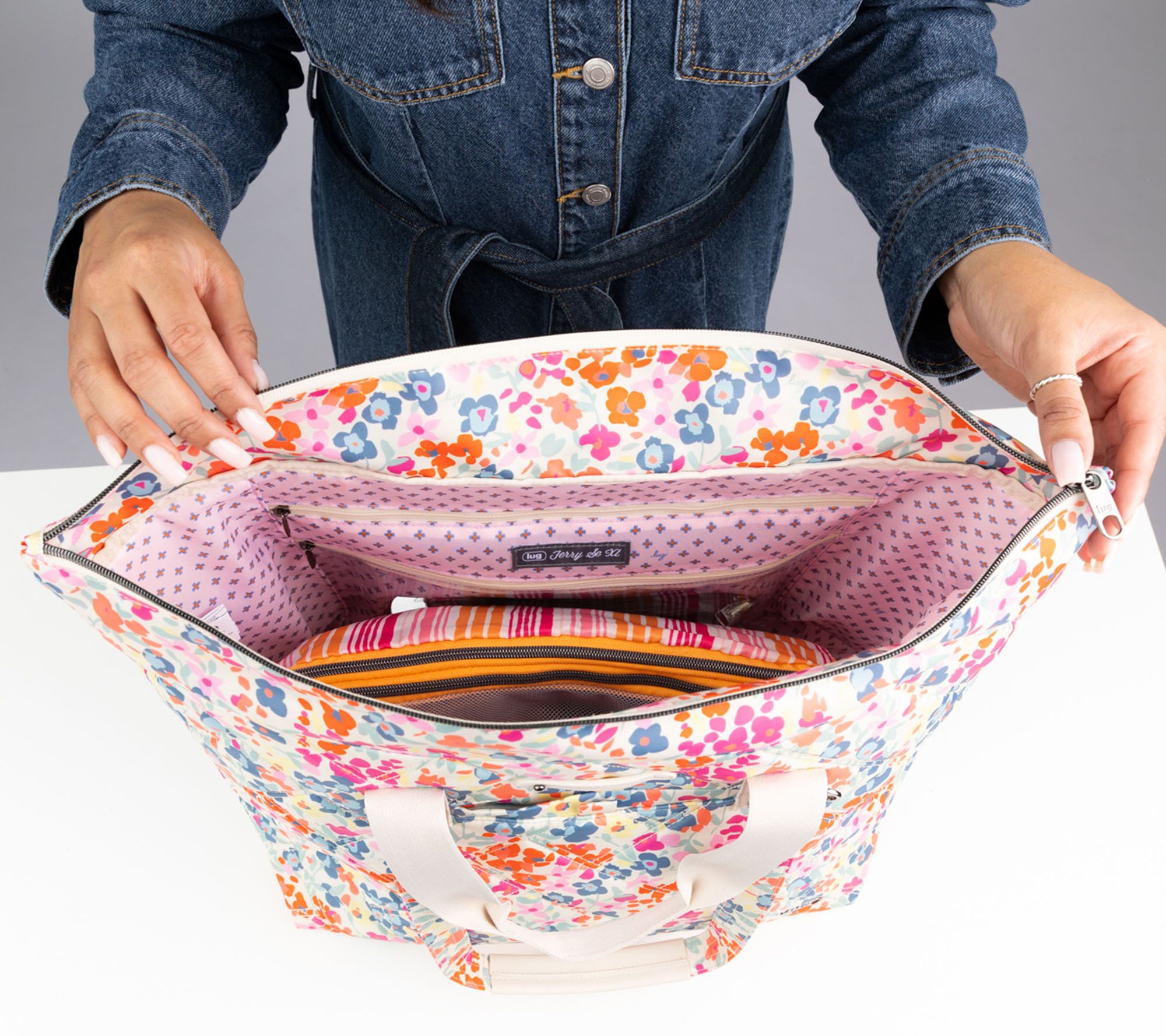 Packing for a getaway or a marathon day of errands gets easier with this expandable carry-all tote. With convenient non-slip tote handles and a roomy interior filled with thoughtful features like soft-lined pockets, a key bungee, and clear interior compartment, every belonging finds a place while you stay organized on the go. Gunmetal hardware and water-repellent construction make it ready for every journey. From Lug.