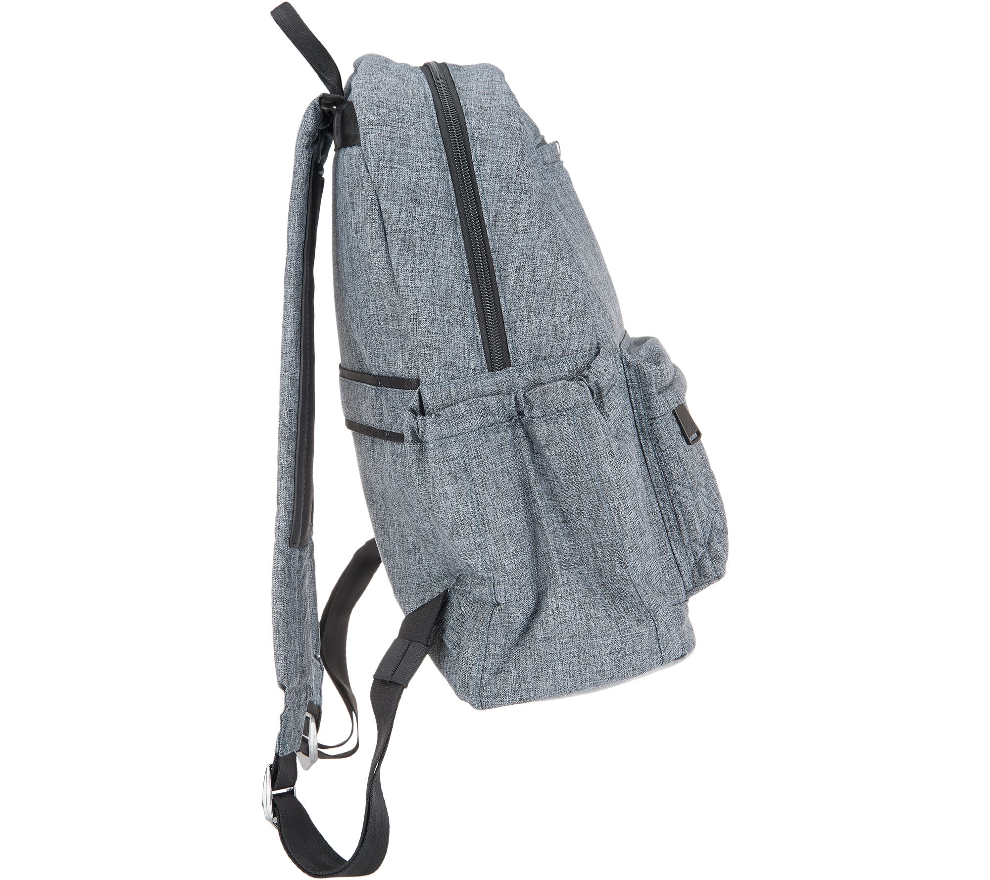 • Top handle, adjustable back straps, trolley sleeve, two side elastic pockets, front slip with magnetic closure, front zip pocket, four bottom feet