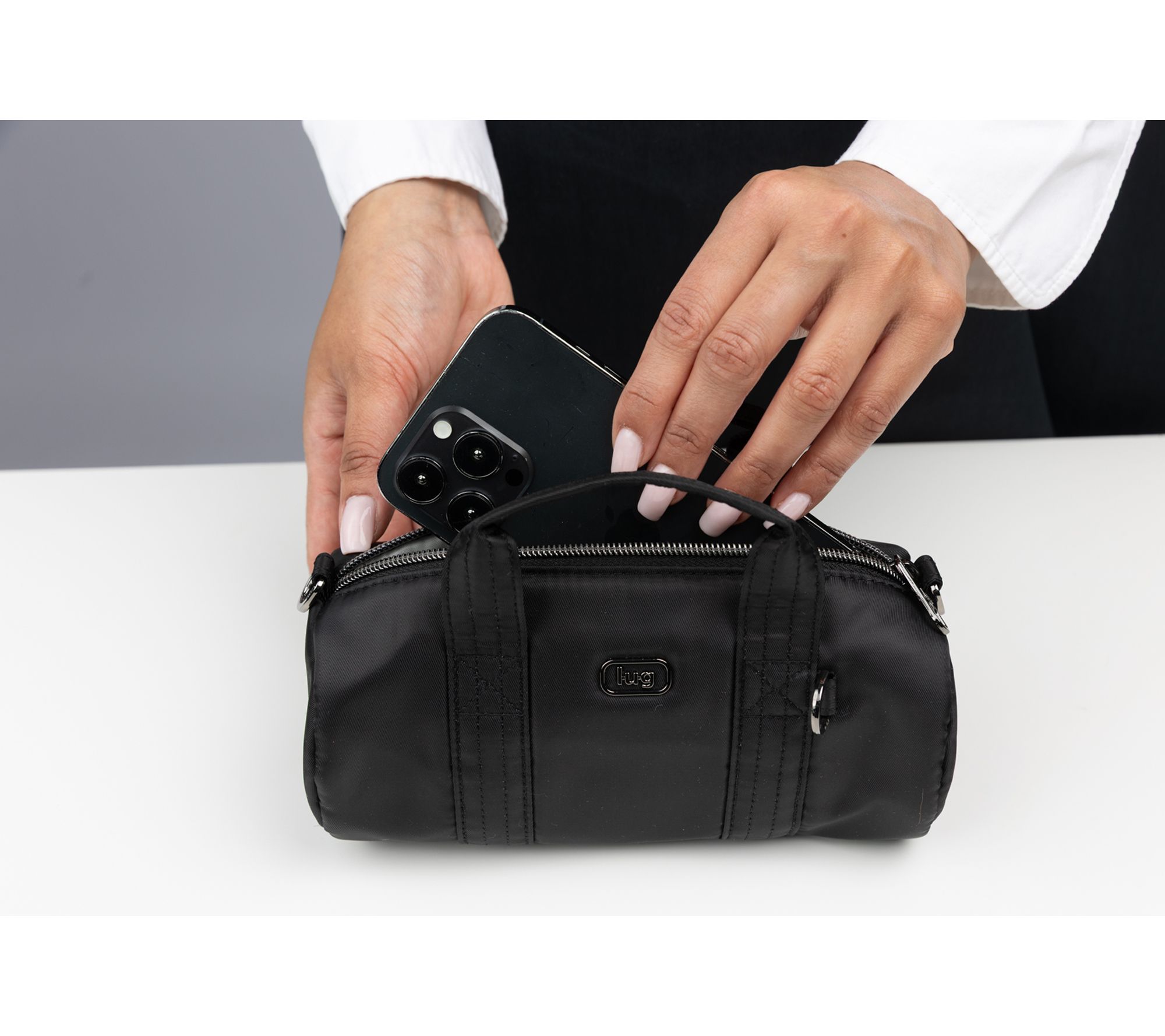 Small but mighty. This compact crossbody is ready for morning errands, city strolls, or travel adventures -- rain or shine thanks to it's water-repellent shell! Its top handles make it simple to grab on the go, while a removable strap offers effortless hands-free wear. Inside and out, strategic pockets hold your ID, cards, and small essentials, keeping you organized all day. From Lug.