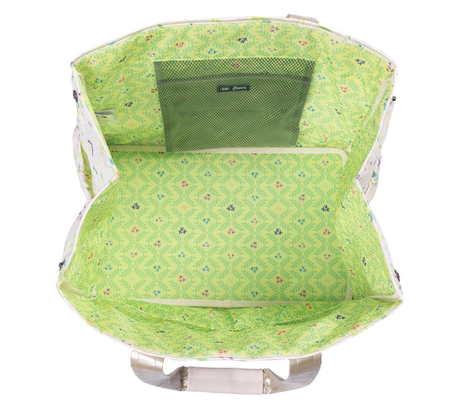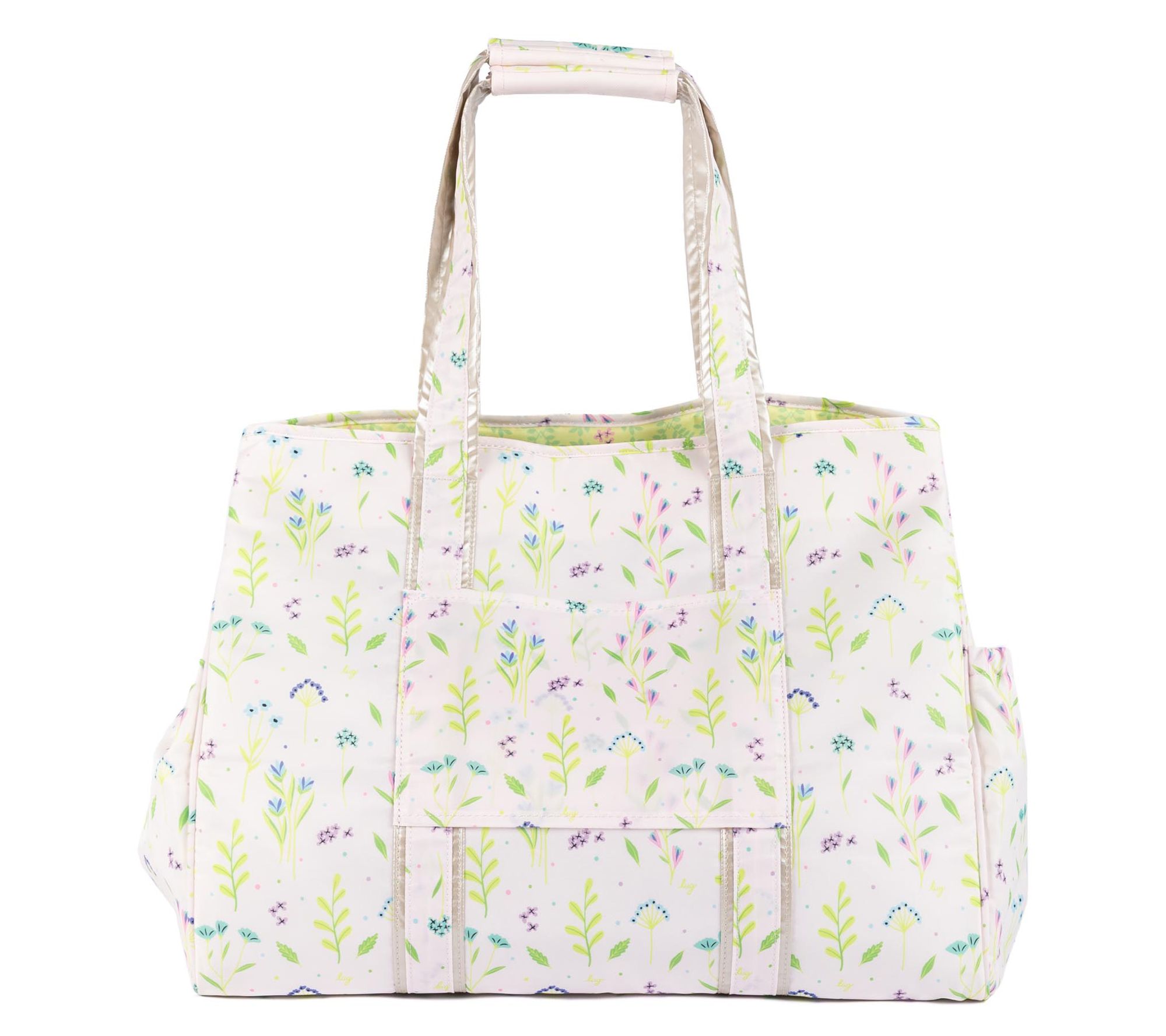 Padded handles, trolley sleeve, wipeable bottom, one front pocket, two side snap buttons, easy-grip tote handles, two side cargo pockets with touch fasteners