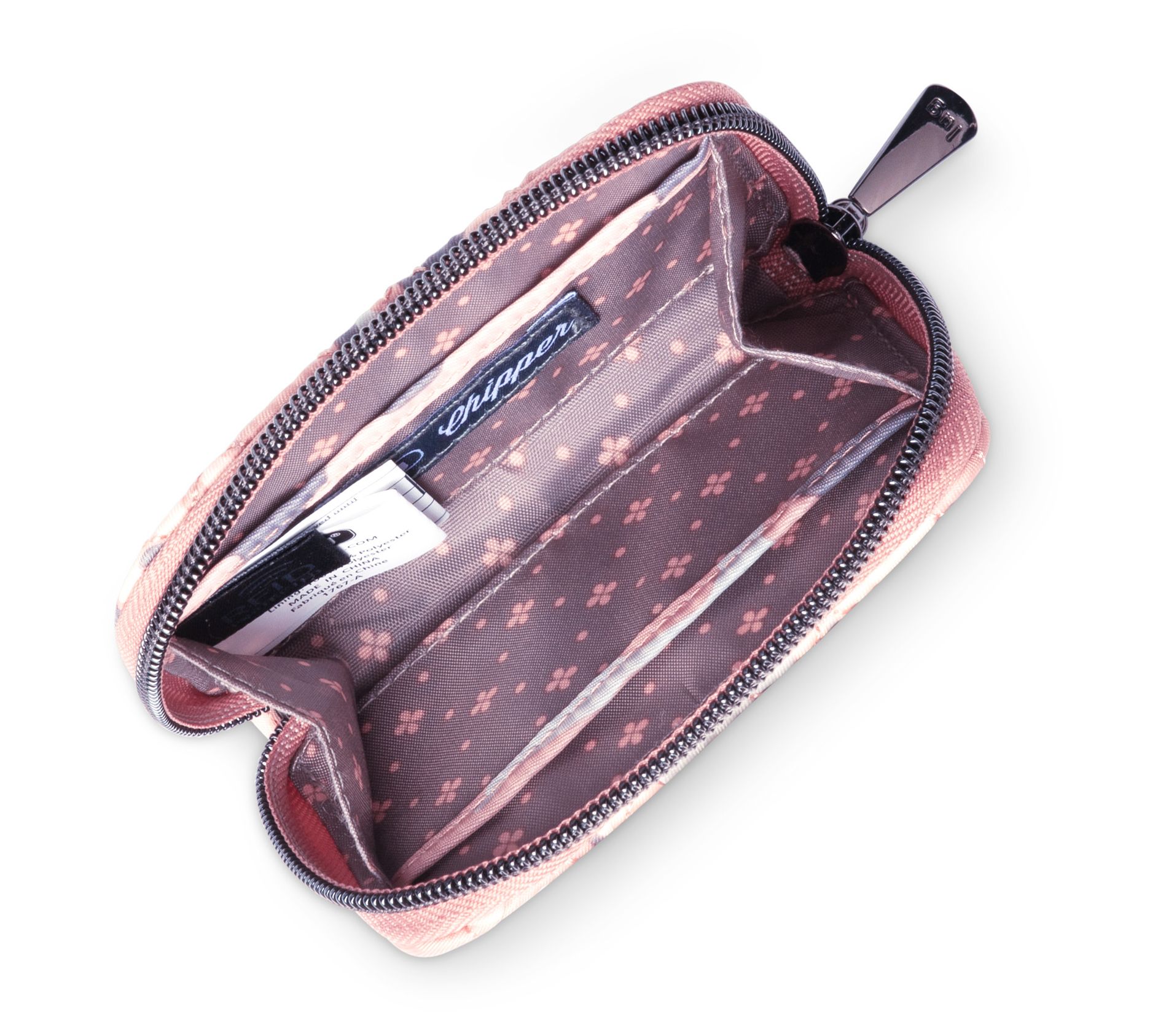 • Built-in wristlet strap, gunmetal hardware, zip-top closure