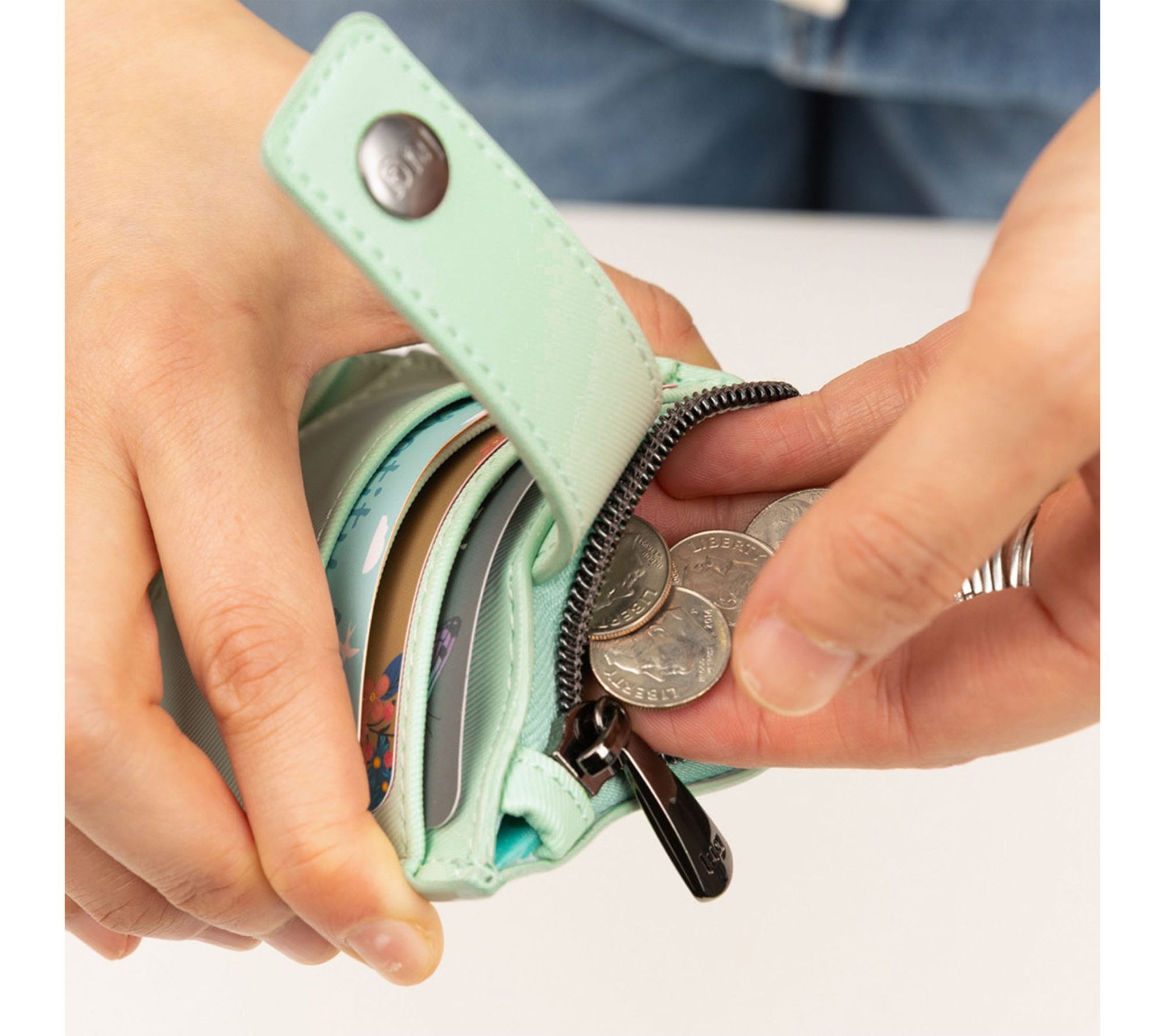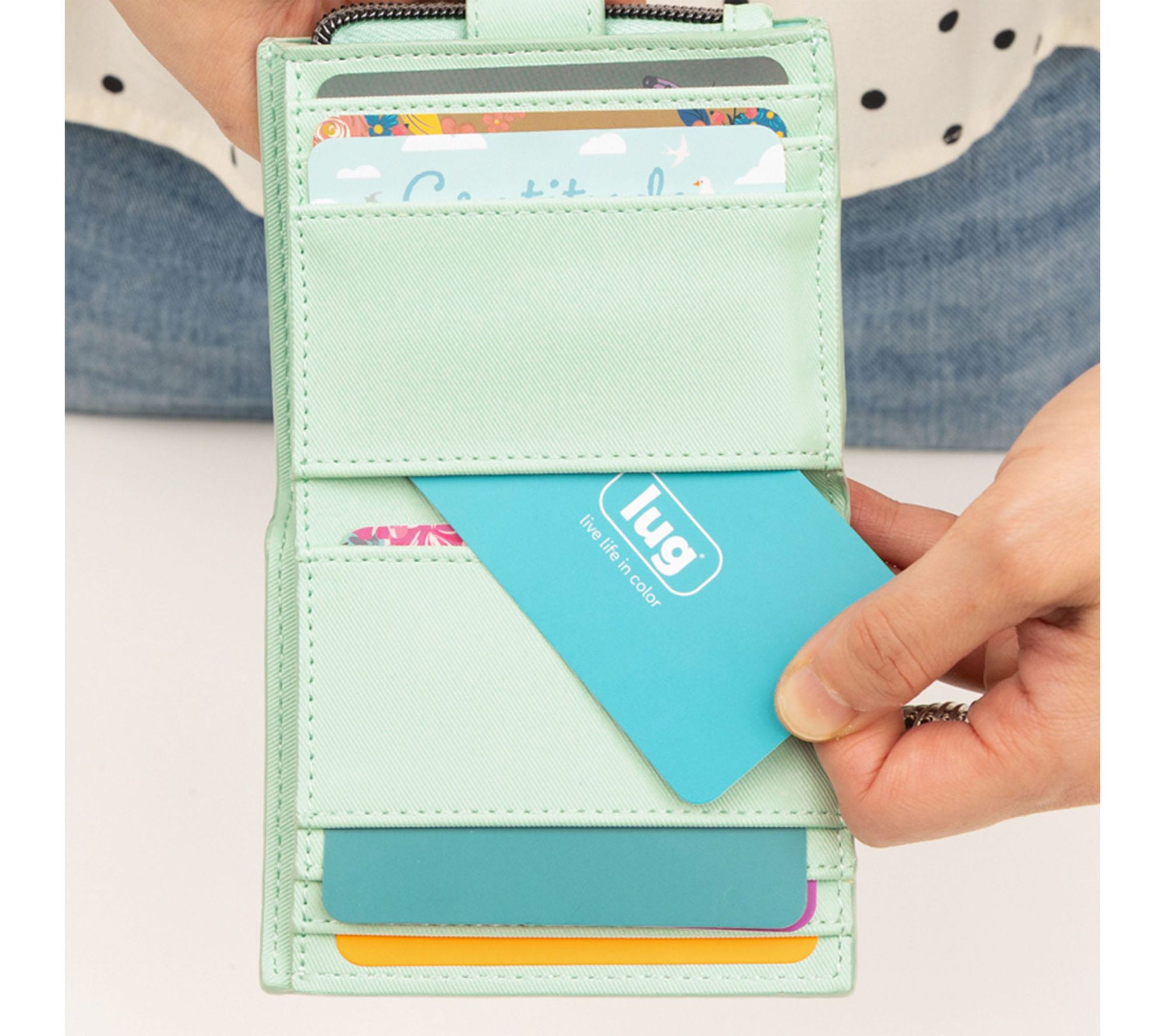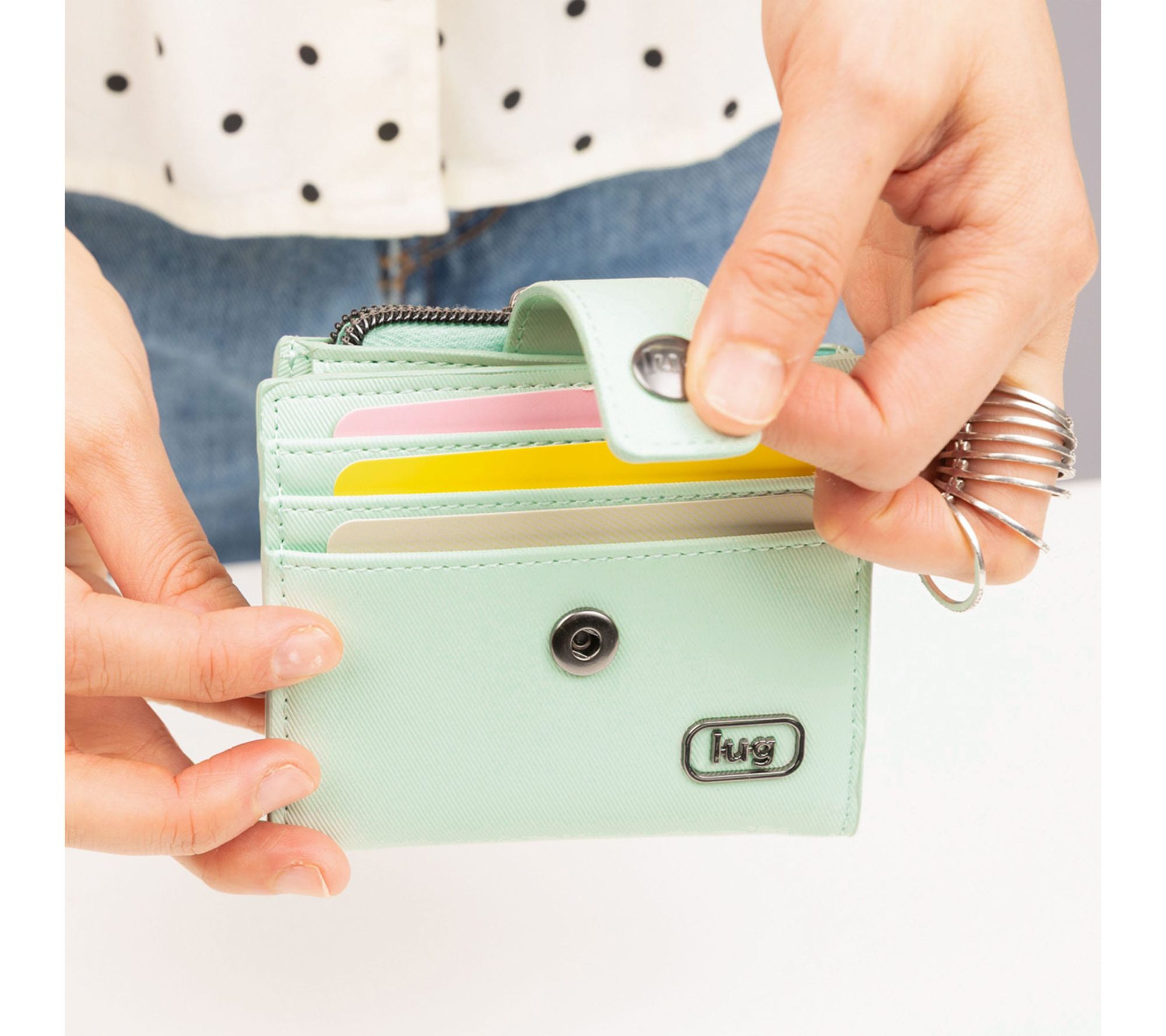 Slide this compact wallet into your favorite bag or clutch and stay organized on the go. With a snap closure and cleverly designed slip and card pockets, it's easy to reach for your essentials -- whether you're running errands or meeting friends for coffee. From Lug.