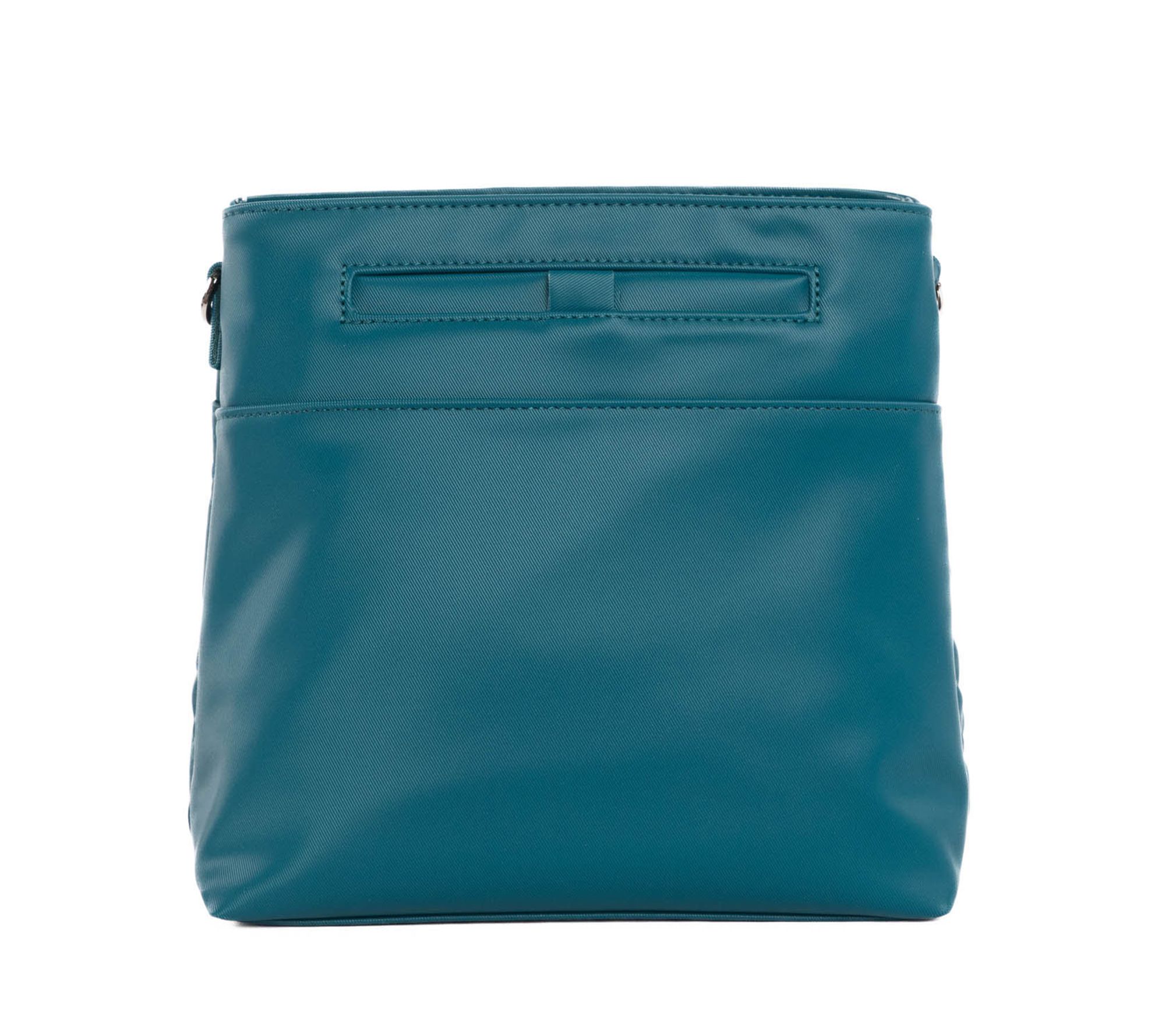 Water-repellent, quilted Satin Luxe exterior, front zip pocket with oversized pull, double top zip closure, back soft-lined pocket with magnetic closure, adjustable/removable crossbody strap