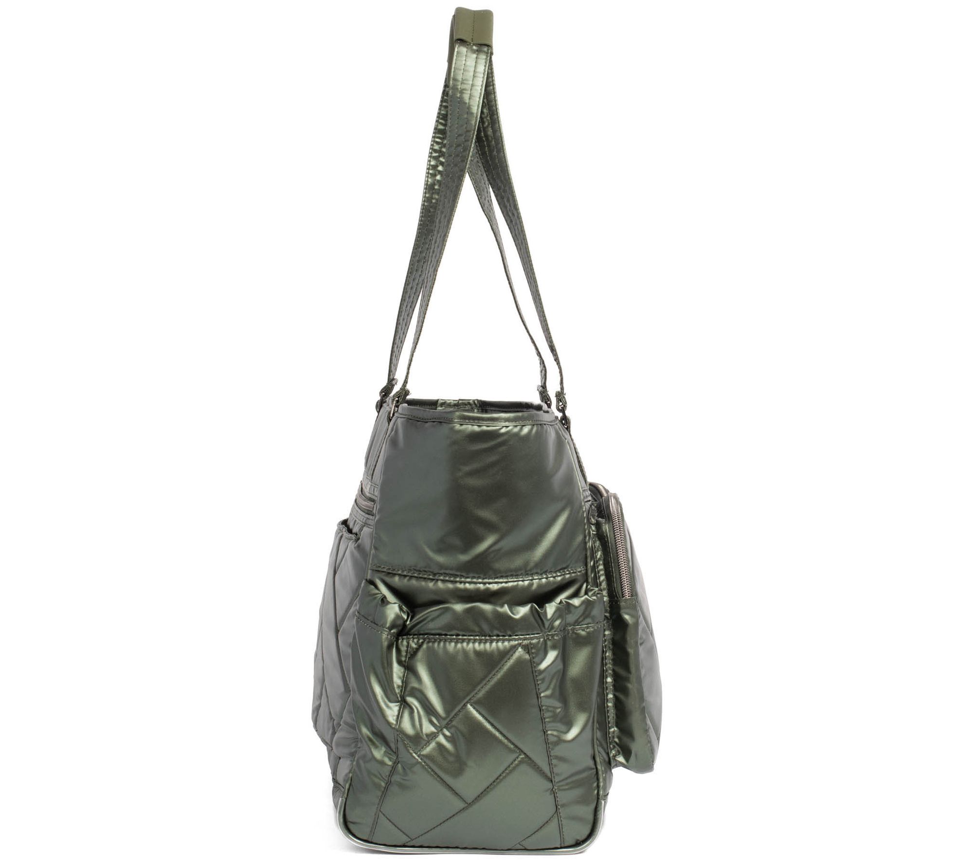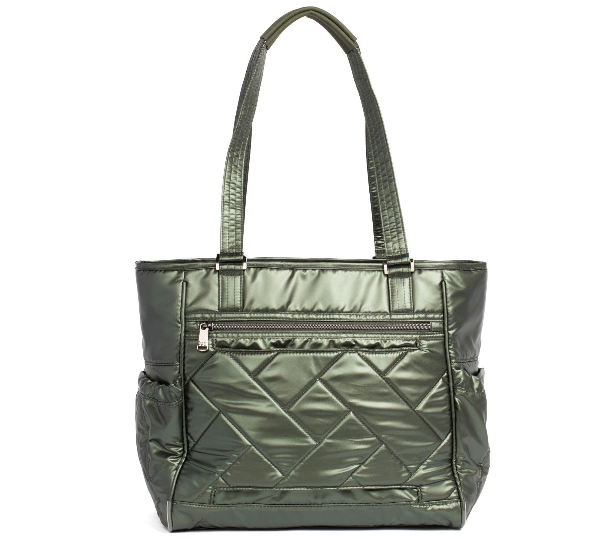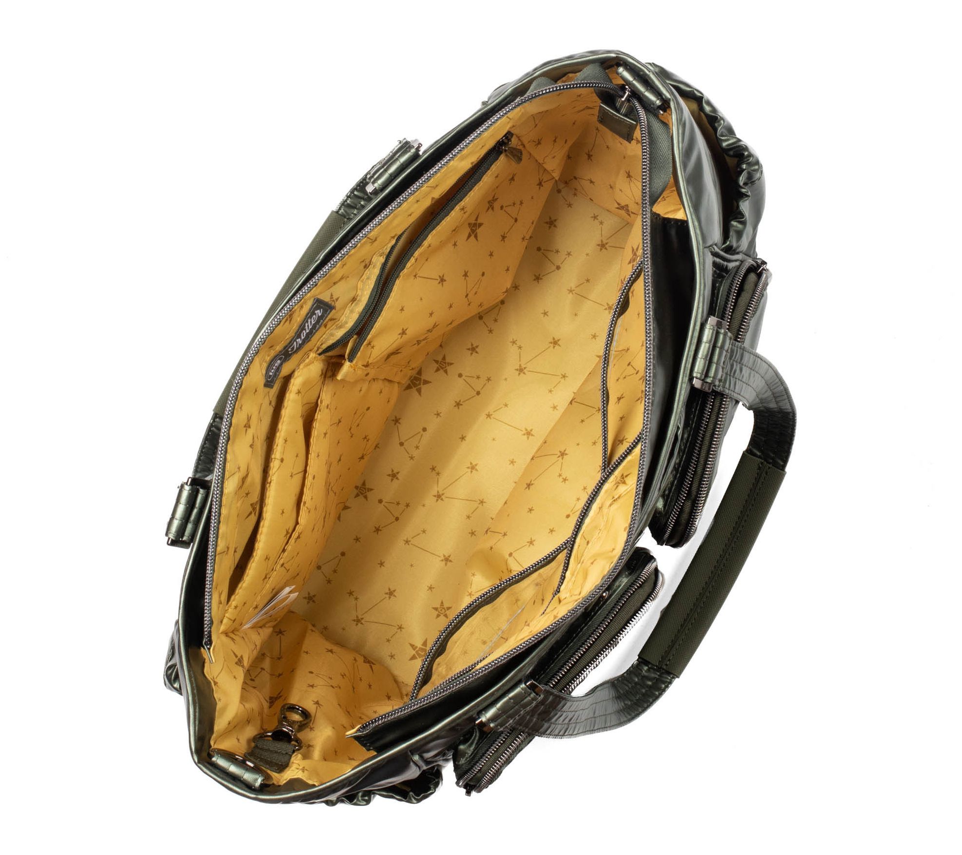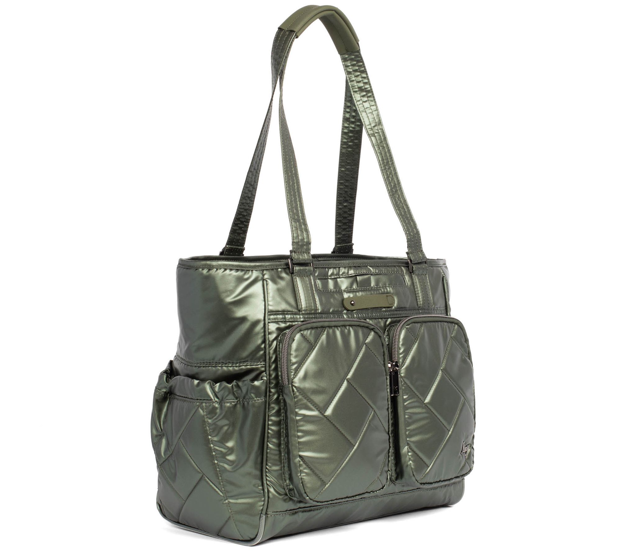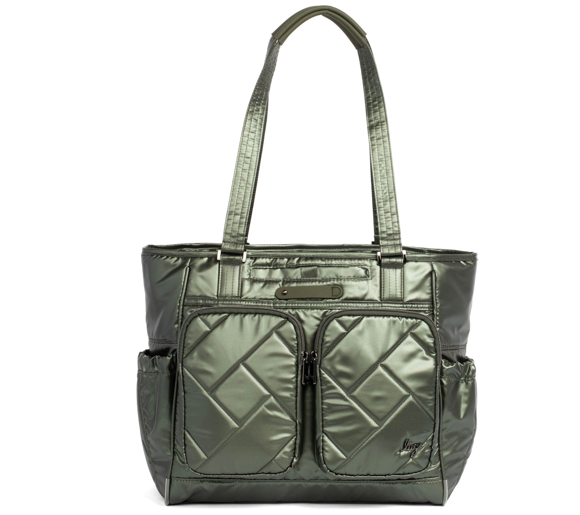 Zip-top closure, gunmetal hardware, Lug Charm Bar - Lug Charm sold separately, one main zip compartment, padded shoulder straps, cell phone slip pocket, two front zip pockets, two gusseted side cargo pockets with magnetic closure, back zip pocket, trolley sleeve, Wipeable bottom with feet, crossbody strap not included