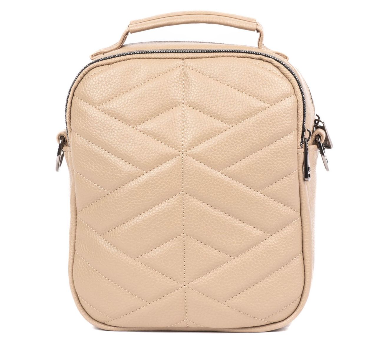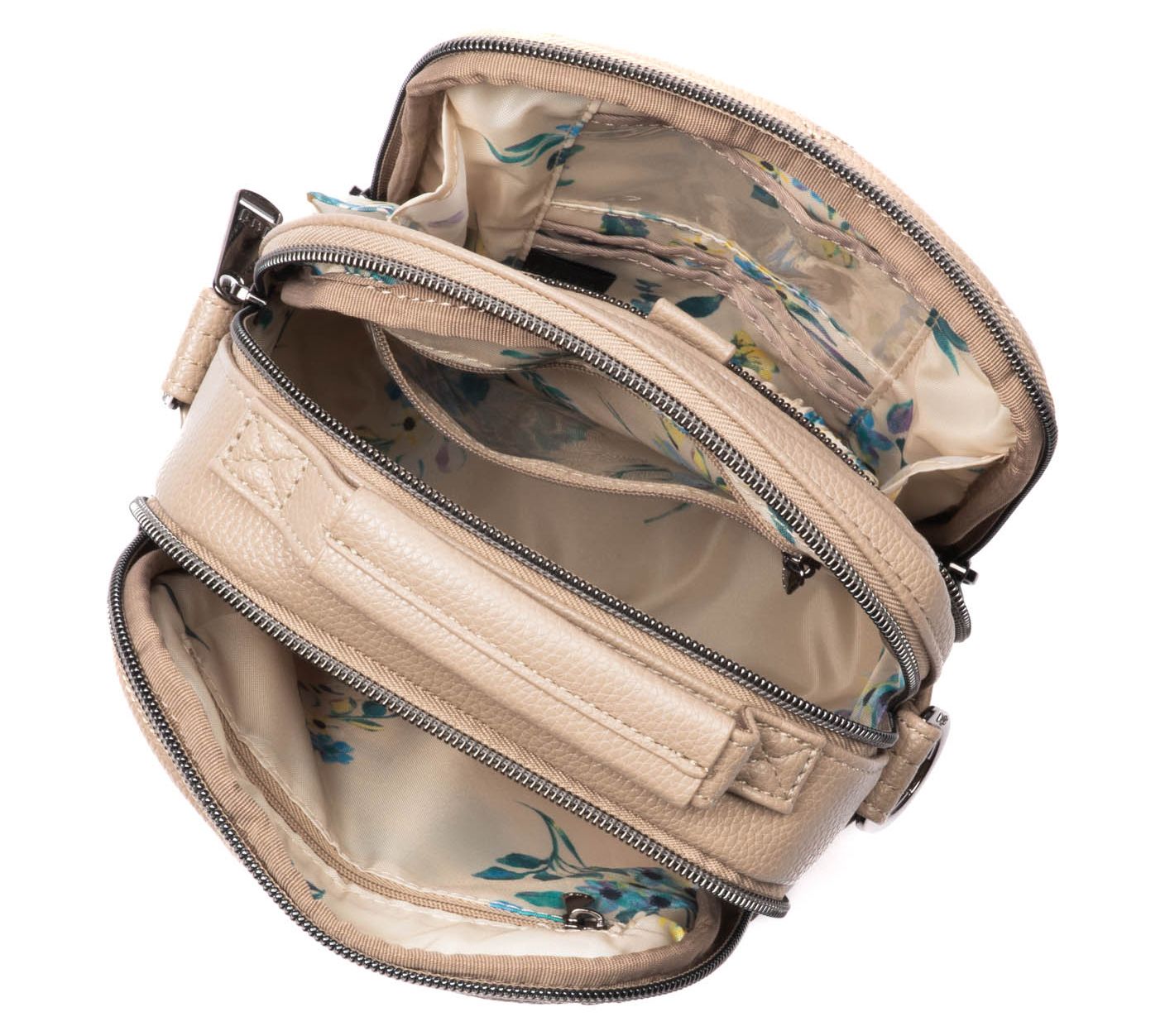Exterior features main zipper compartment, top zipper pocket, RFID protected front zipper pocket, back belt loops to convert to belt bag