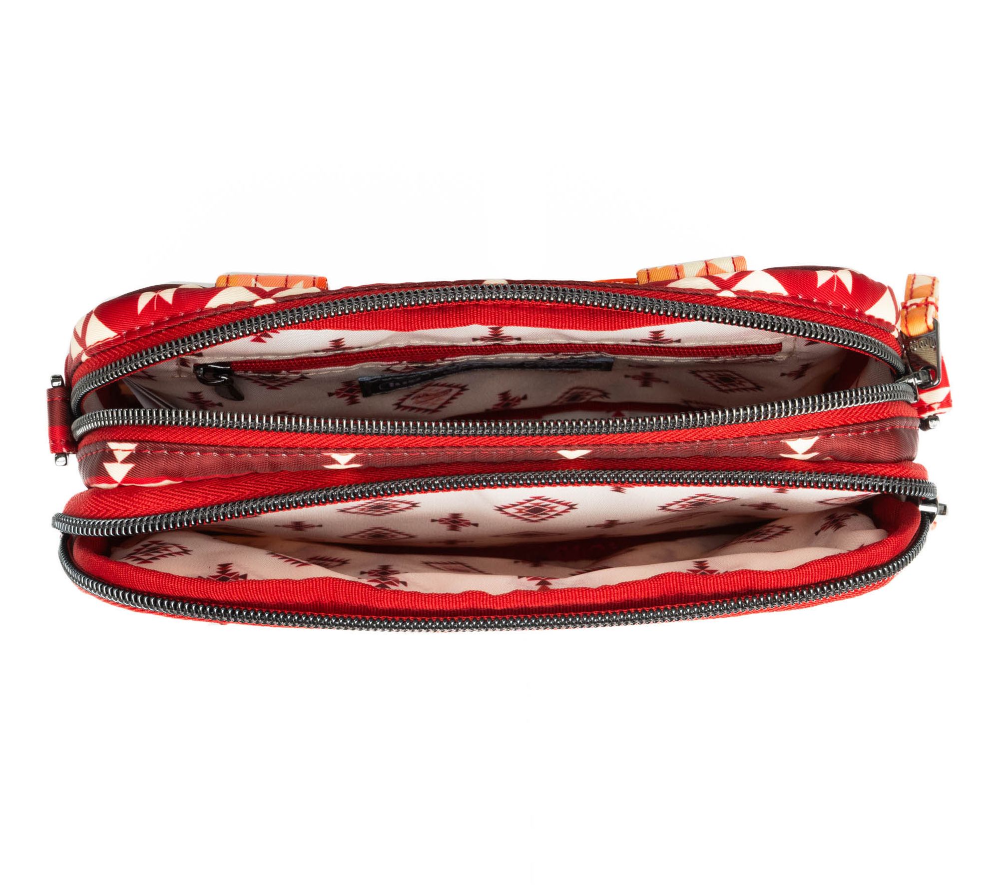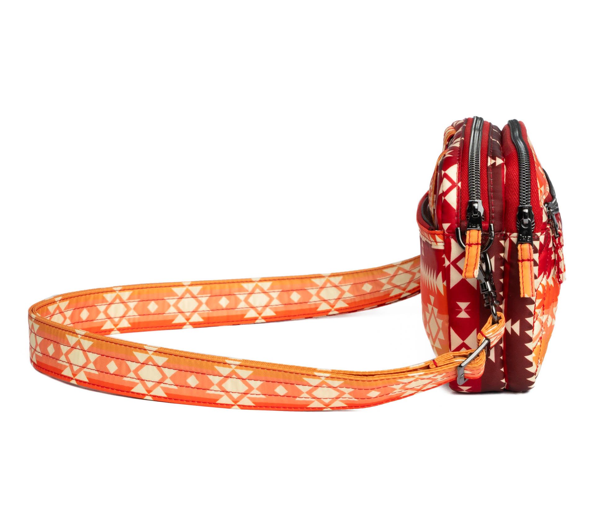 Water-repellent body, removable/adjustable crossbody strap, front and back zipper pockets, belt loops, two main zipper compartments, small D-rings