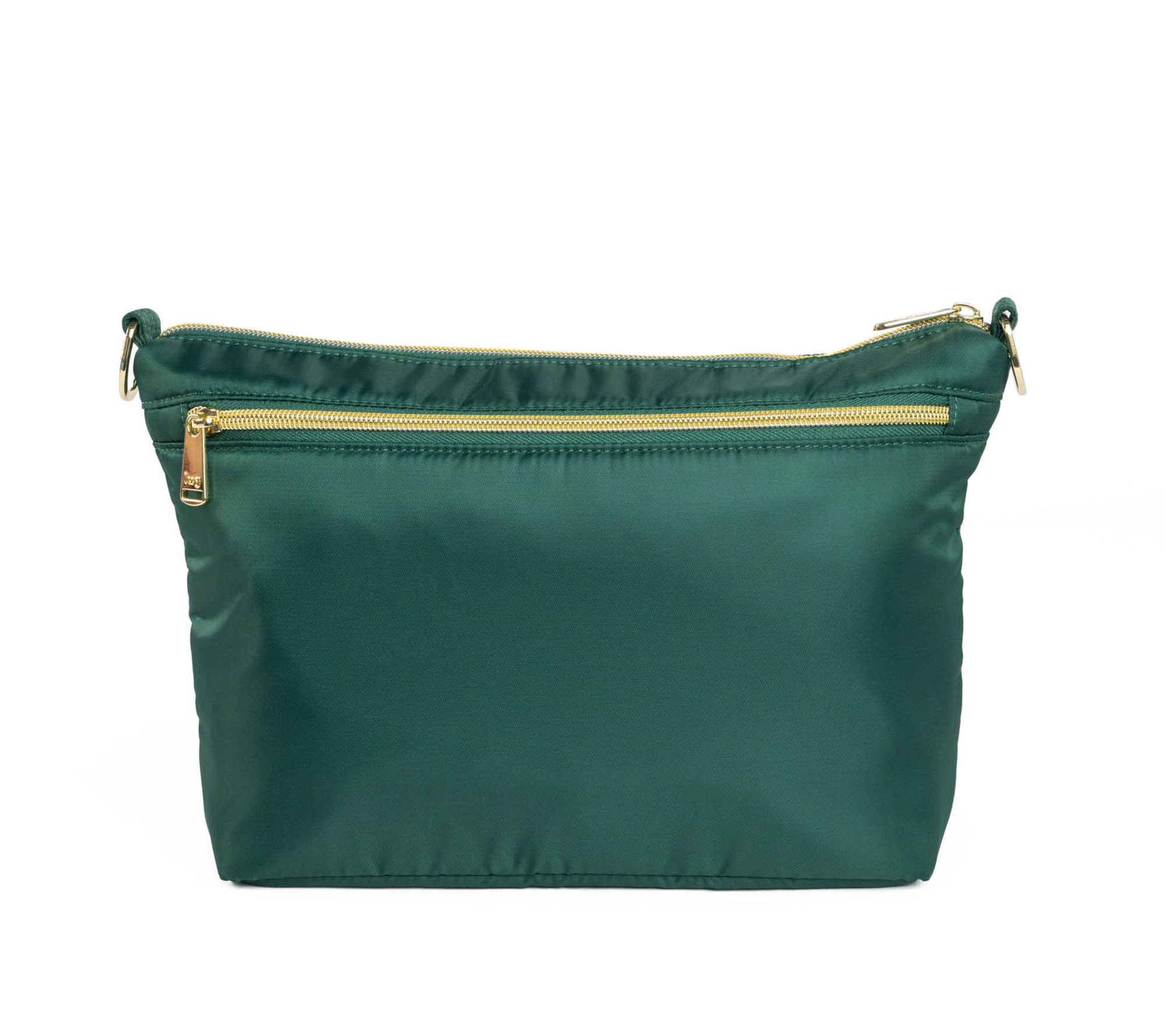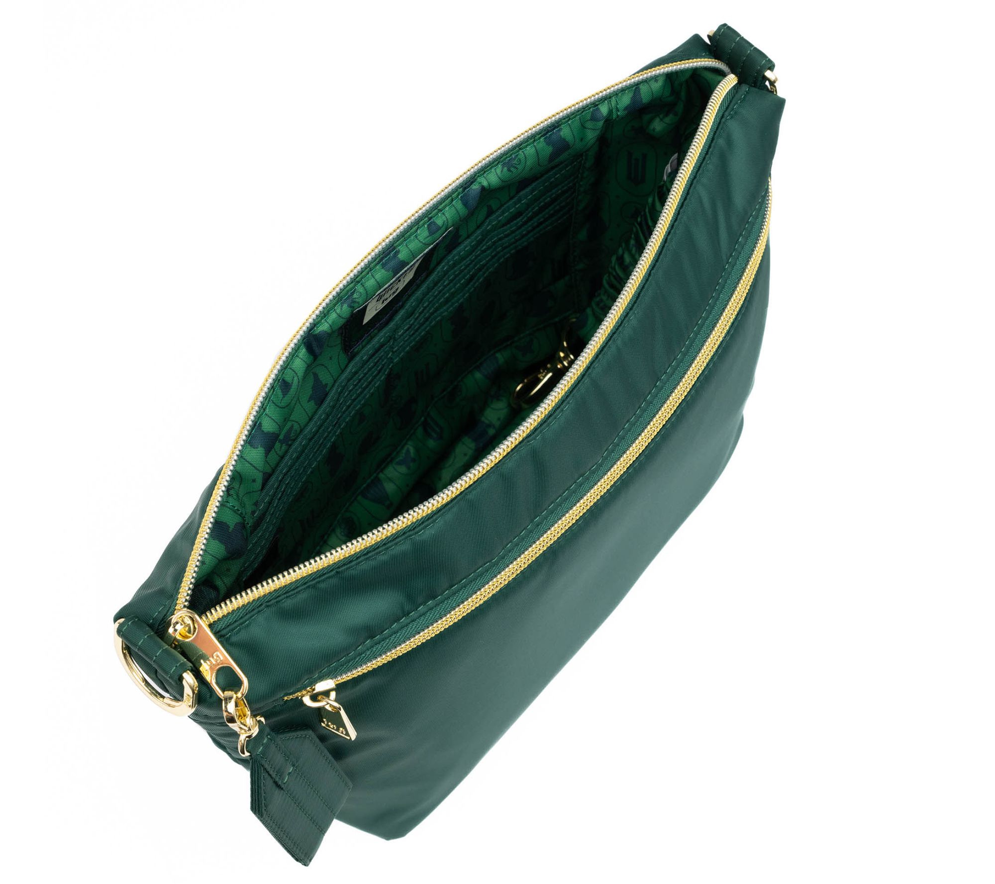 Charm bar, soft-lined pocket with magnetic closure, main zip compartment, rear zip compartment