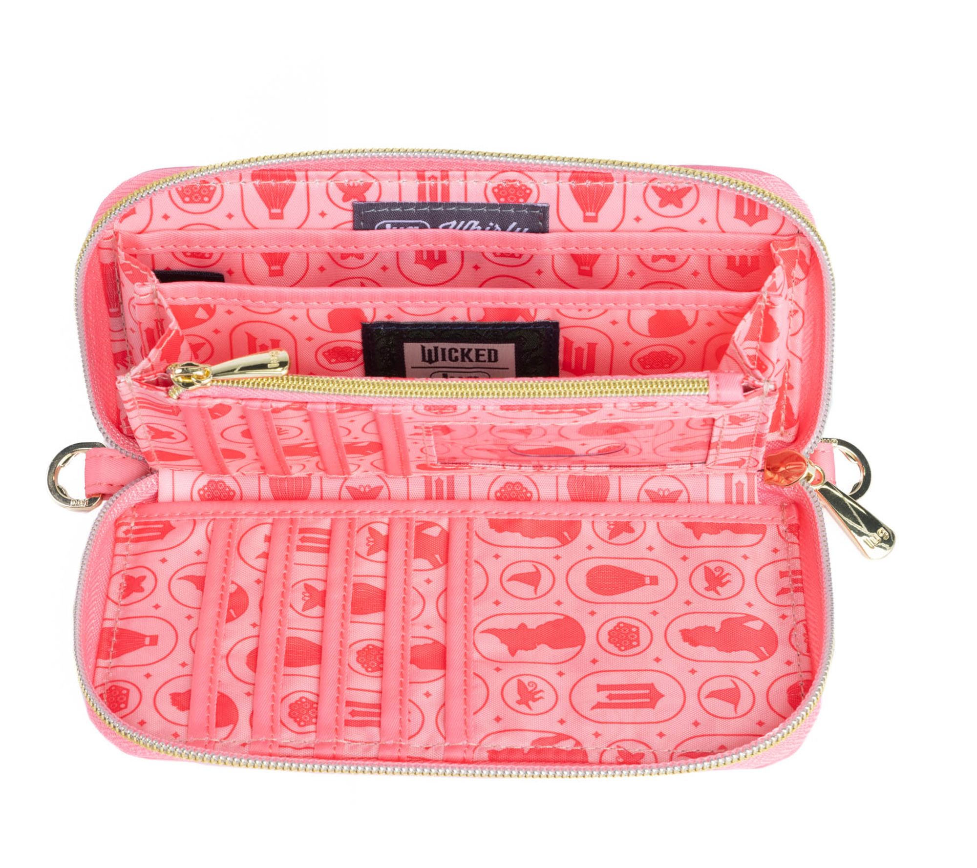 Charm bar, main zip compartment, rear zip compartment, two D-rings to attach wristlet strap, additional Wicked strap