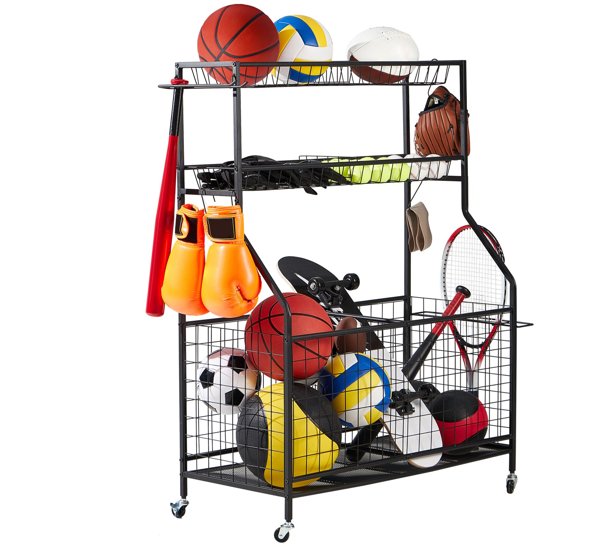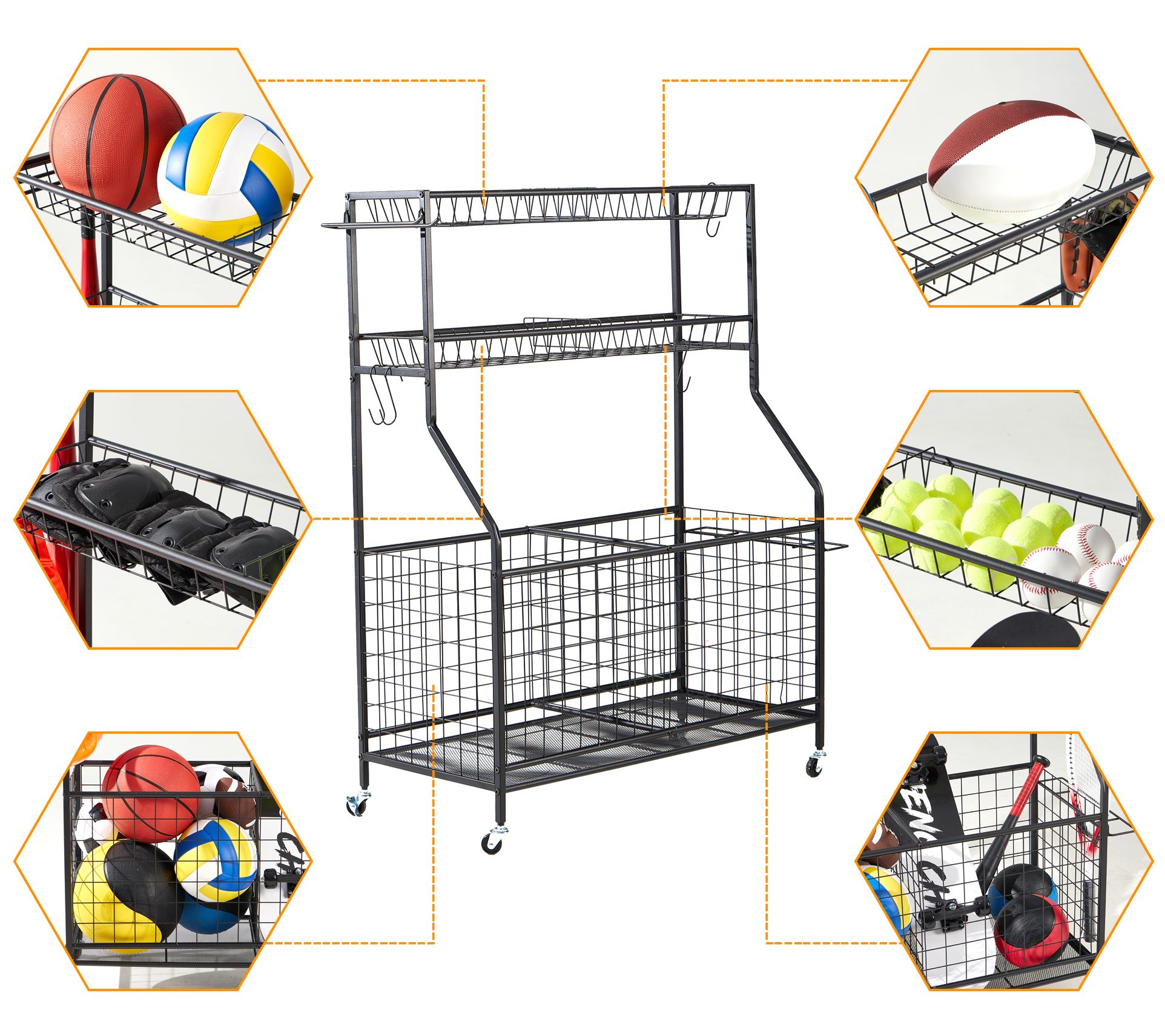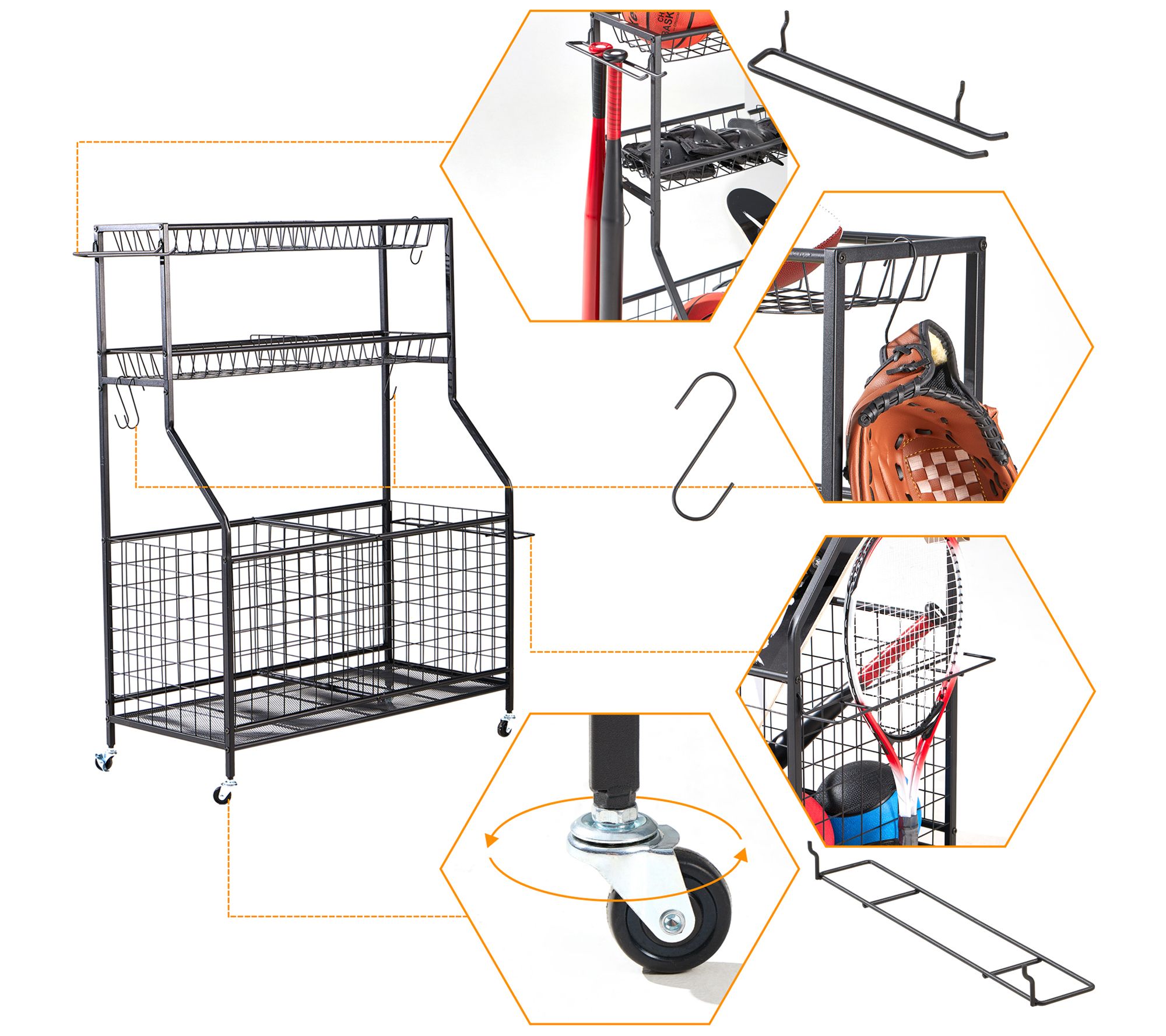 • Includes organizer set with panels, two baskets, bat organizer, racket organizer, hooks, four wheels, and screw kit