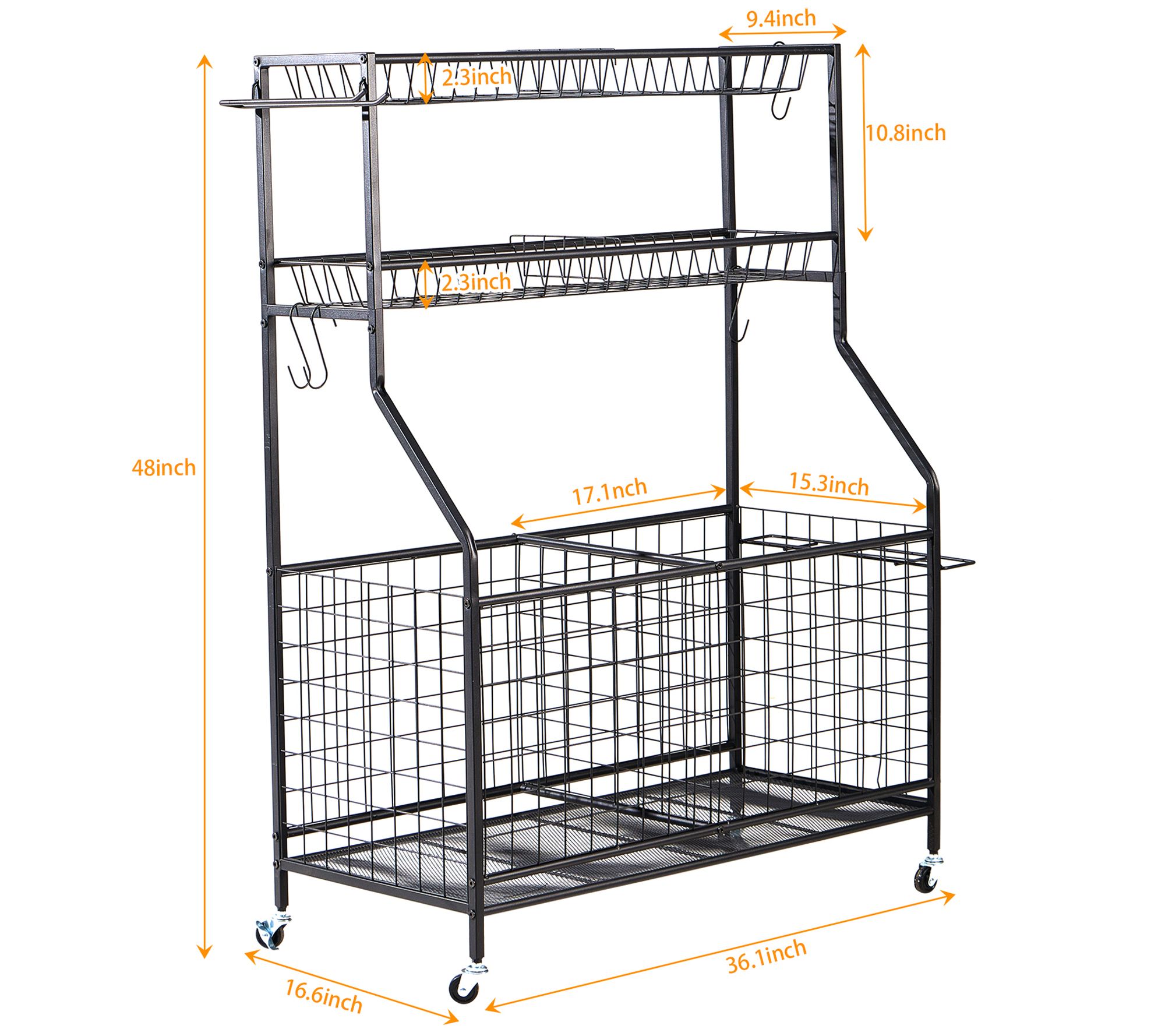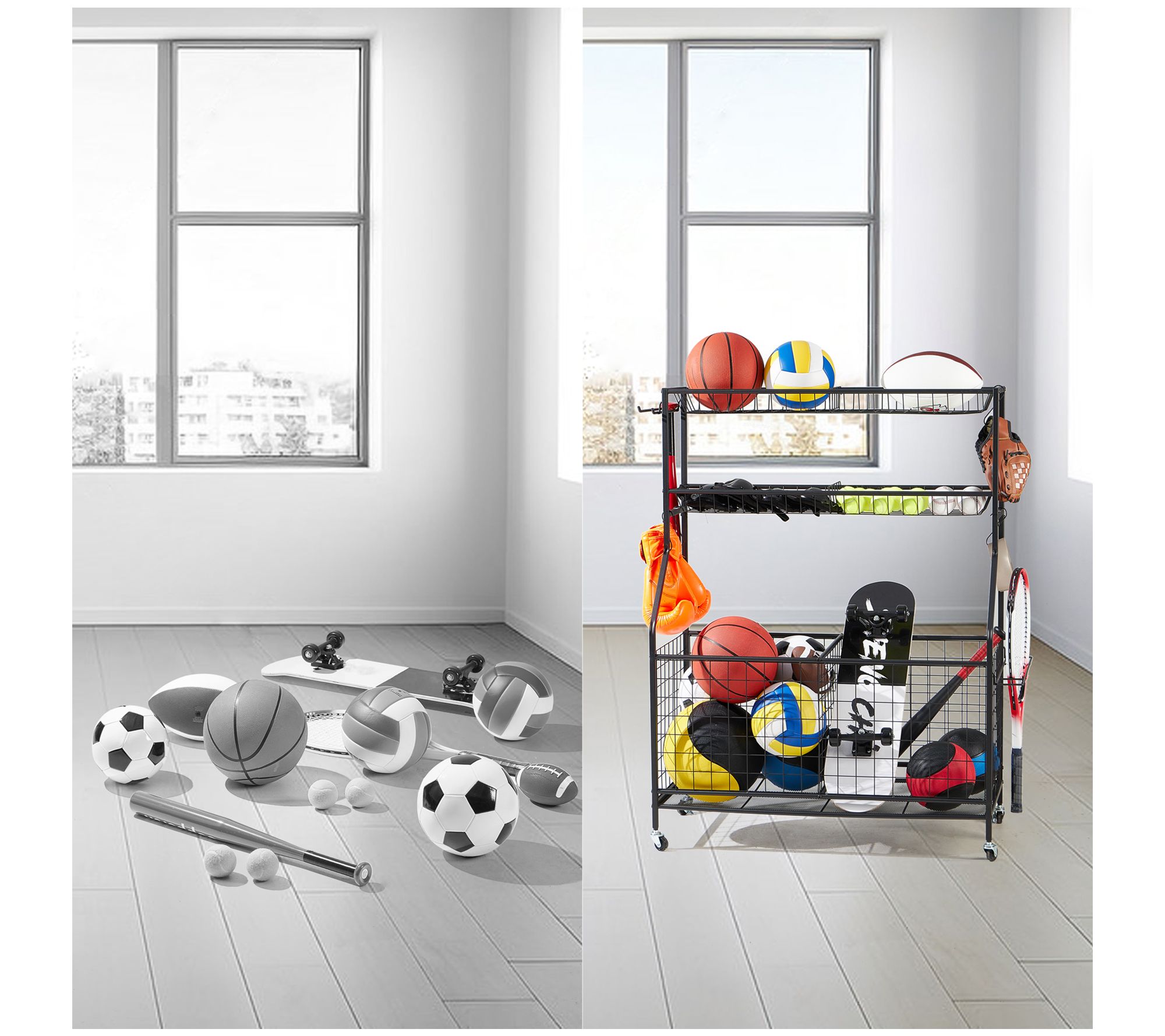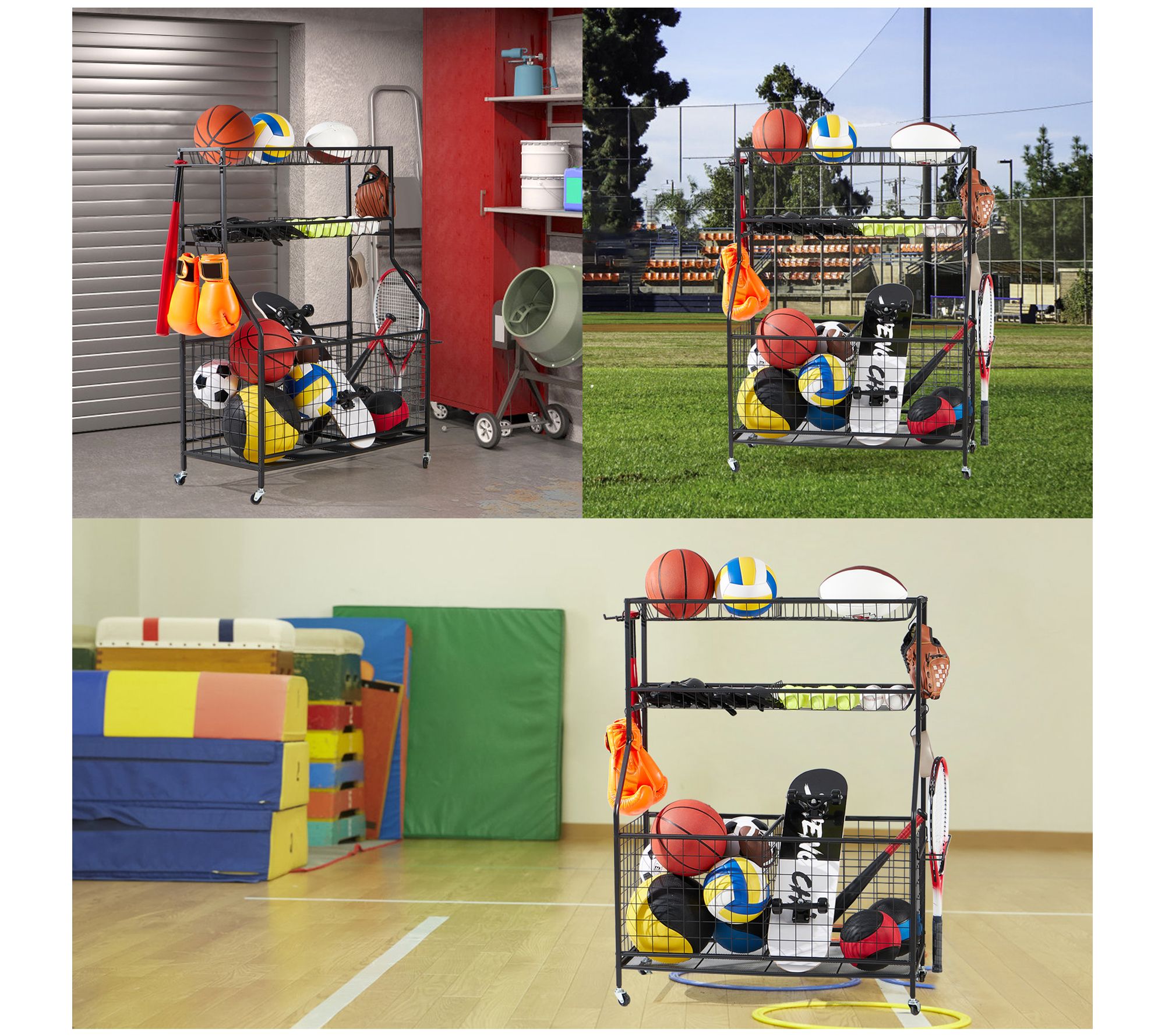 • Includes organizer set with panels, two baskets, bat organizer, racket organizer, hooks, four wheels, and screw kit