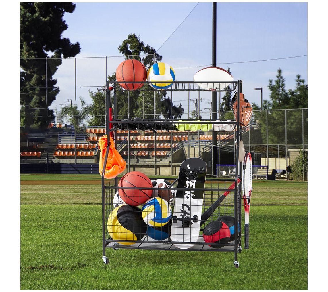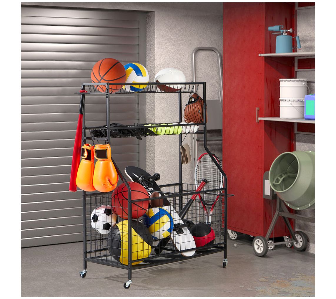 Transform your garage into a clutter-free zone with this sturdy sports equipment organizer. This robust rack is designed to neatly store all your athletic gear, from bats and rackets to balls and accessories, making it easier to find what you need when you need it. Equipped with lockable wheels, it offers both stability and mobility, ensuring your equipment is secure yet easily accessible. From LUGO.