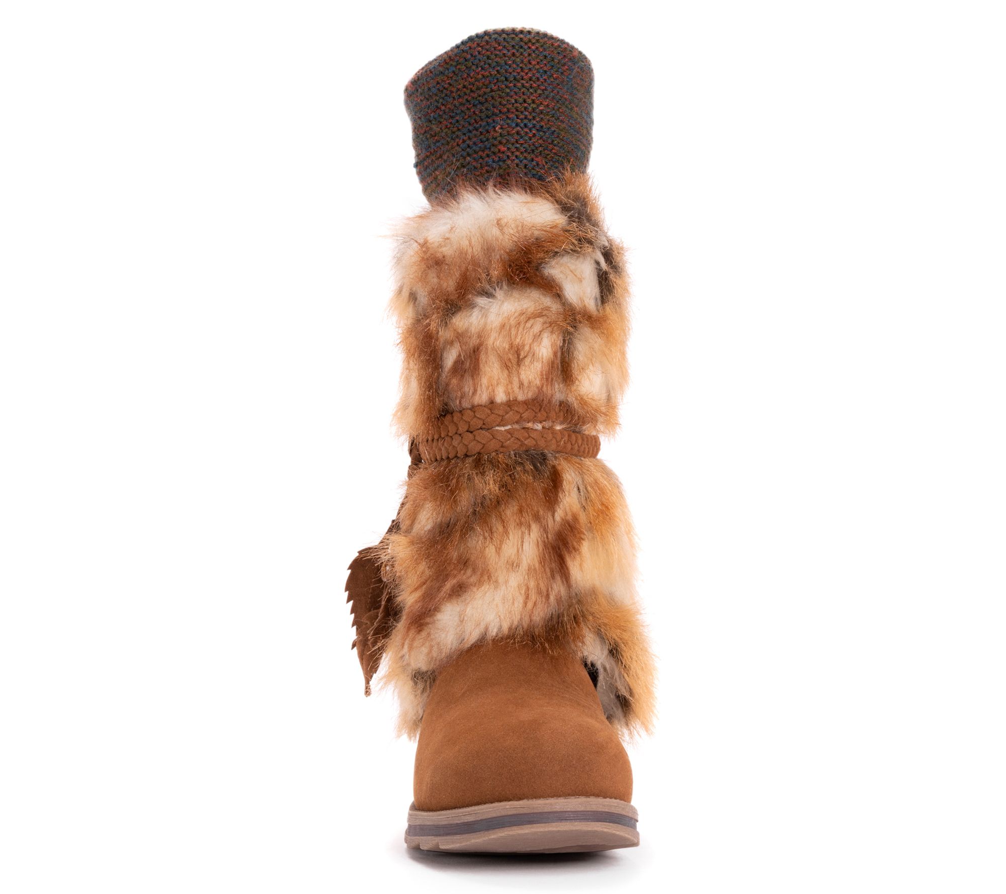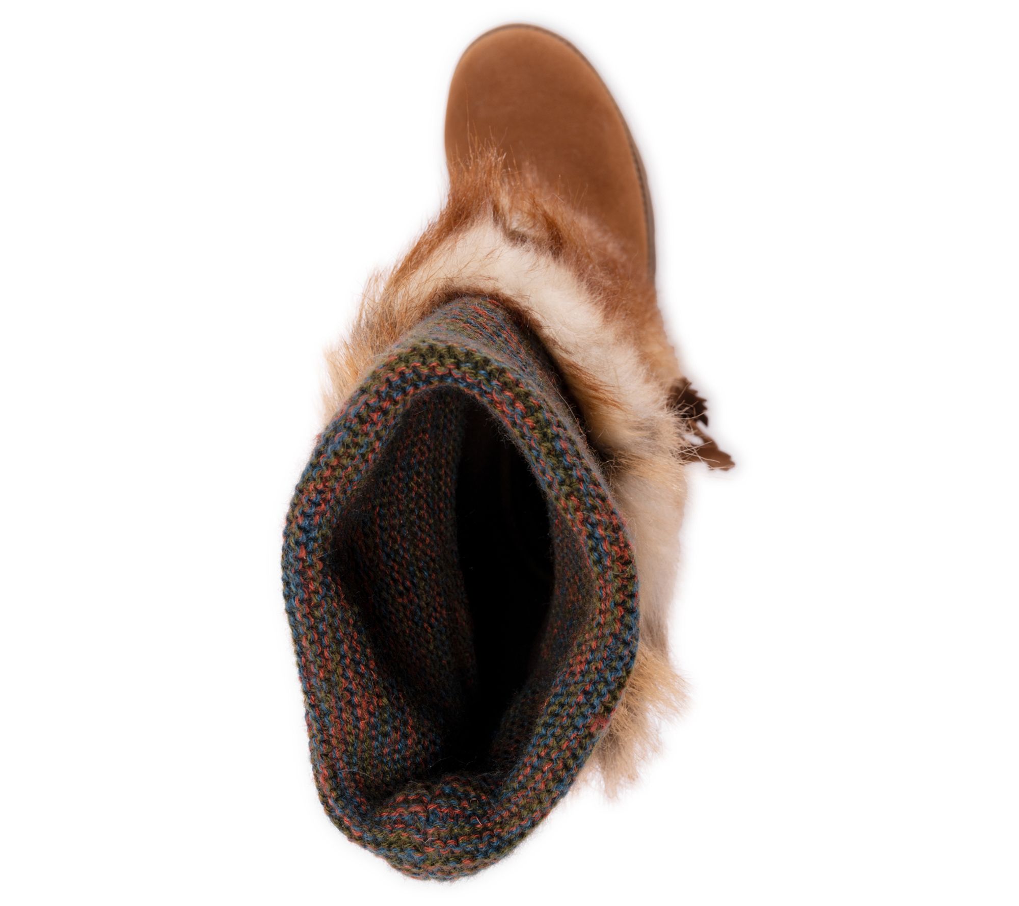 • Faux-fur shaft with knit collar, braided feather tassel detail, pull-on style