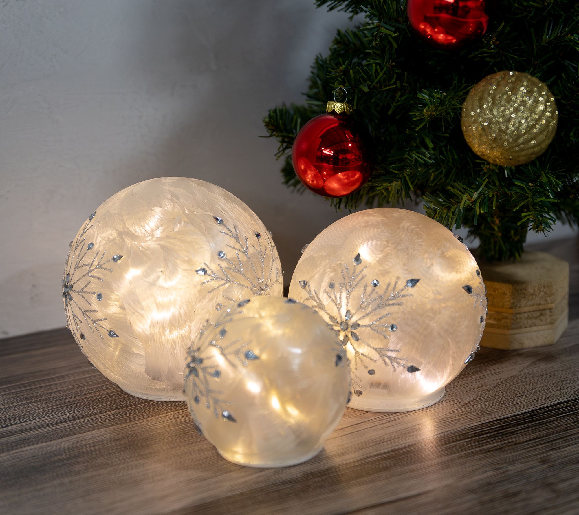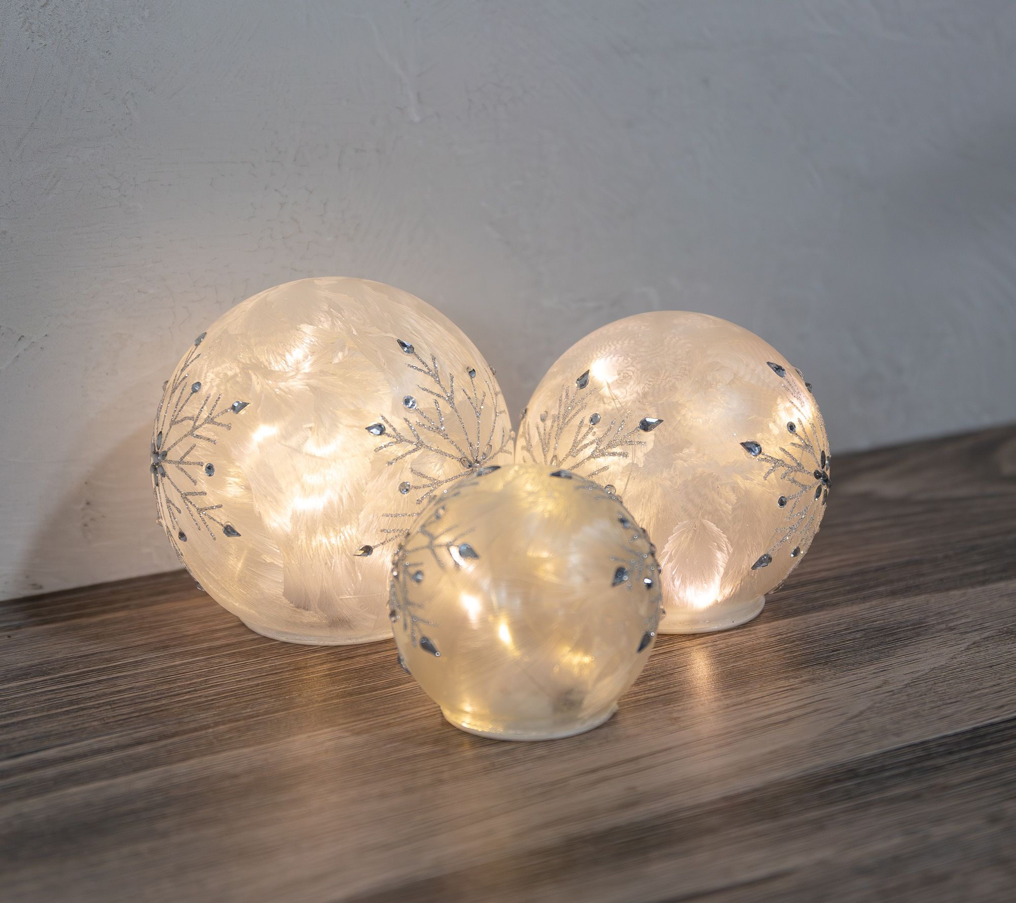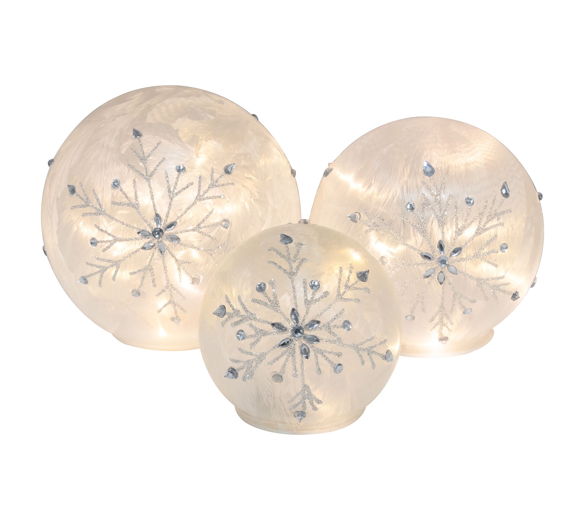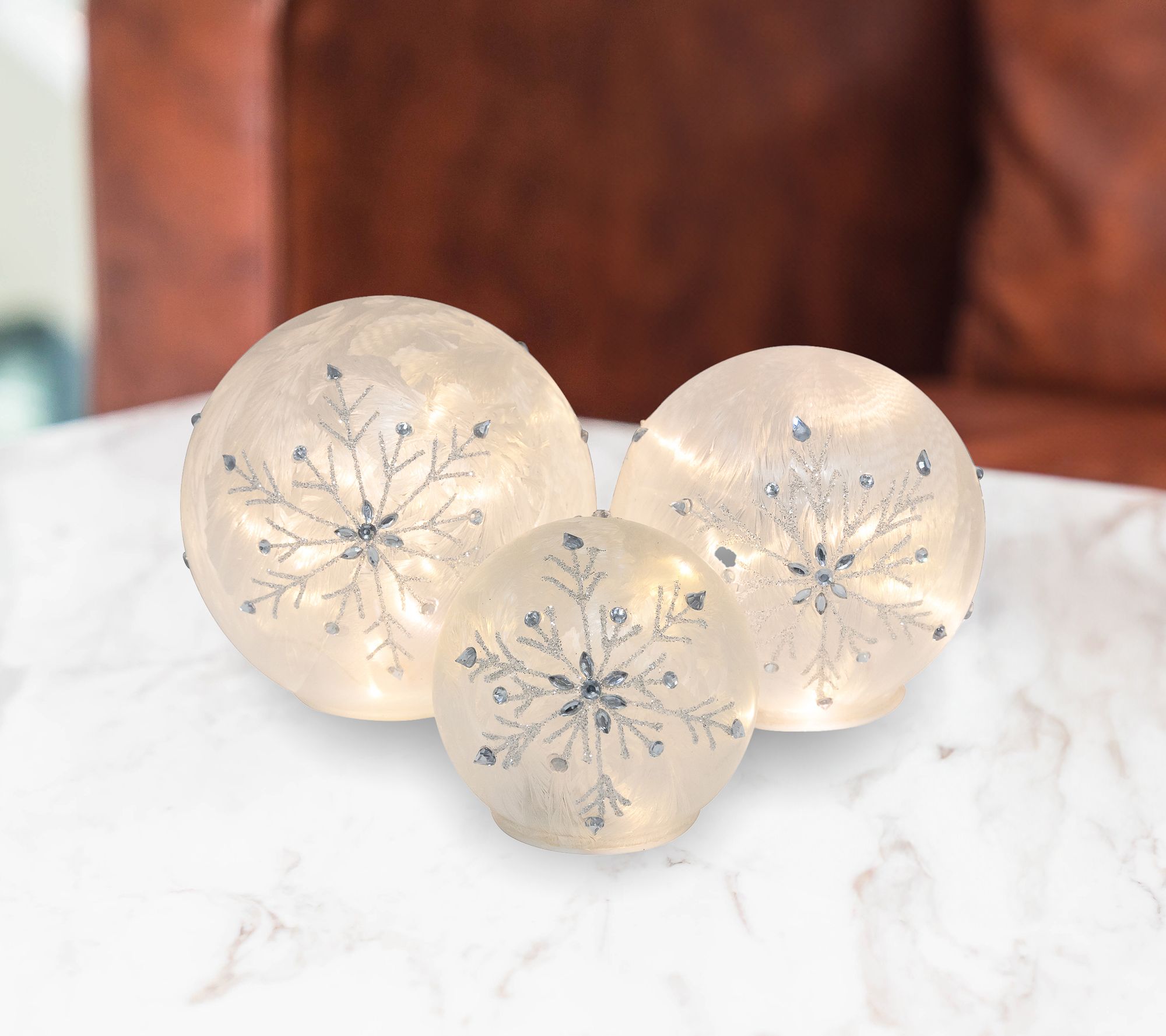 Add a touch of elegance to your holiday decor with this set of three battery-operated snowflake globes. These frosted glass globes, adorned with silvery snowflakes, are filled with soft white LED fairy lights to bring a warm glow to any room. From LumaBase.