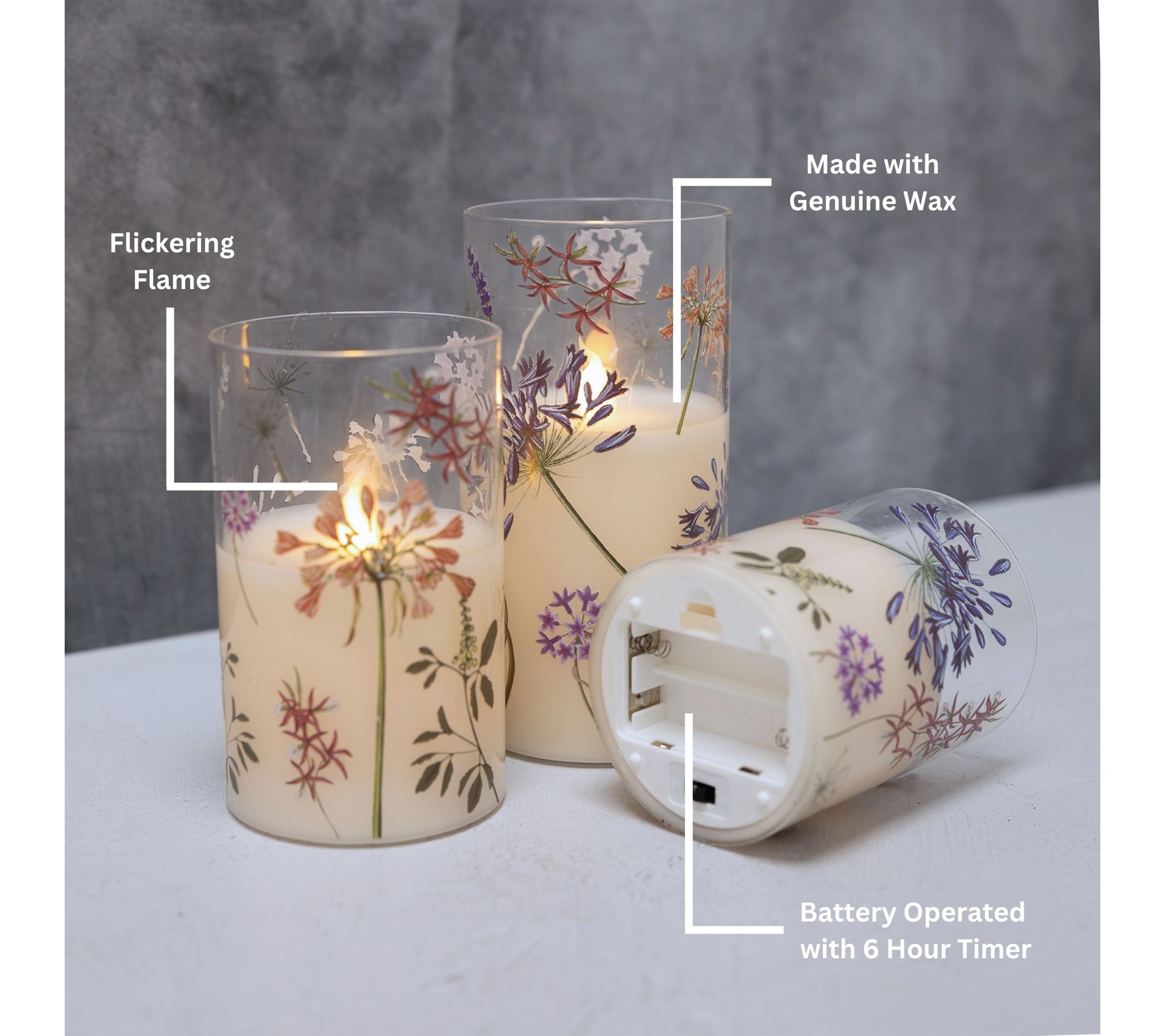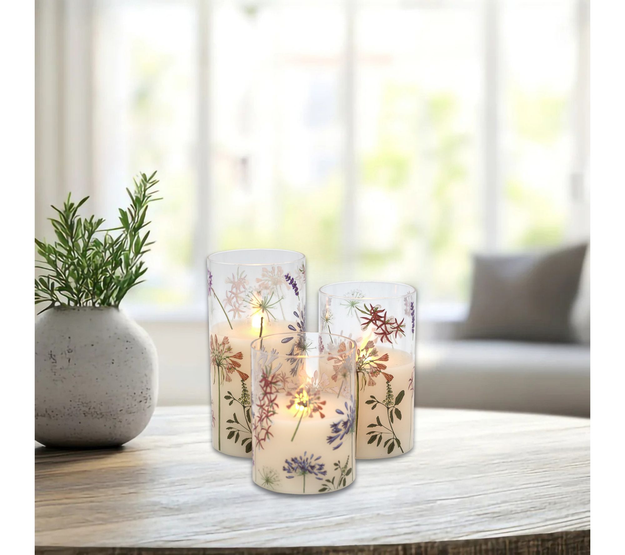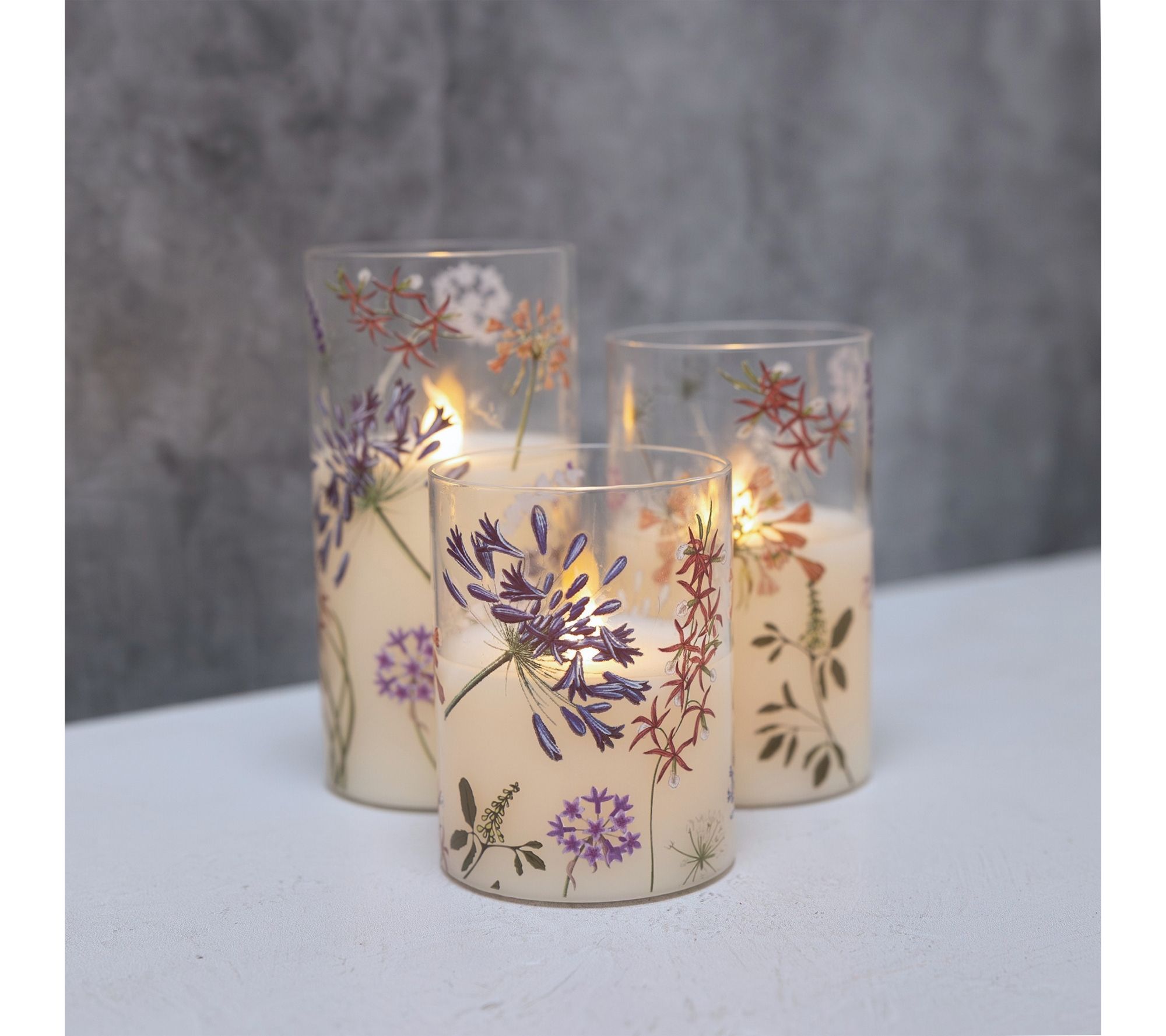 LumaBase Battery-Operated Glass Hurricanes w/Wildflower- Set 3