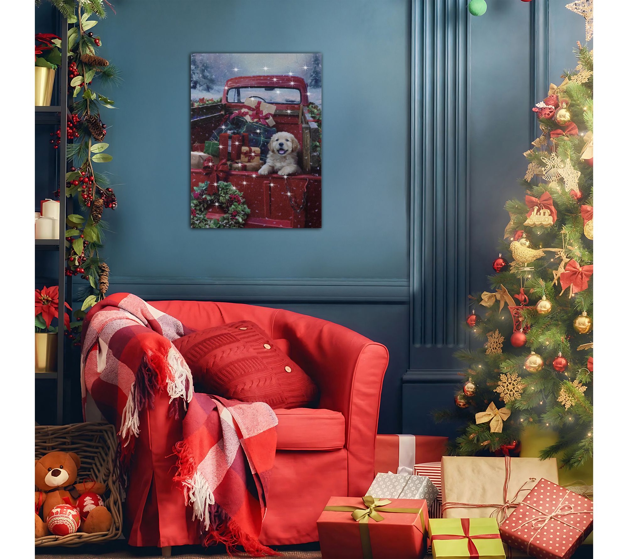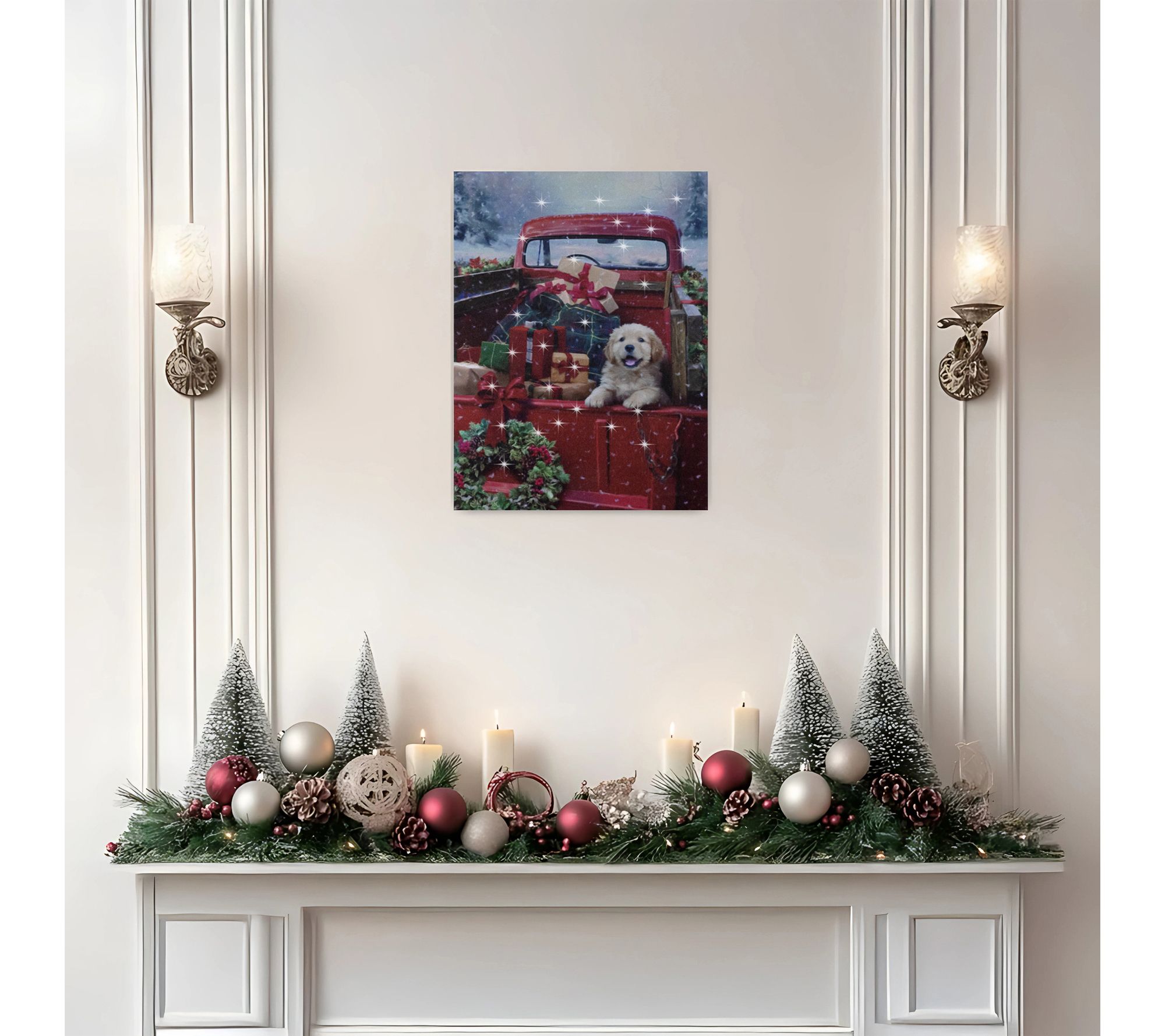 Brighten your holiday atmosphere with this battery-operated lighted wall art featuring a festive puppy amidst gifts and falling snow. Designed to add a heartwarming glow, this canvas beautifully transitions from a wall accent to a cheerful mantel piece, making family gatherings merrier with twinkling LED lights. From LumaBase.