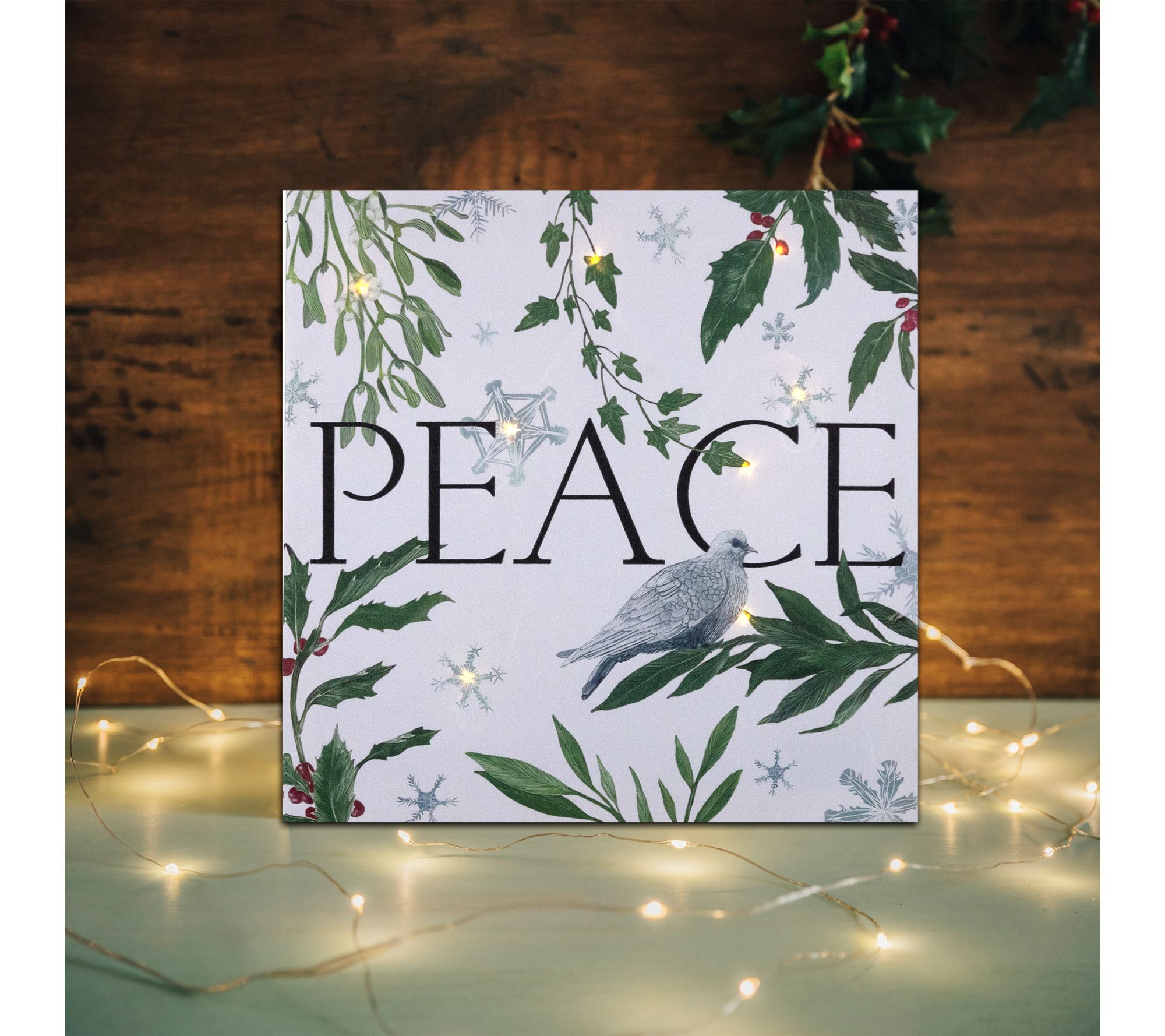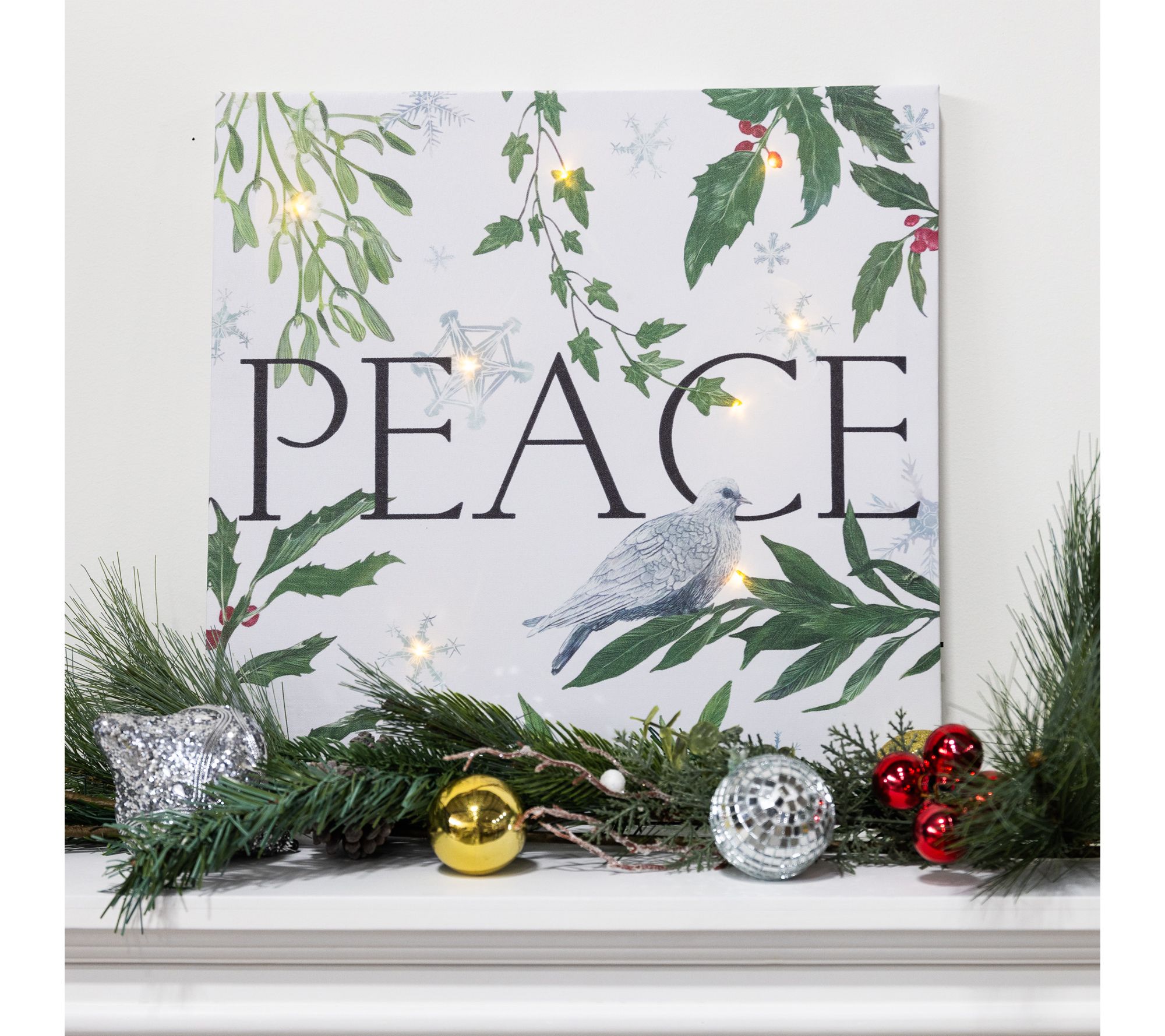• Showcases a white dove, greenery, snowflakes, and the word "PEACE"