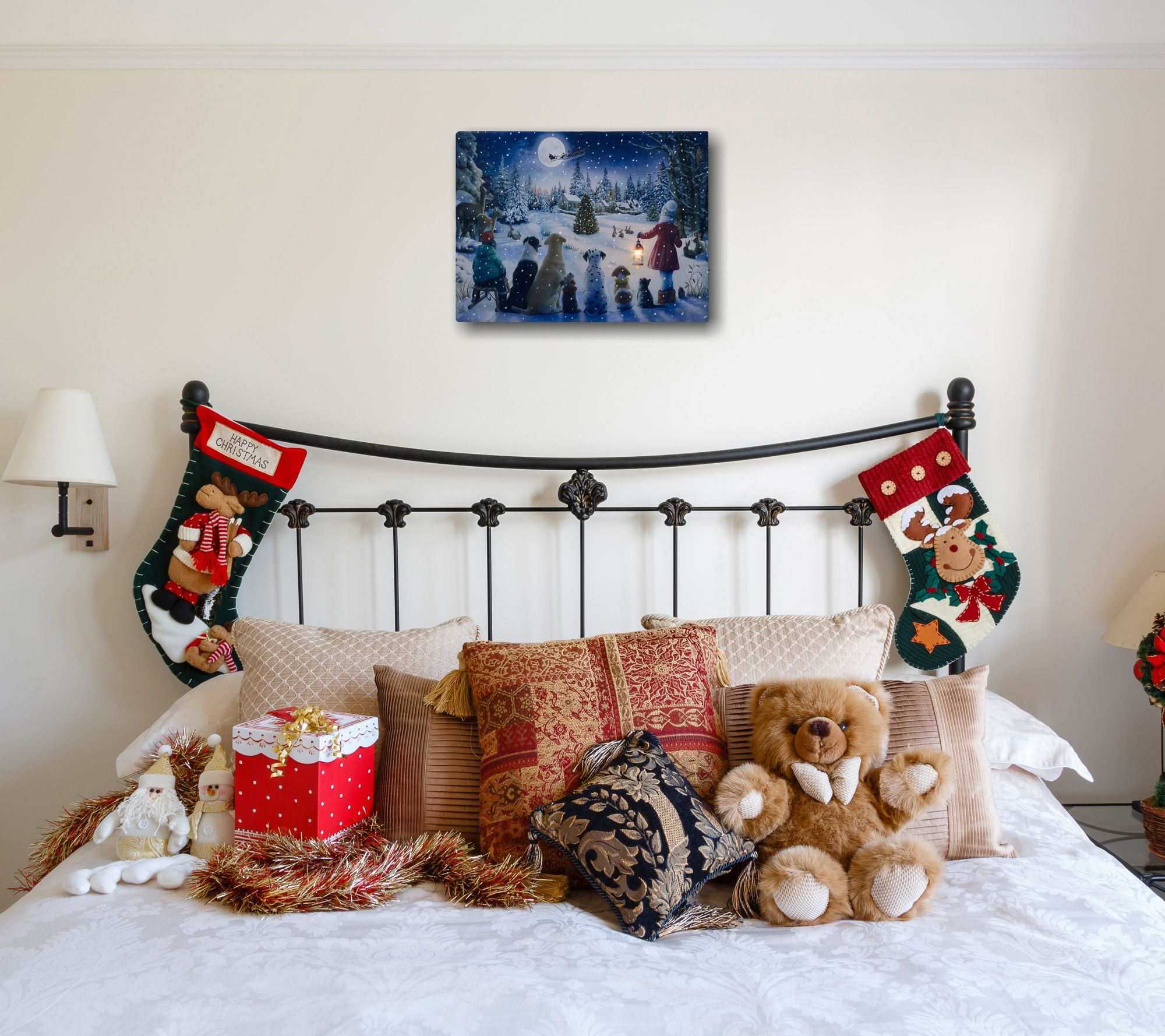 A peaceful holiday scene comes to life with this beautiful canvas, accented with sparkling LED lights. It comes complete with a remote control to make operation effortless. From LumaBase.