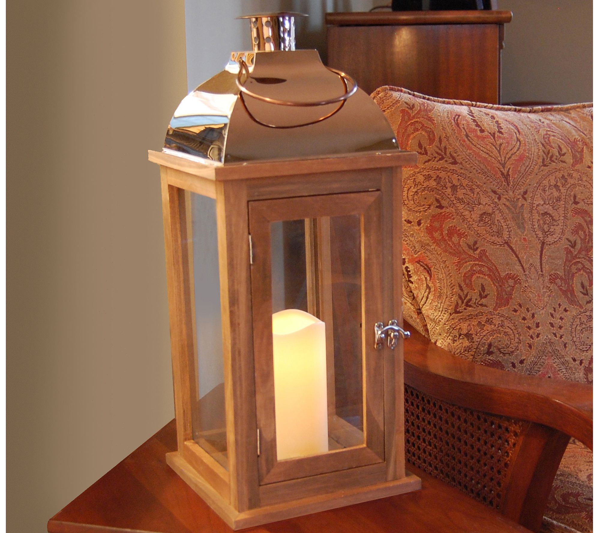 • Includes wooden lantern with coppertone metal roof and removable flameless candle