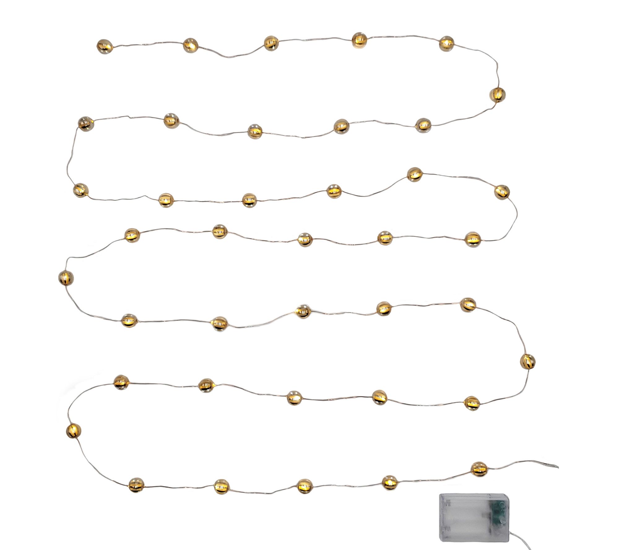 Warm up any gathering with the gentle glow of these LED mini string lights, featuring goldtone balls strung along a copper wire for added charm. Whether draped across a mantel or threaded through a floral centerpiece, their soft white illumination creates an inviting atmosphere indoors or outdoors. From LumaBase.
