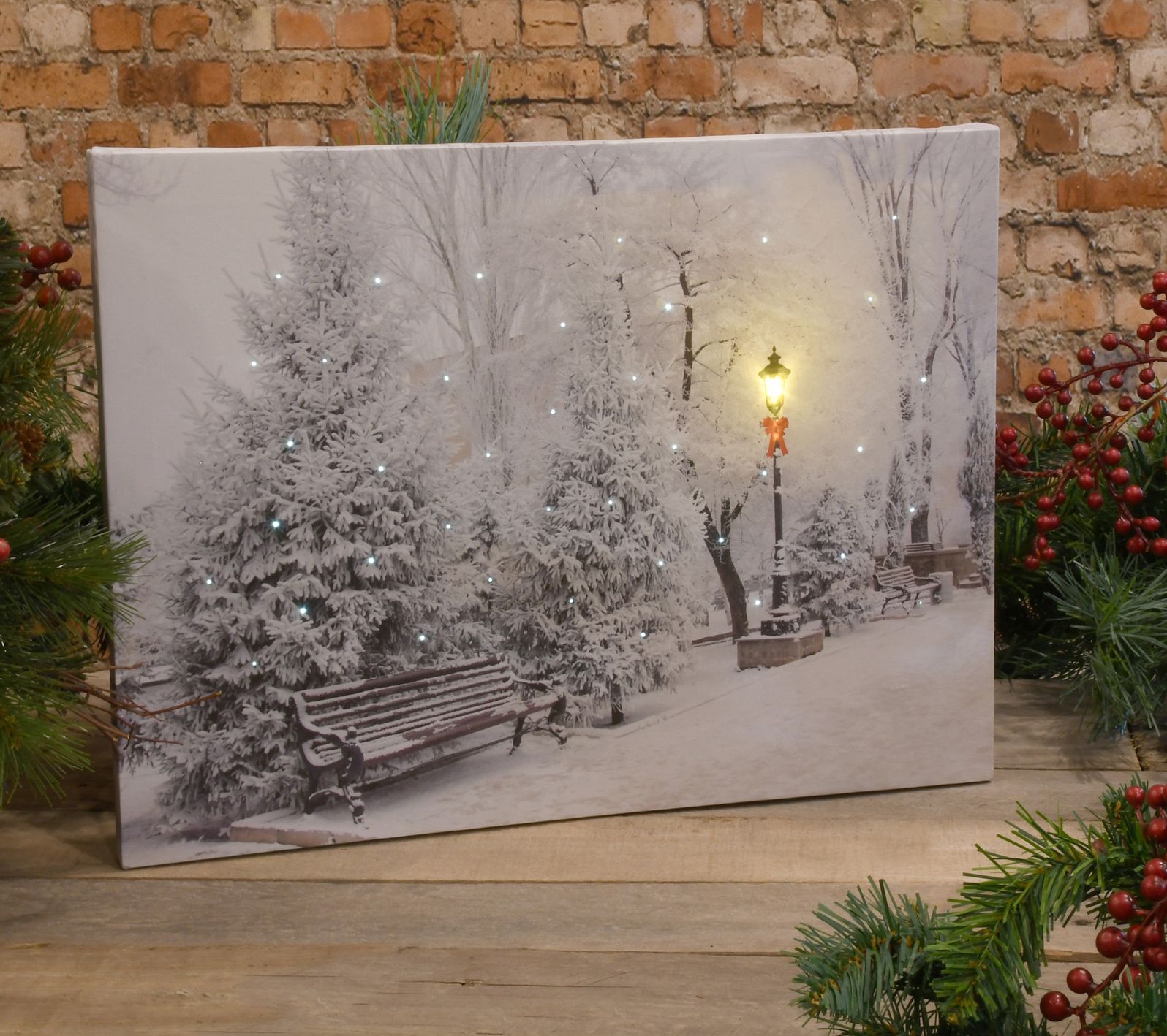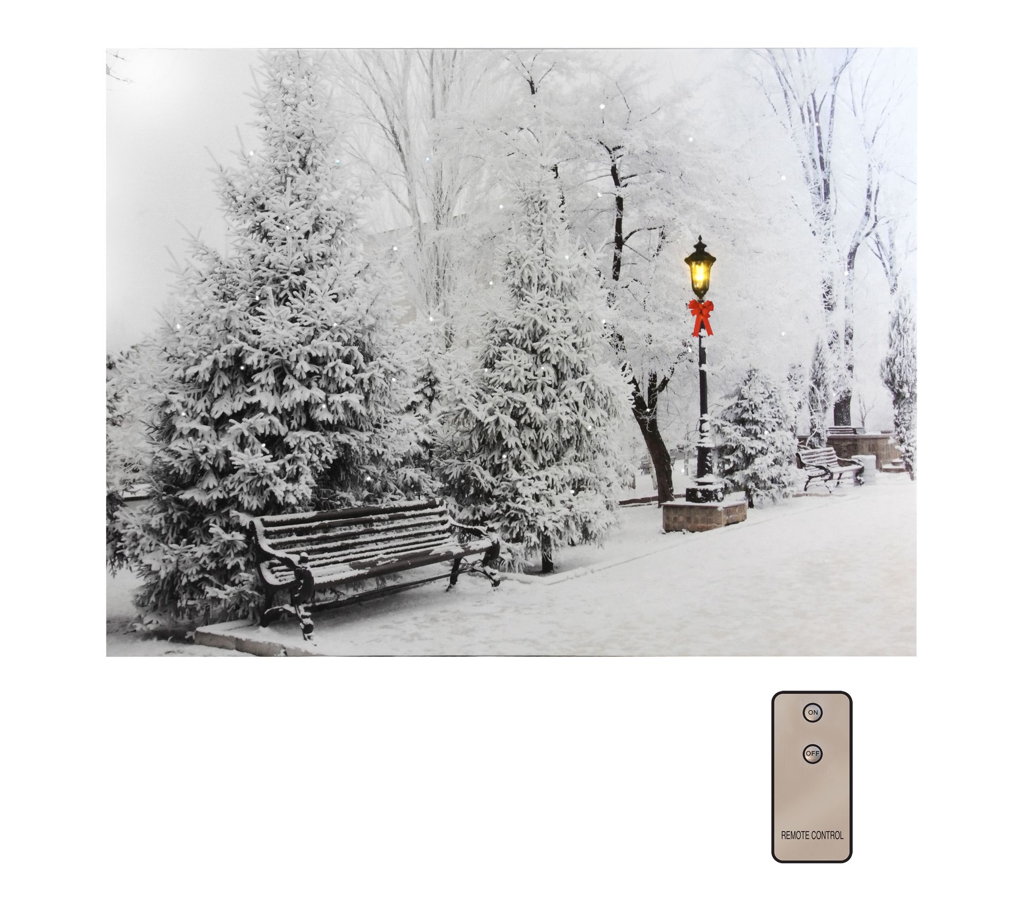 Twinkling, white LED lights add a special glow to this winter wonderland wall art, giving a peaceful, seasonal ambiance. It comes with a remote control. From LumaBase.