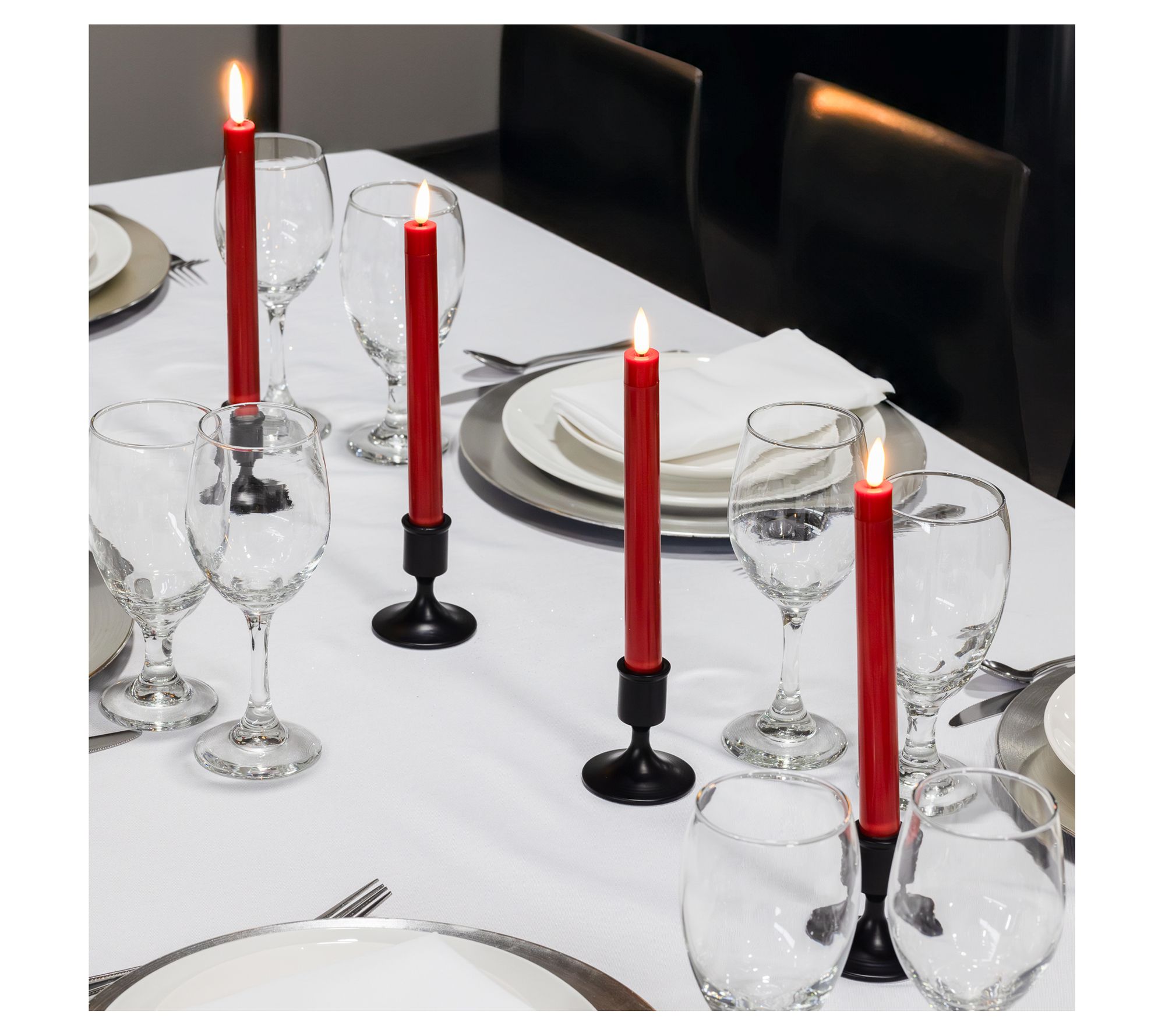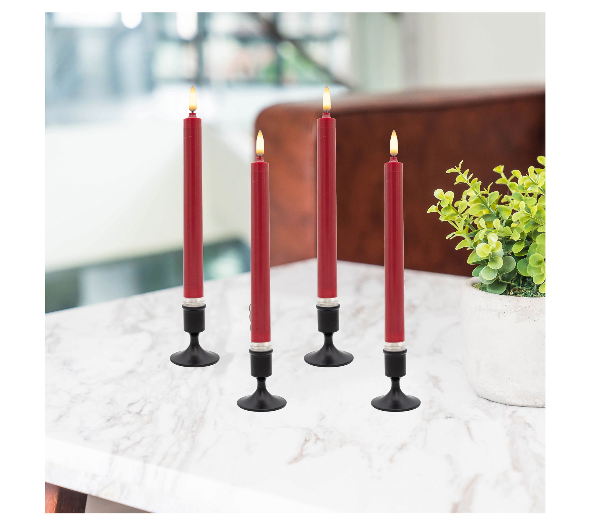 Add a touch of elegance to your home decor with these battery-operated flameless candles. Perfect for indoor or outdoor use, these red taper candles feature a realistic bullet flame and a convenient five-hour timer. From LumaBase.