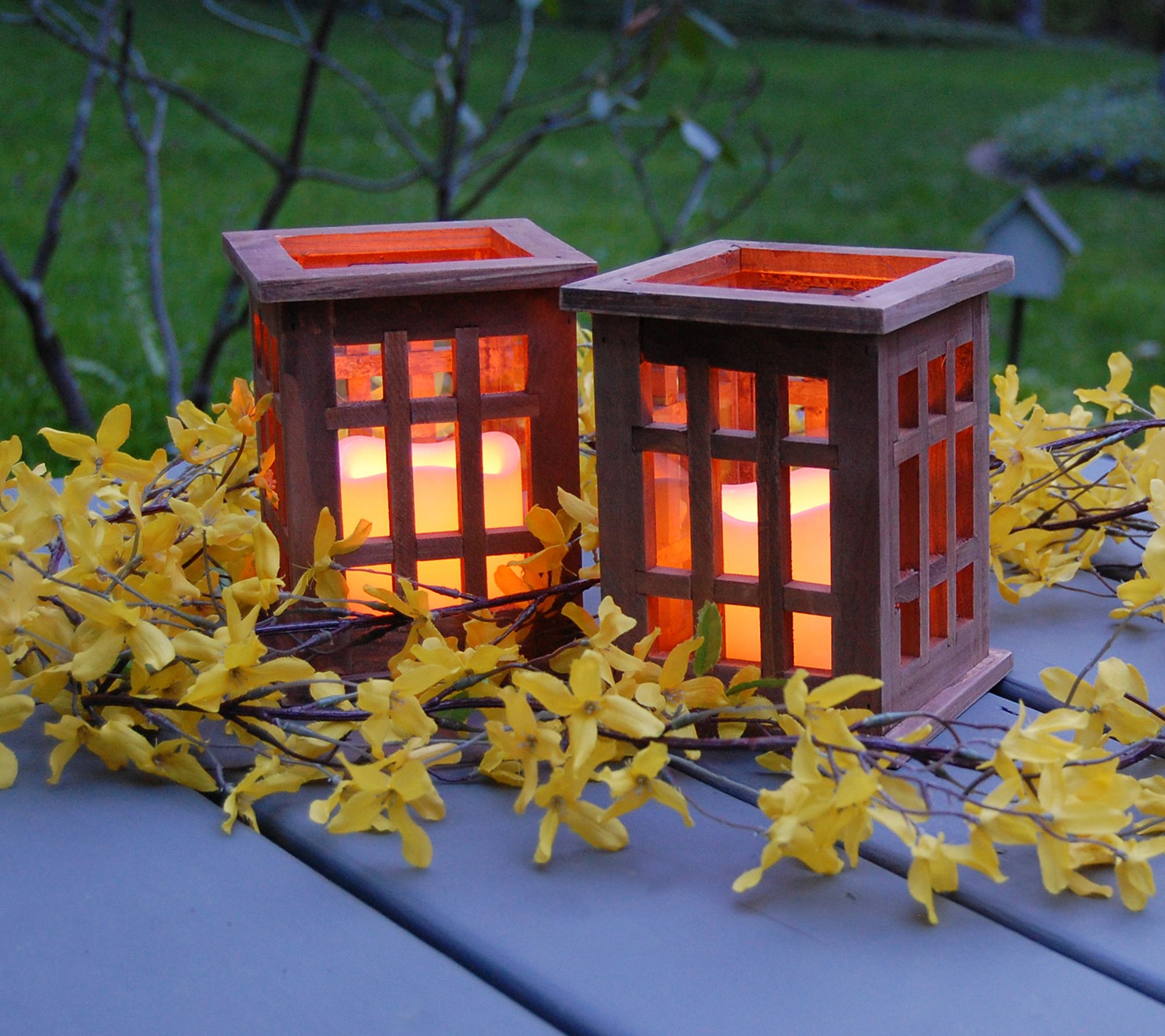 Invite a traditional feel to your special event, dinner party, or any space with this set of wooden lanterns featuring glass sides and a flickering, amber-glow flameless LED candle for a long-lasting light. From LumaBase.