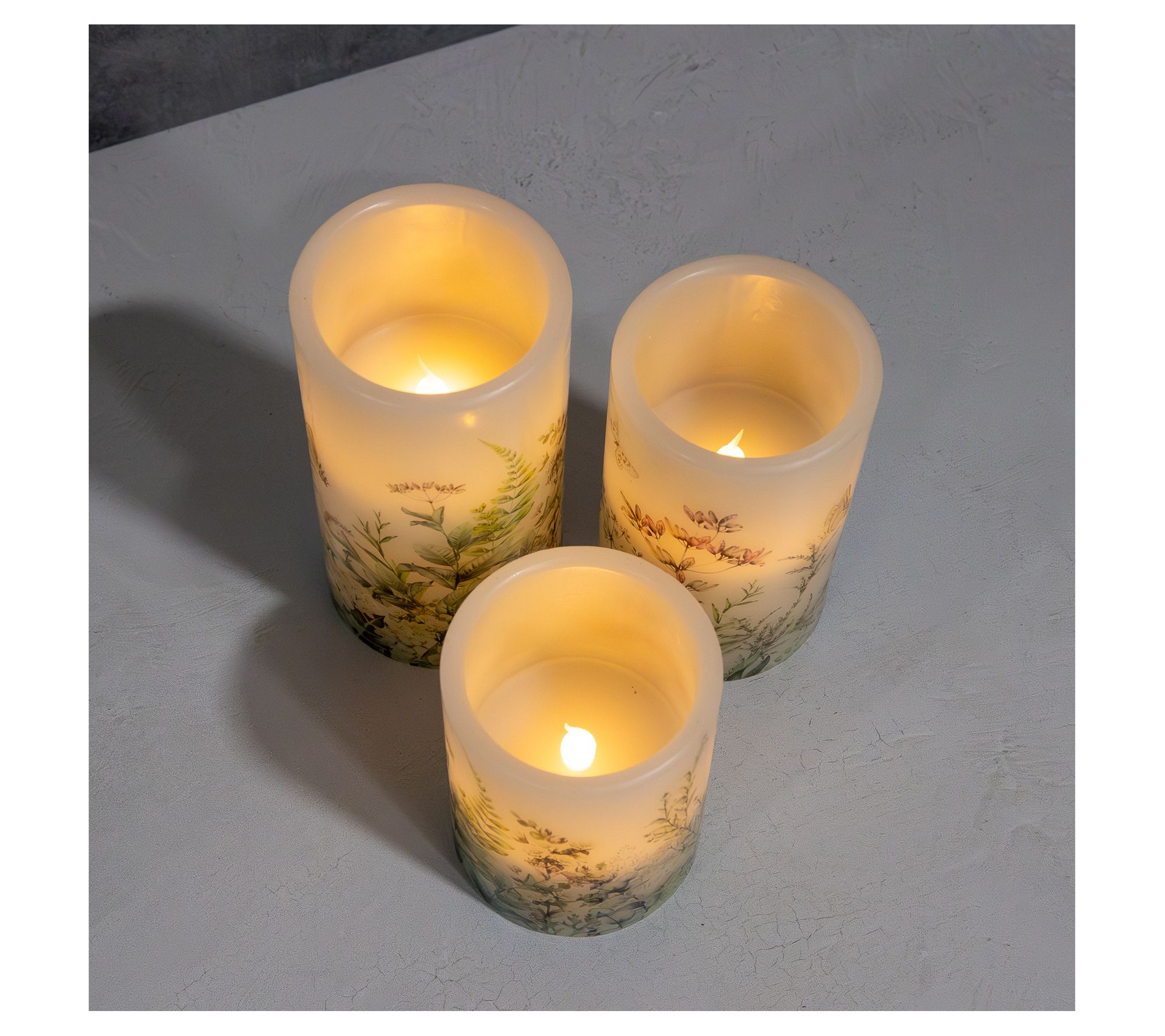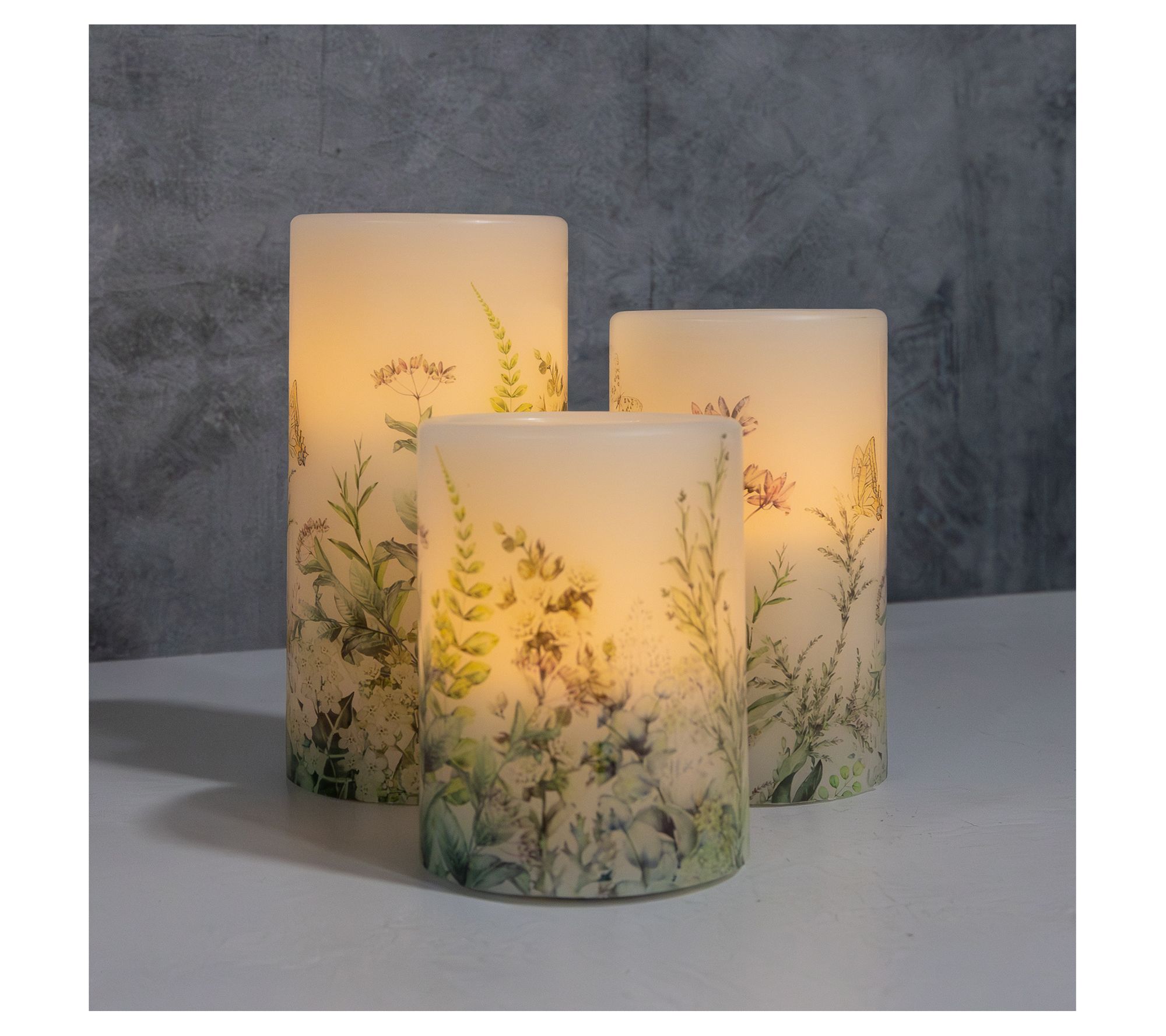 Illuminate your space effortlessly with the Lumabase Set of 3 Flameless Floral Pillars. These elegant candles offer a warm, flickering amber LED light set in wax with a beautiful floral design, perfect for creating a cozy ambiance indoors. From Lumabase.