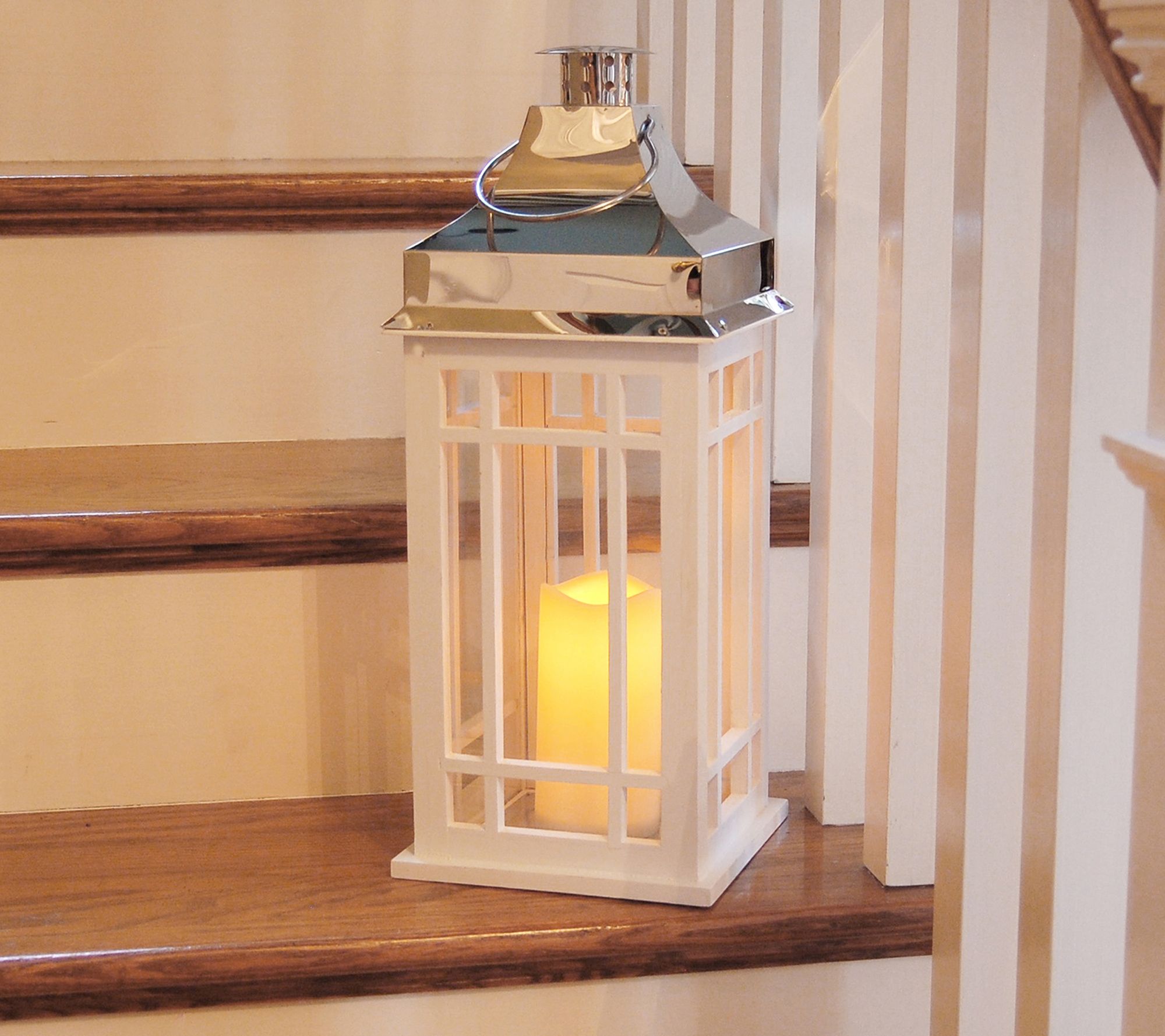 LumaBase White Wood & Chrome Lantern with Flameless Candle