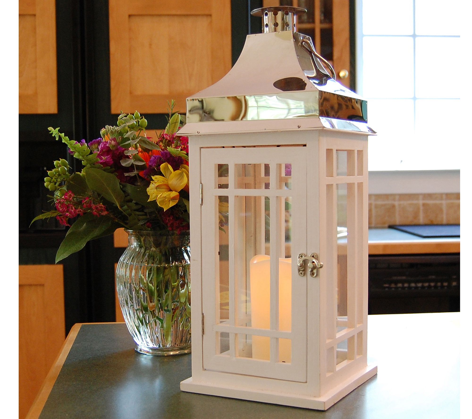 • Includes white lantern with chrome metal roof and removable flameless candle