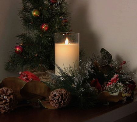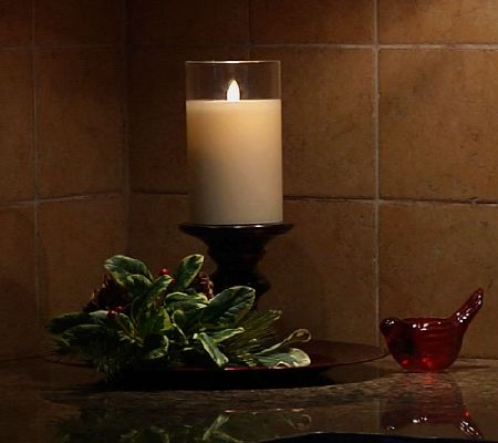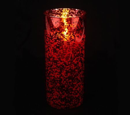 A friendly feel, without the flame. This mercury glass hurricane candle from Luminara gives off a realistic, inviting warm glow. The candle is surrounded by a 6" mercury-treated glass cylinder for a lovely look even when it's not lit. From Luminara.