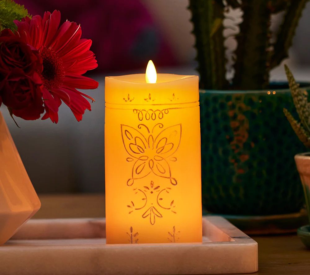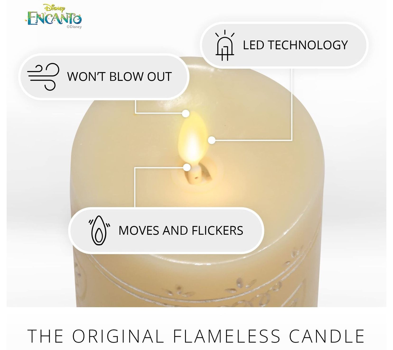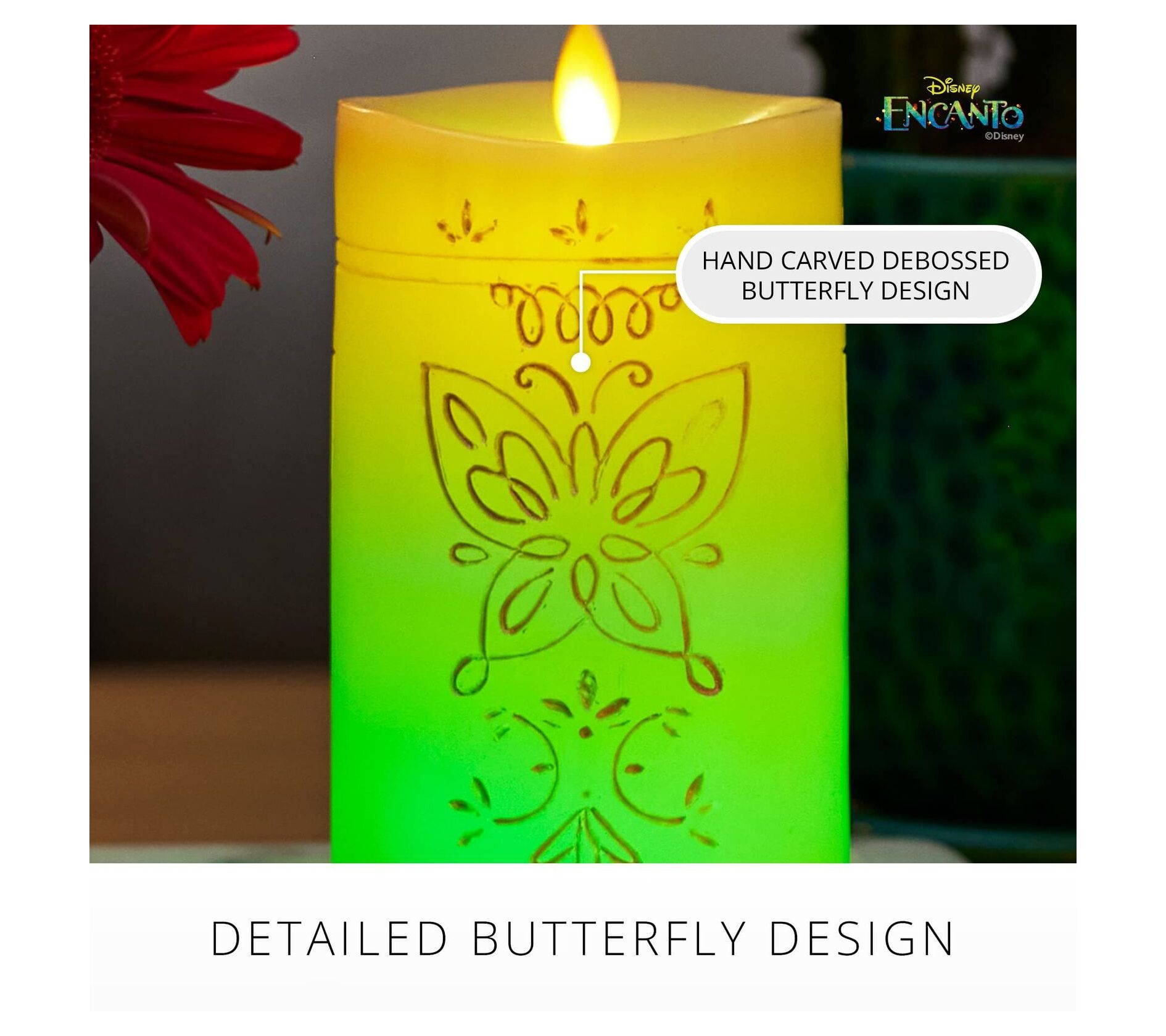 Bring the wonder of Encanto into your home with this beautiful flameless pillar candle, featuring a debossed butterfly accent and a color-changing faux flame that adds a touch of magic to your space. From Luminara.