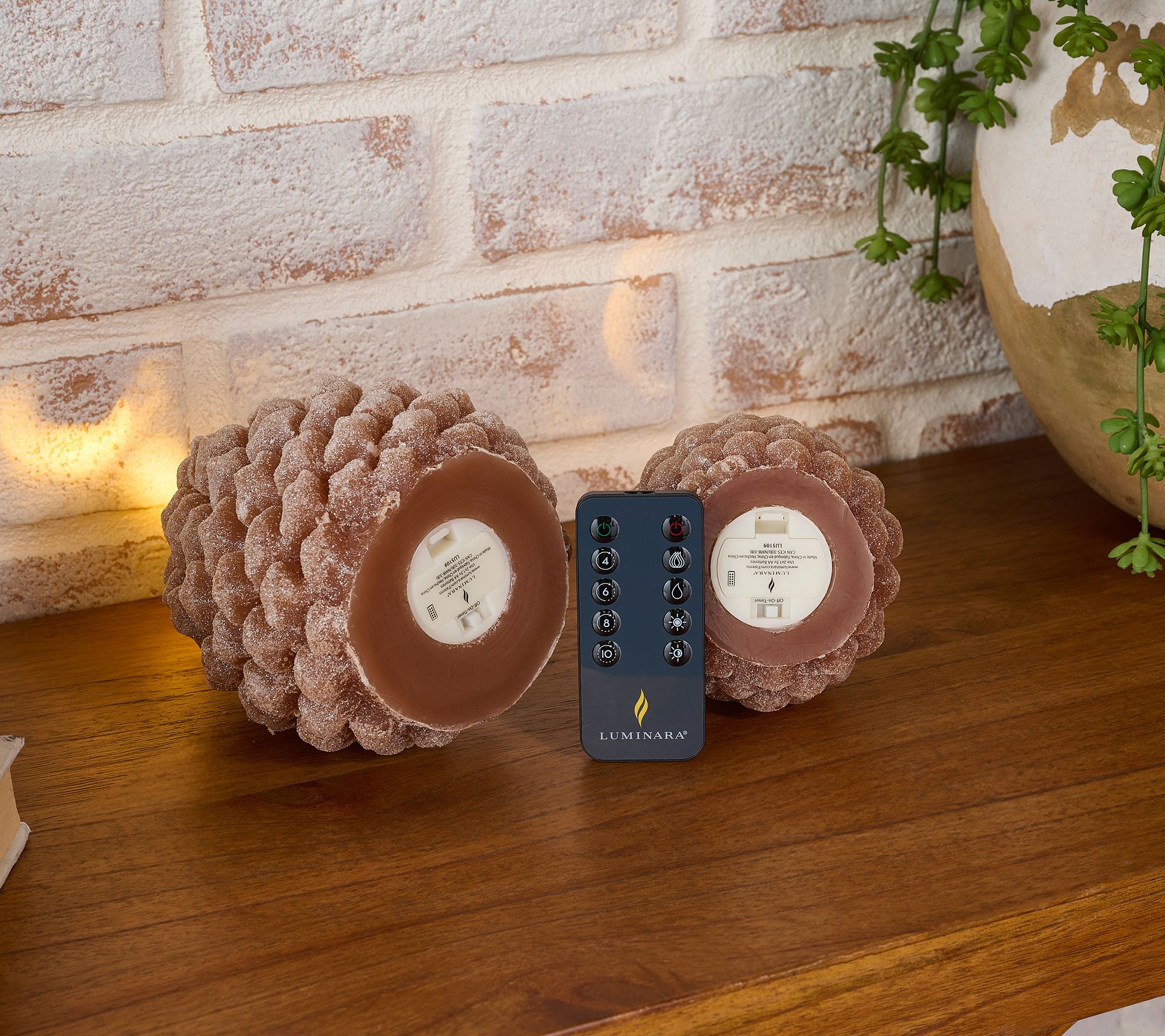 Wake up your home with the woodland style of these flameless candles. The earthy elegance of the pinecone design is elevated with a cozy glow and a touch of glitter. From Luminara.
