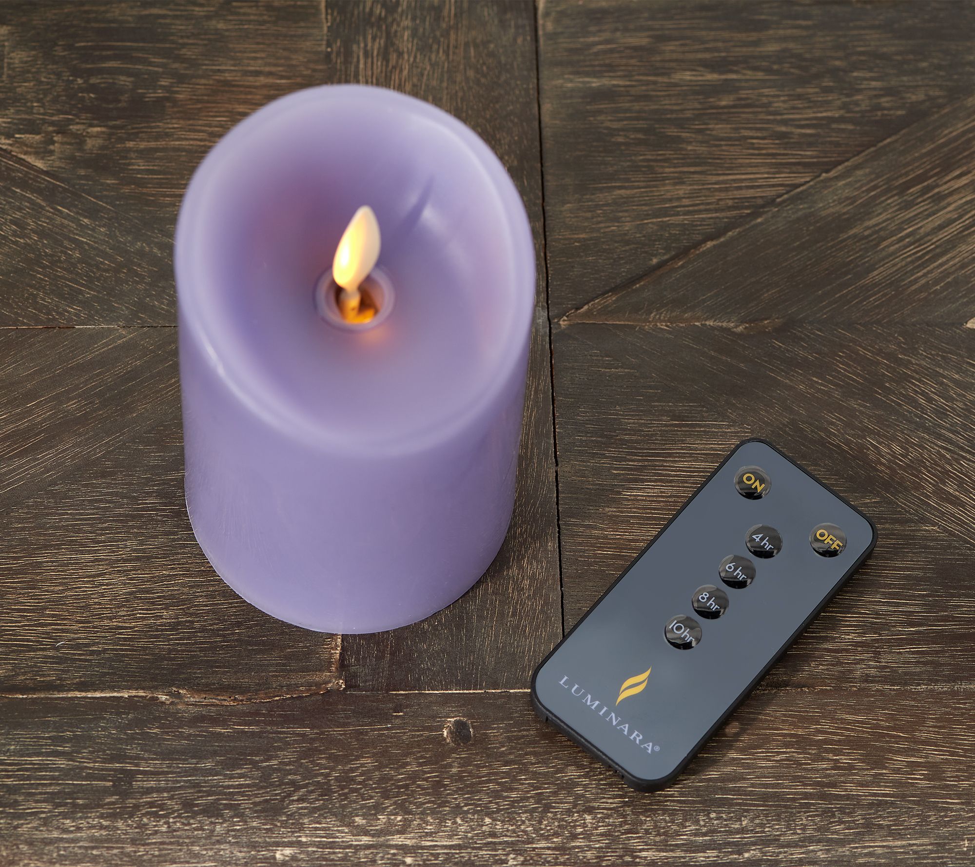 Includes three flameless candle pillars, remote with built-in battery, and gift box