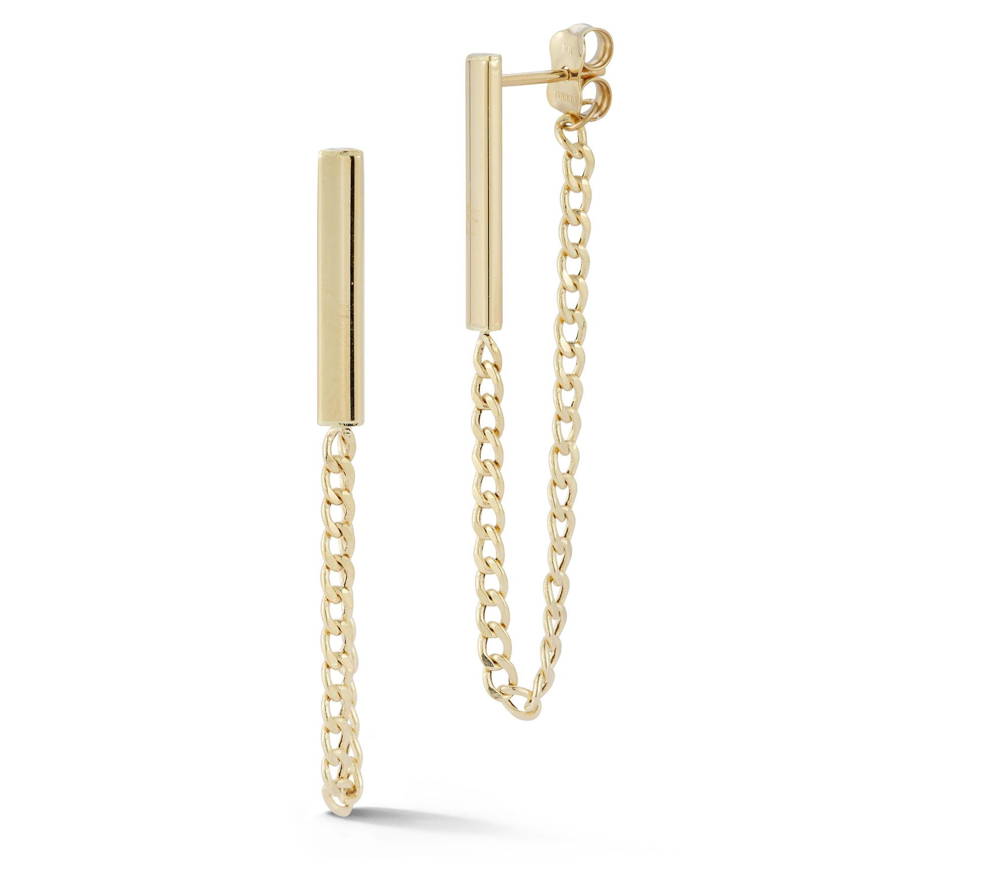 Elevate your everyday style with these dangling earrings featuring a sleek design that combines the elegance of a thin bar with the modern flair of a curb chain. Crafted in radiant 14K gold, these earrings are a testament to simplicity and sophistication, perfect for adding a touch of luxury to any outfit. From Luminosa.