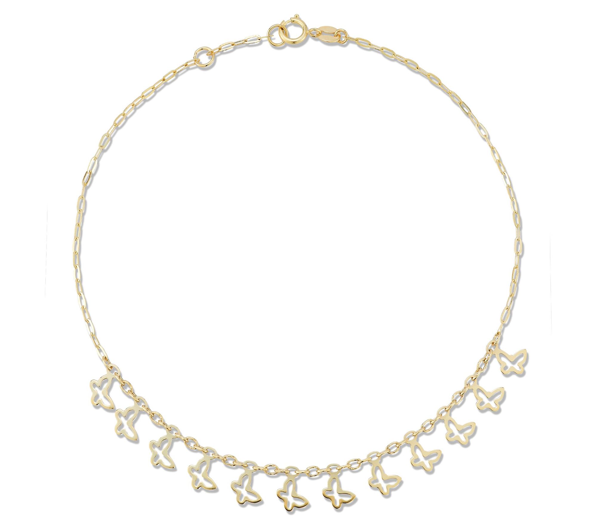 Add a touch of whimsy to your look with this dainty chain ankle bracelet. This charming piece features openwork butterfly charms that dance delicately around your ankle, crafted in radiant 14K gold. It's a delightful accessory that brings a playful yet elegant flair to any outfit. From Luminosa.