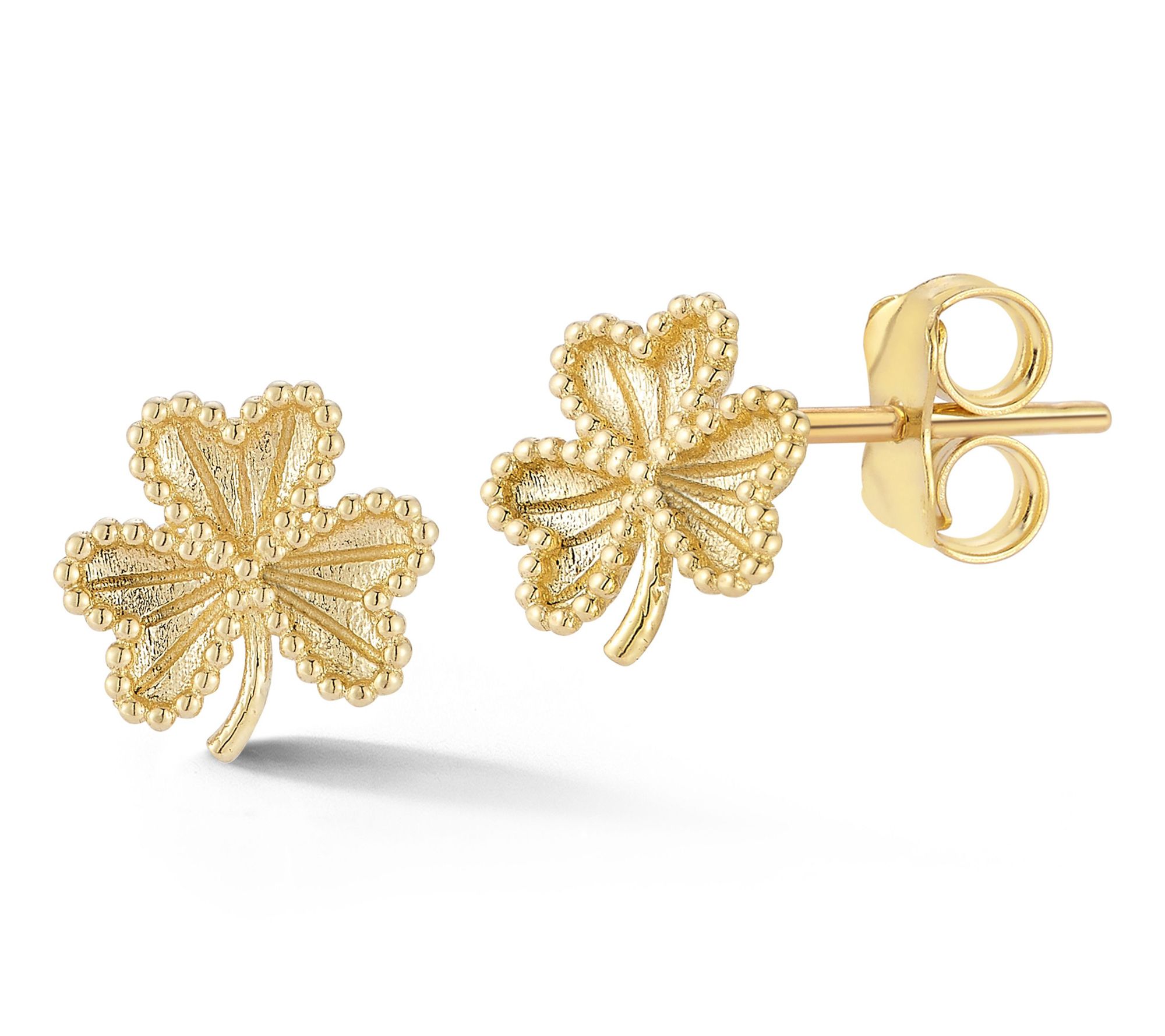 Just your luck! These charming 14K gold studs showcase a three-leaf clover design with a beaded outline and concave textured leaves, offering a unique and elegant flair. From Luminosa.