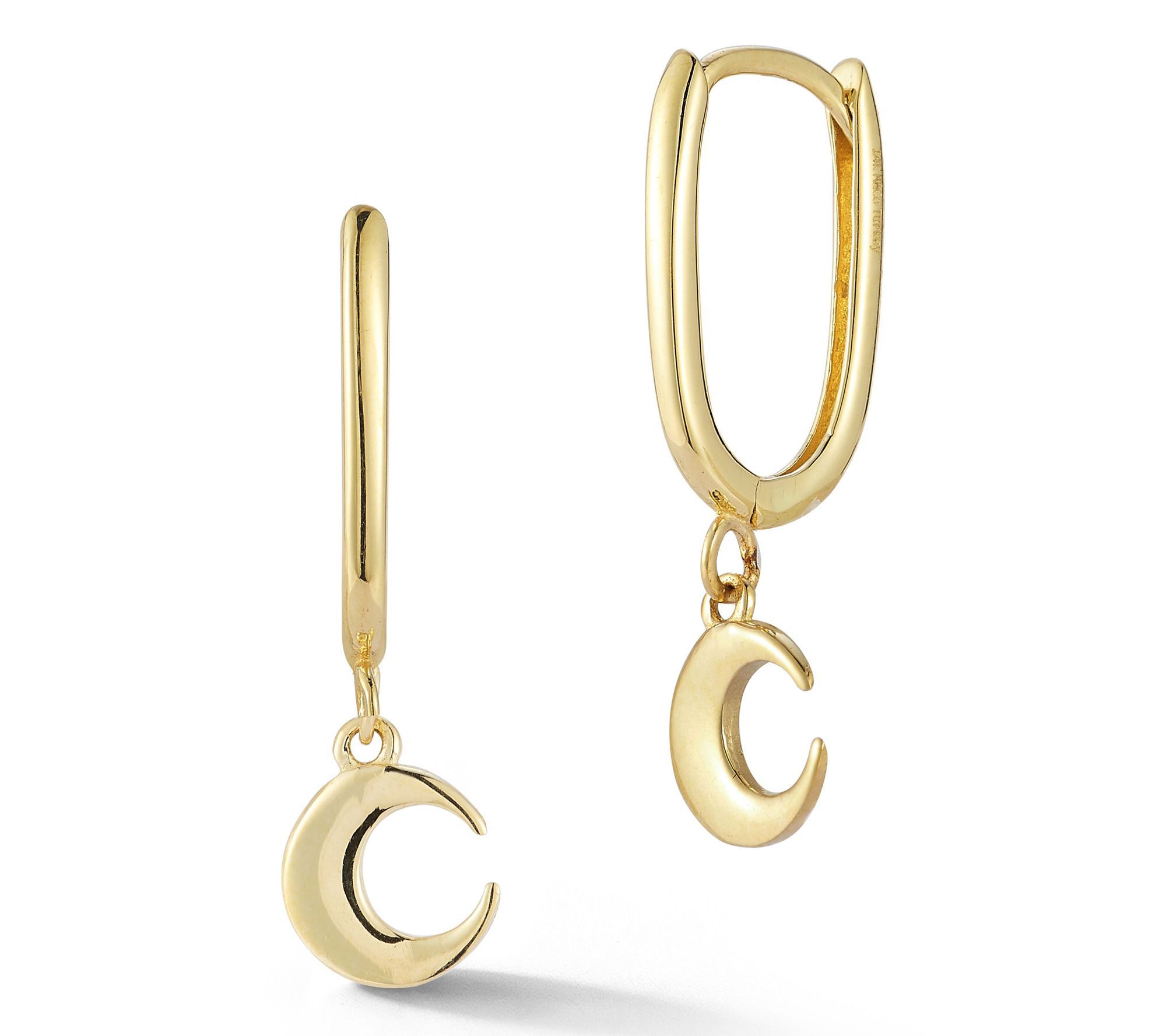 Huggie hoops: whimsy edition! Add a celestial vibe to your jewelry collection with these dainty crescent moon charm earrings. From Luminosa Gold.