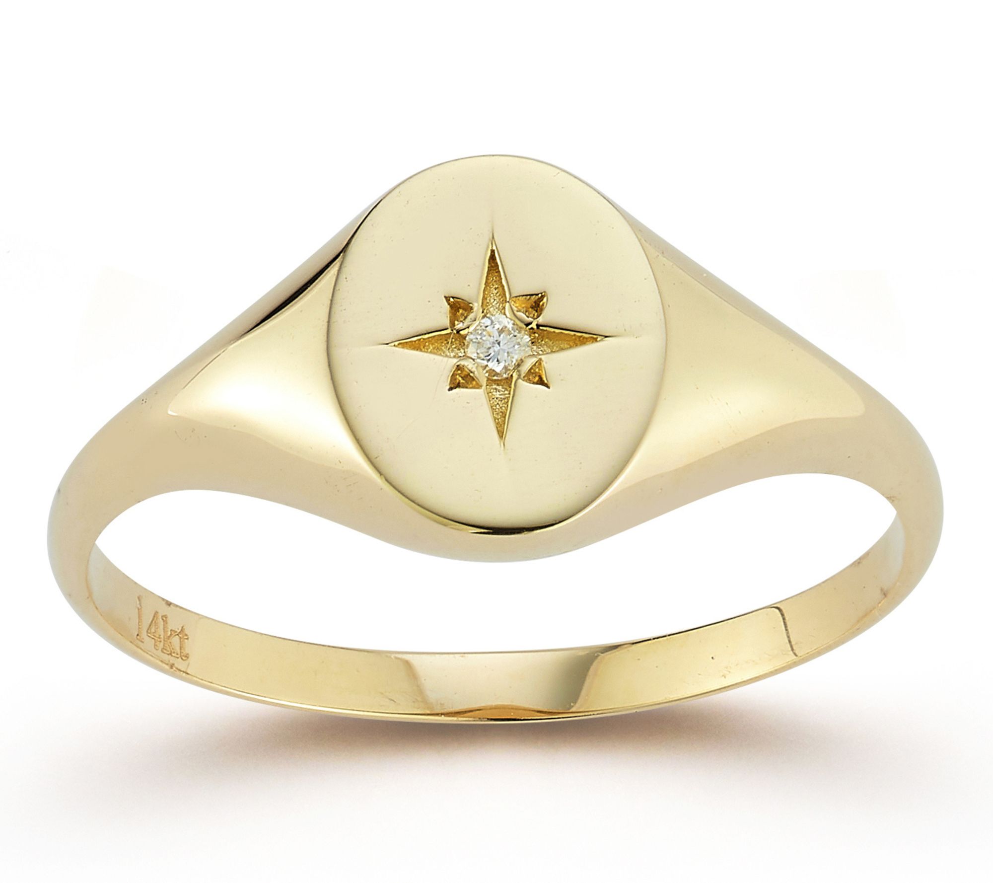 Oval signet design with round, prong-set diamond accent at center