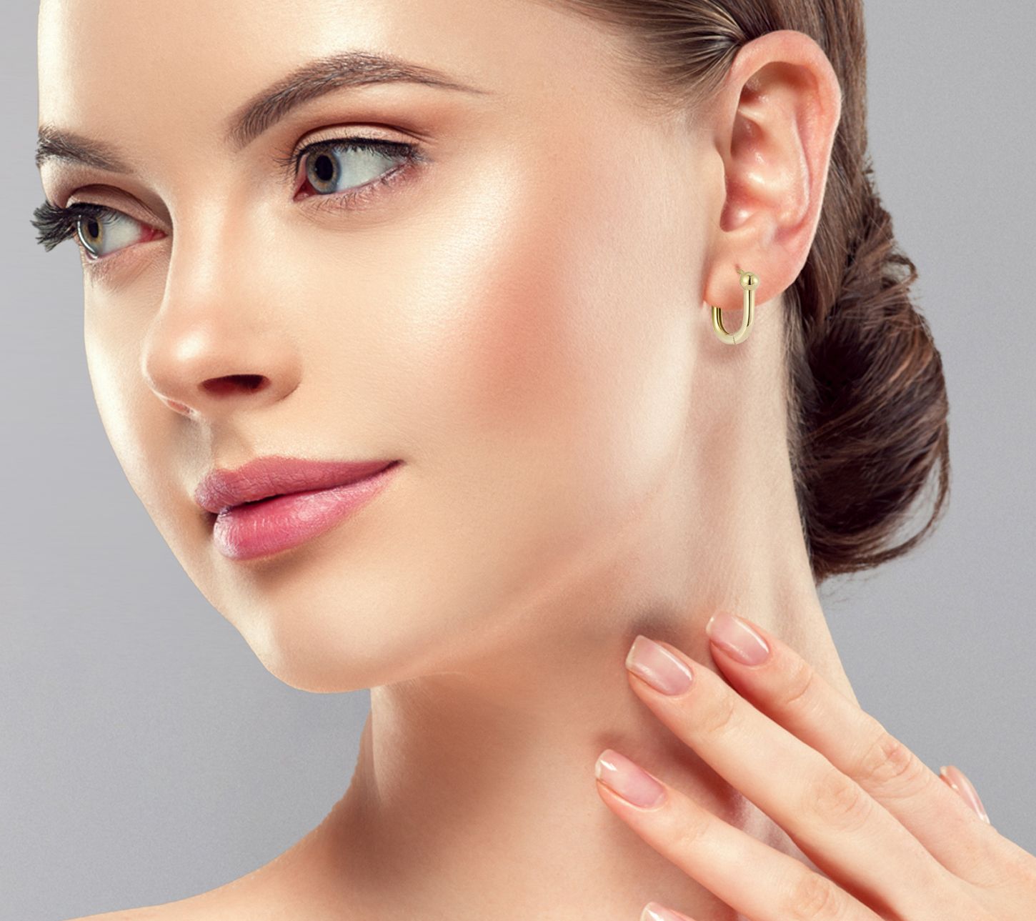 • Oval-shaped huggie hoop earrings with two ball accents on the tops