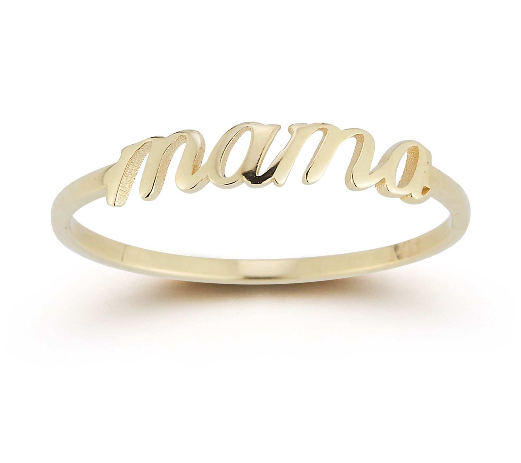 Oh, mama! This shiny script ring makes a pretty push present, gift for a new parent, or way to honor your fabulous self. From Luminosa Gold.