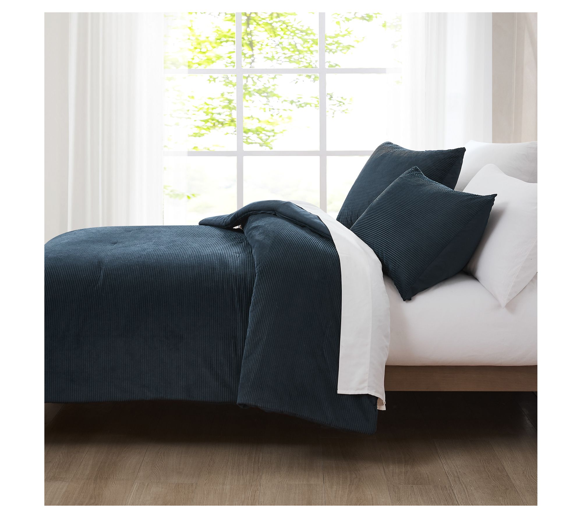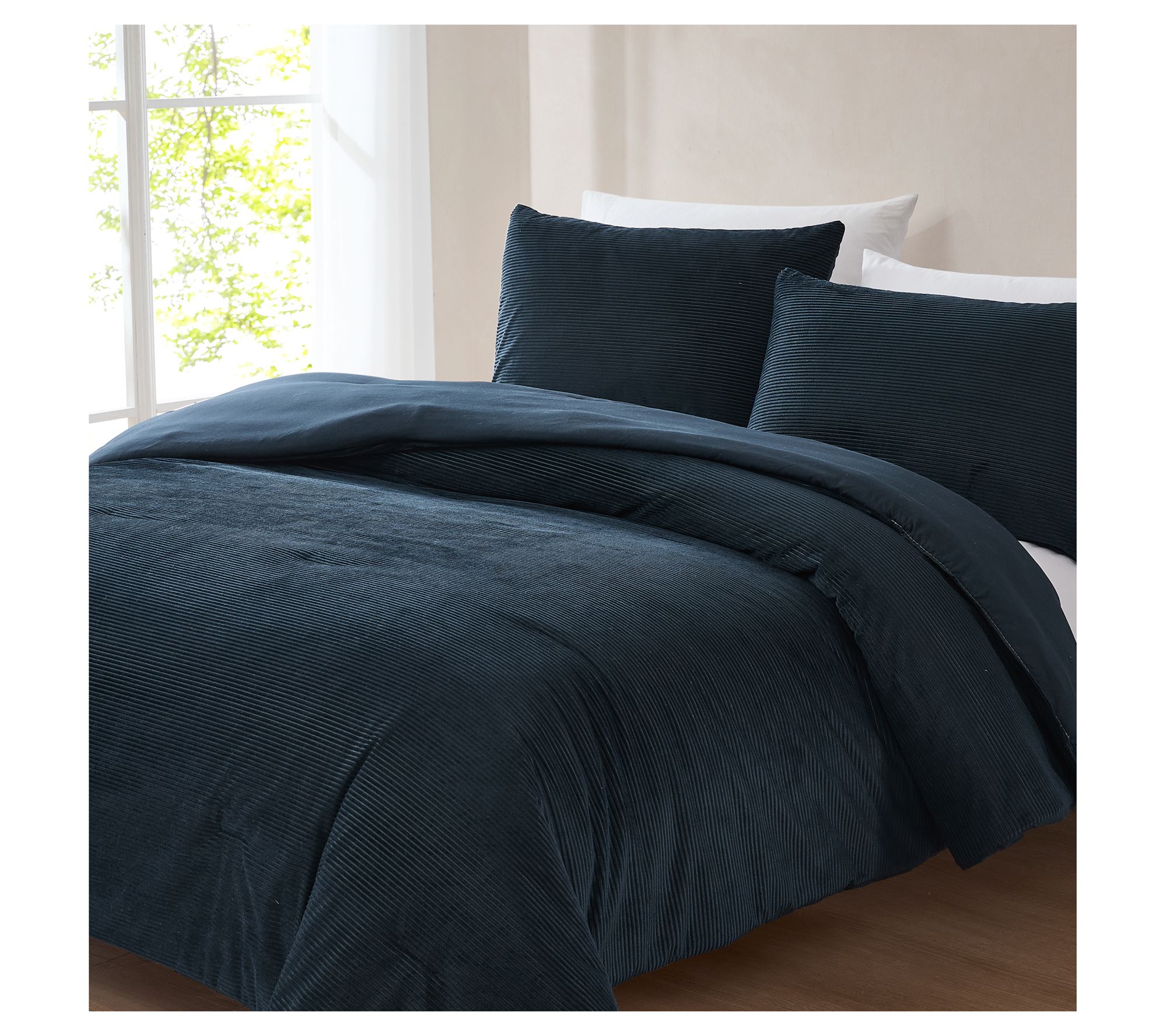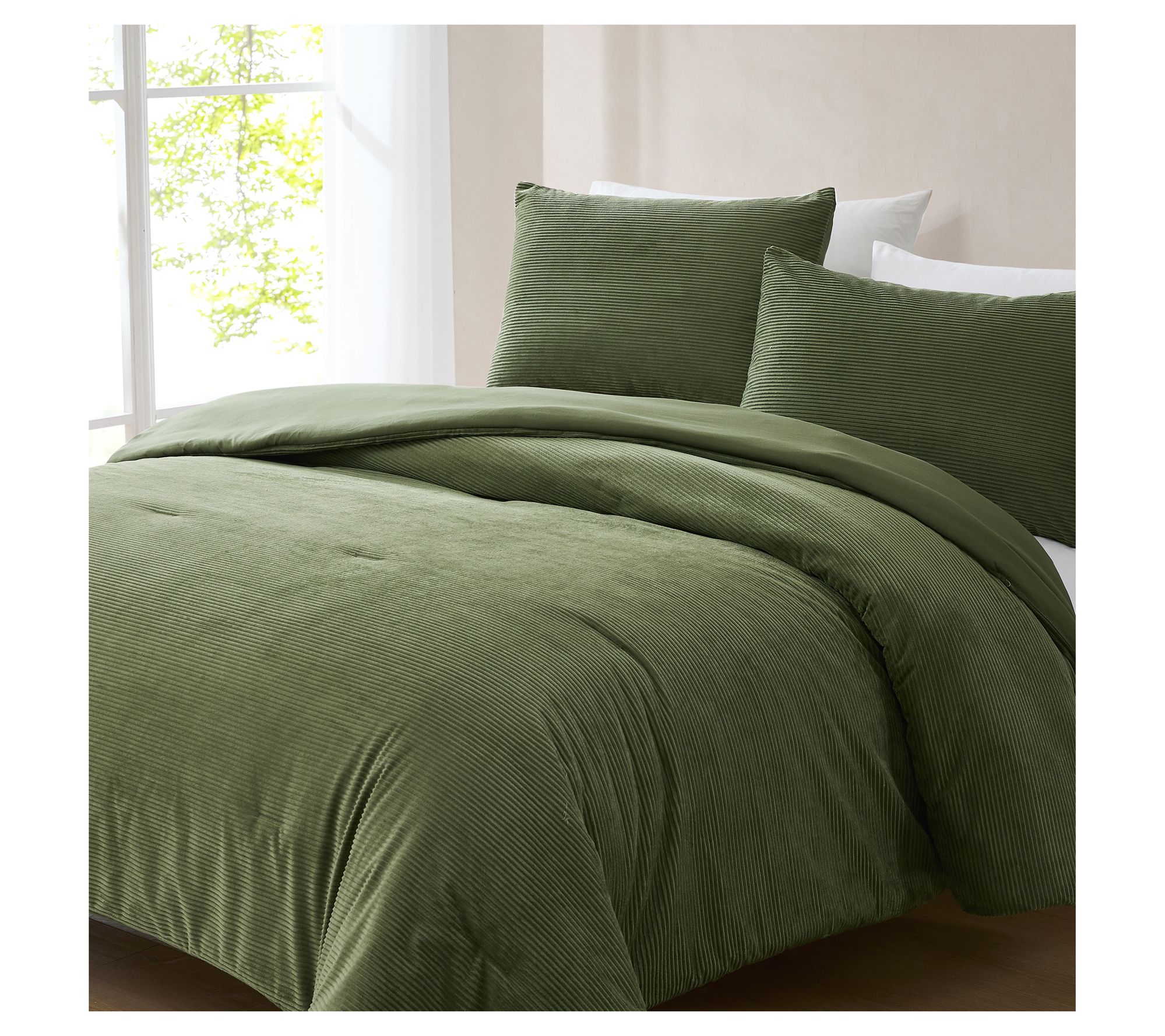 Bold ribbed lines and plush corduroy texture bring cozy warmth to your bedroom, inviting you to relax after a long day. This comforter set pairs velvety softness with a rich, solid hue for a minimalist retro feel that suits any decor. Unwind in style and comfort every night with this indulgent bedding. From Lush Decor.