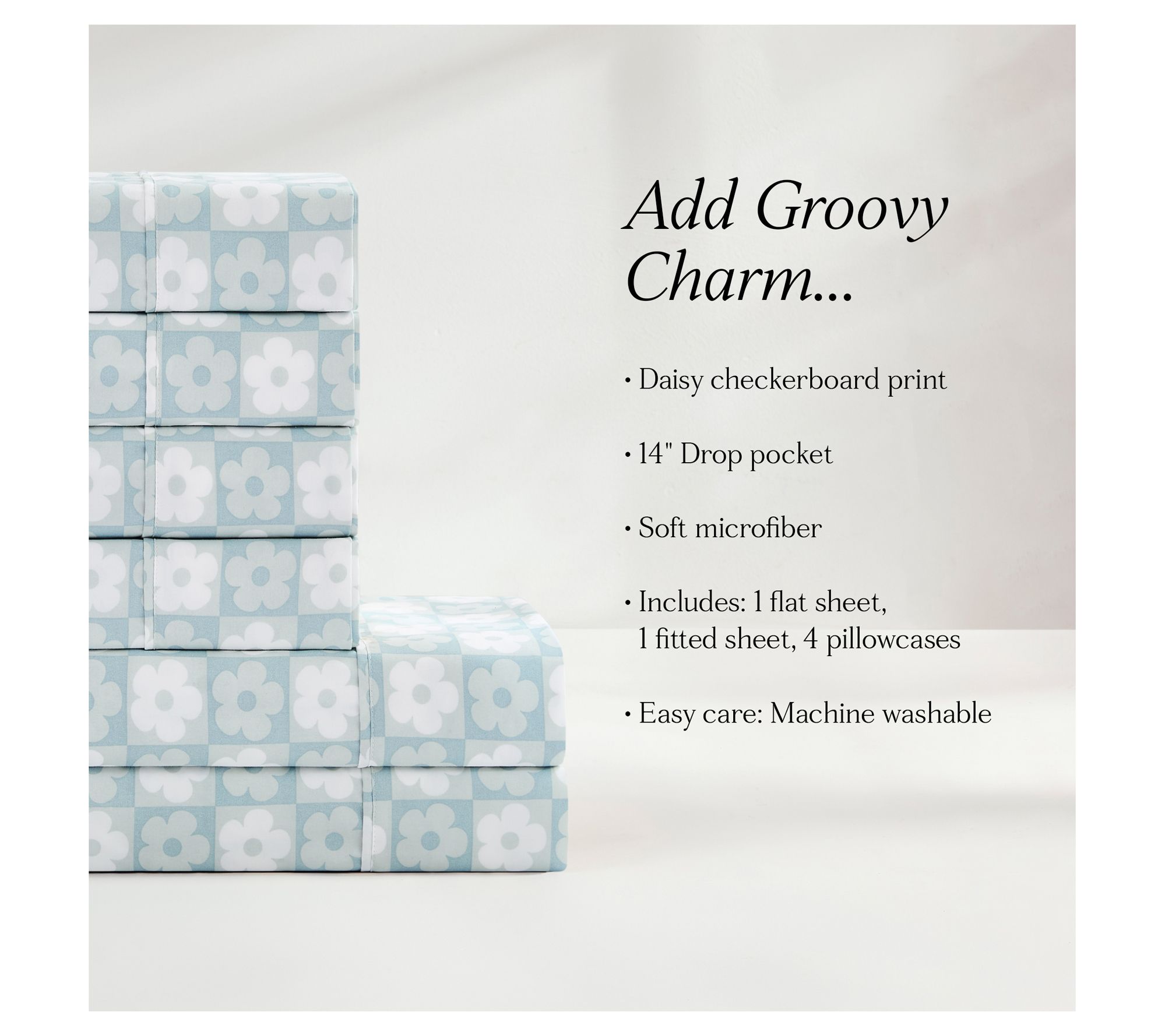 • Includes one flat sheet, one fitted sheet with 14" pocket depth, and four pillowcases