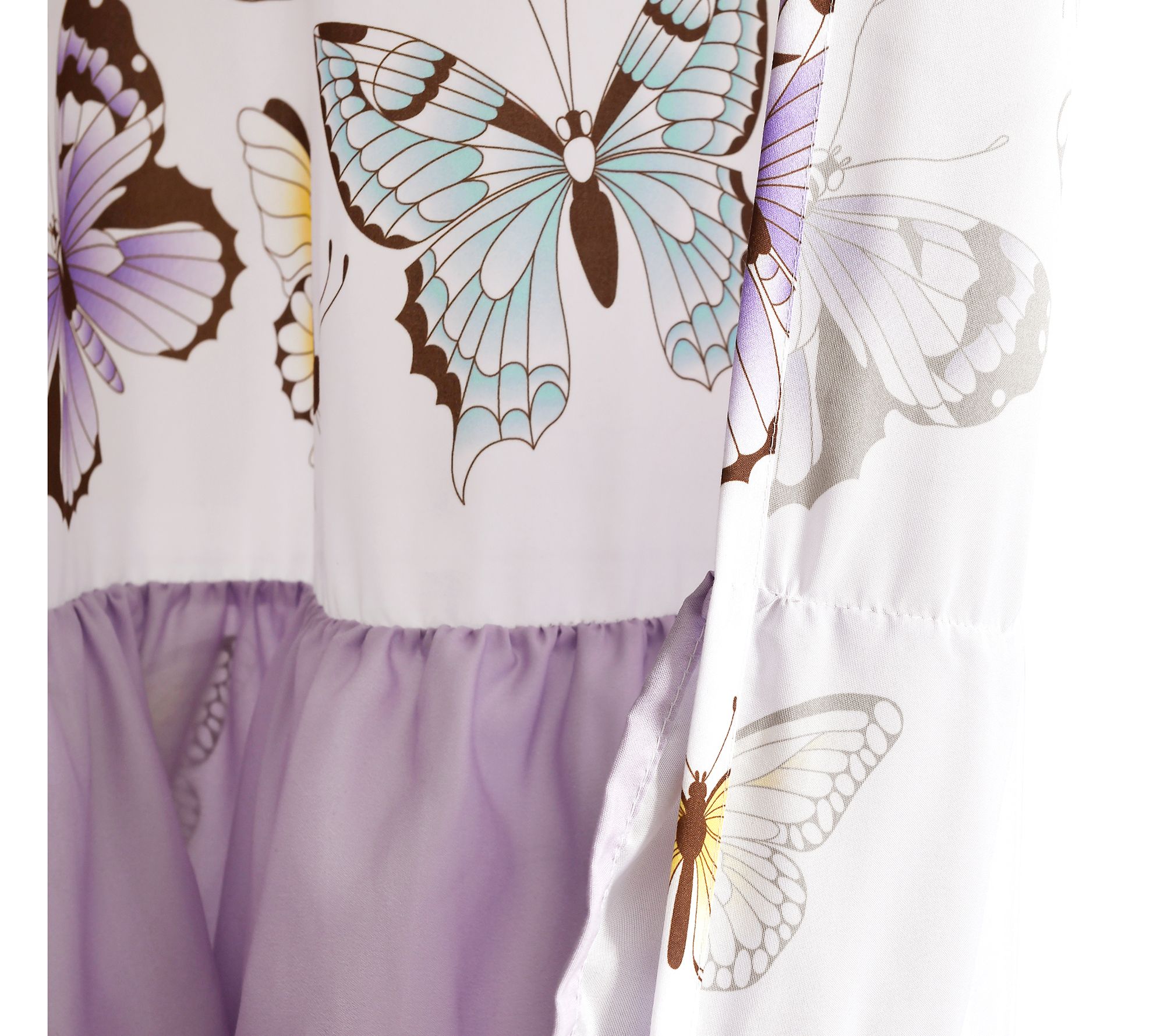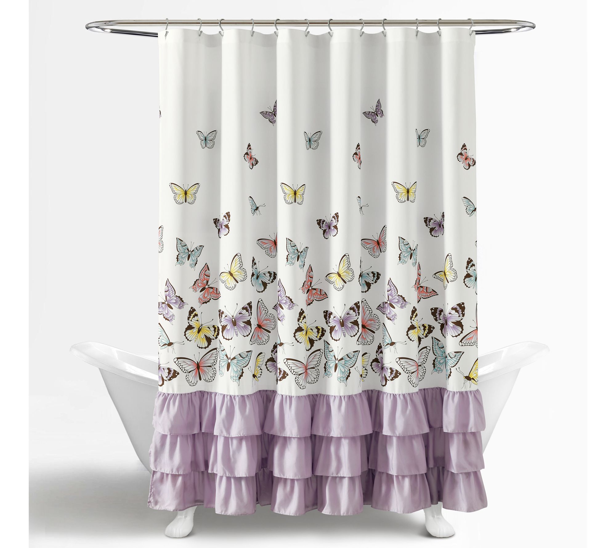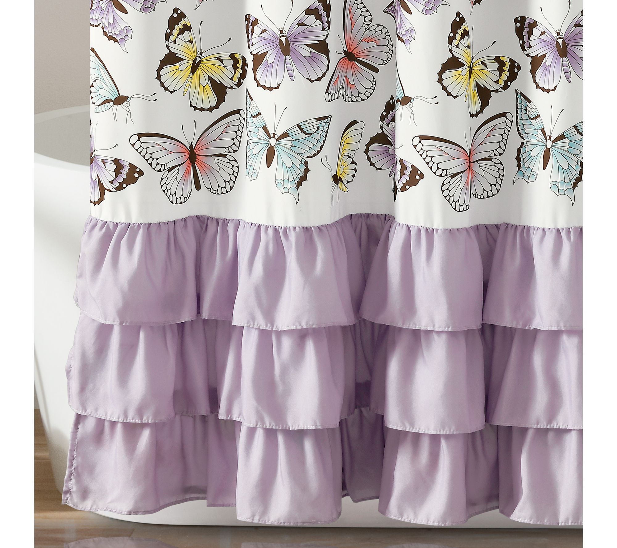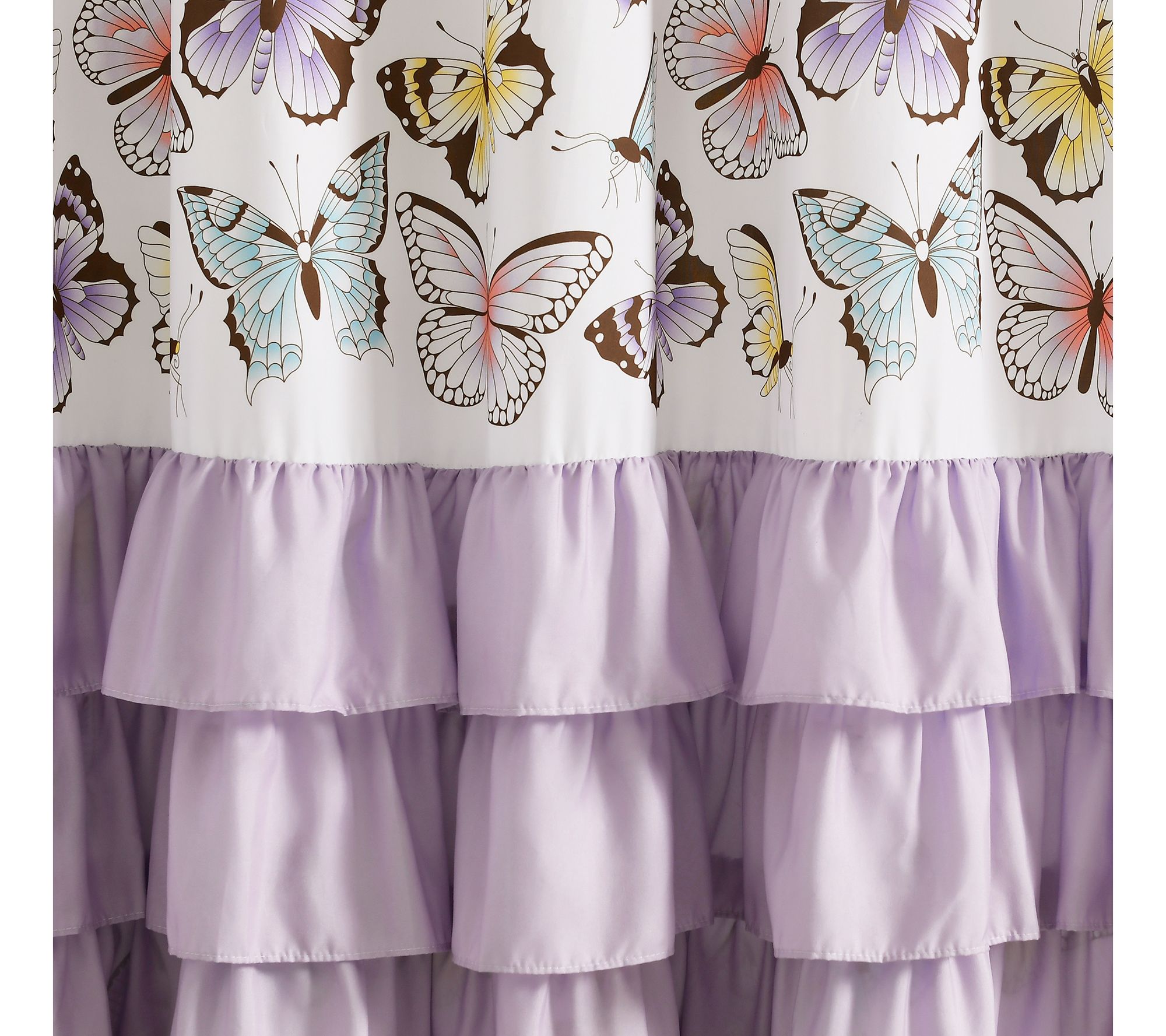 Add a splash of whimsy to your bathroom with this cloth shower curtain that features a field of colorful butterflies accented by fun pink ruffles. From Lush Decor.
