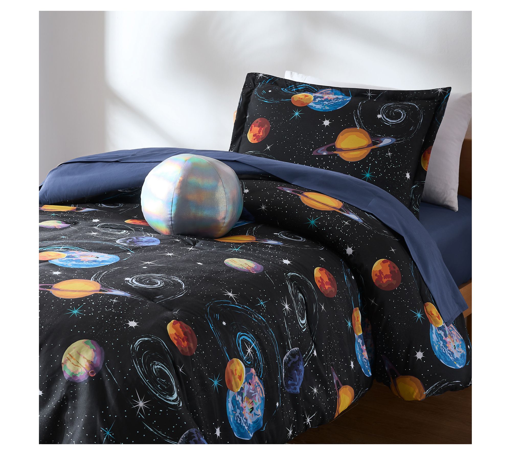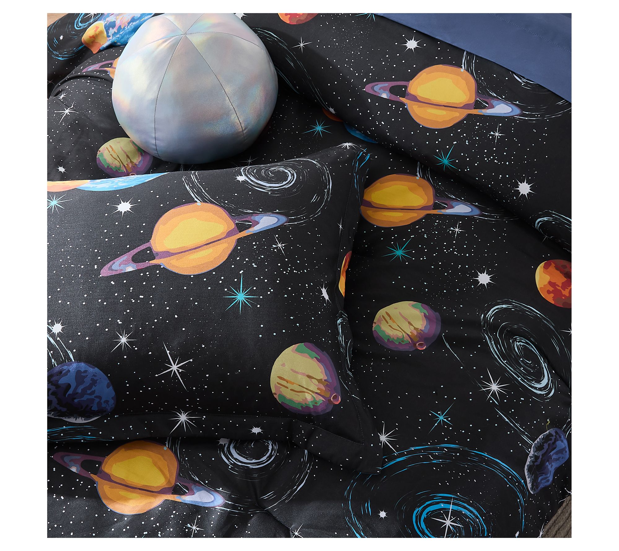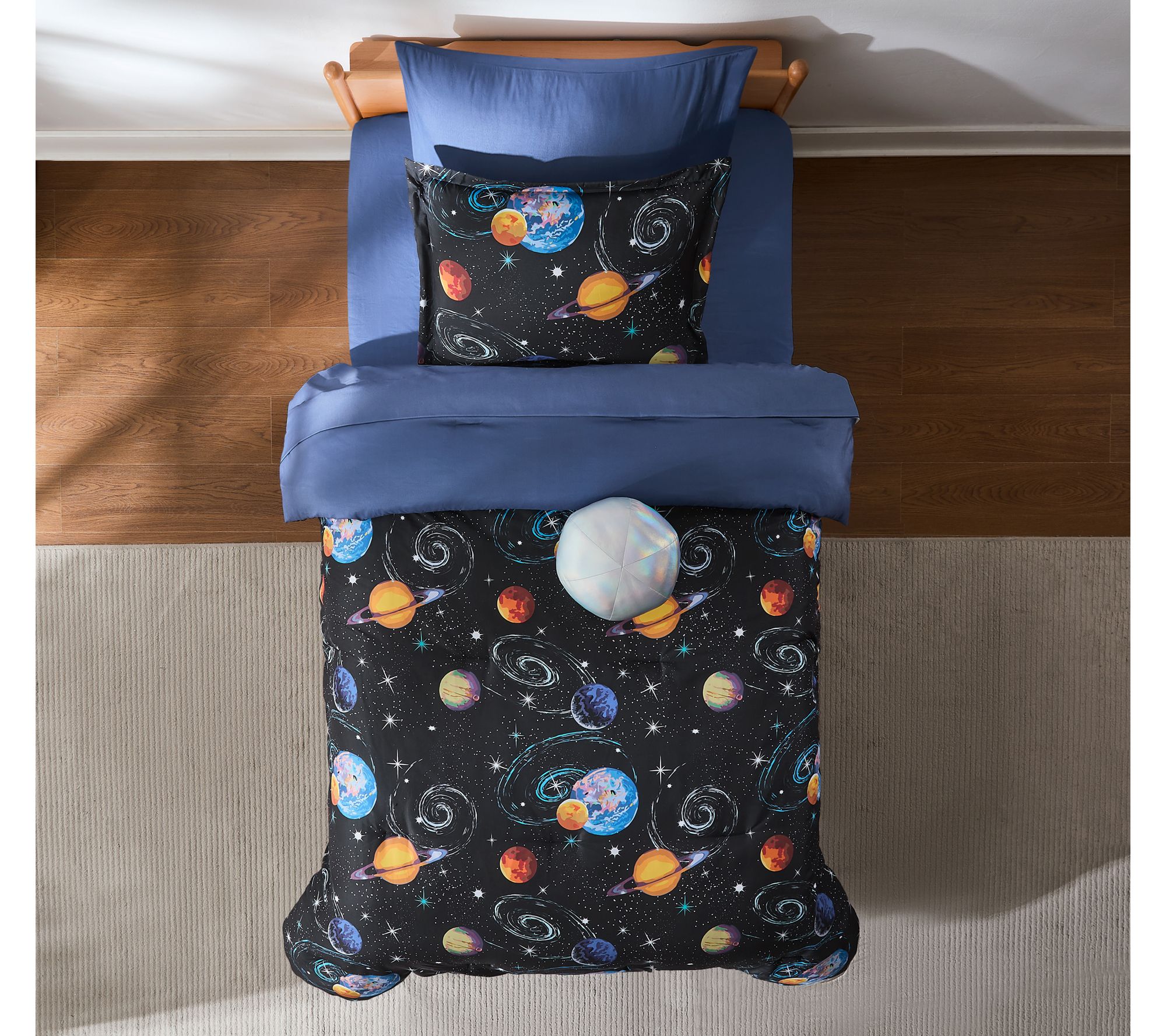 Turn bedtime into a cosmic adventure with the Mysterious Universe comforter set, featuring planets, stars, and galaxies drifting across a dreamy night sky. Soft microfiber fabric and down alternative fill offer cozy comfort, while the included sheets and decorative pillow make updating any aspiring astronaut's room quick and easy. From Lush Decor.