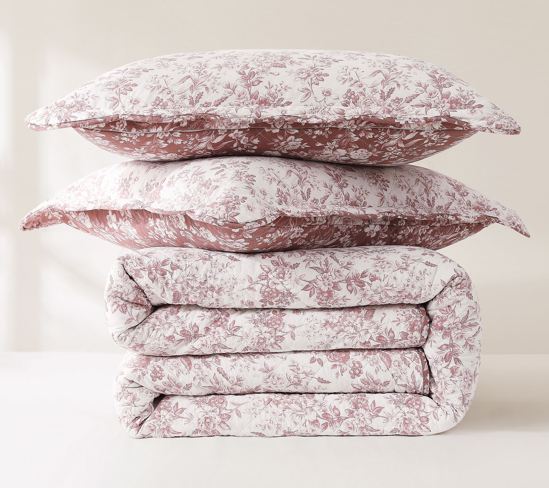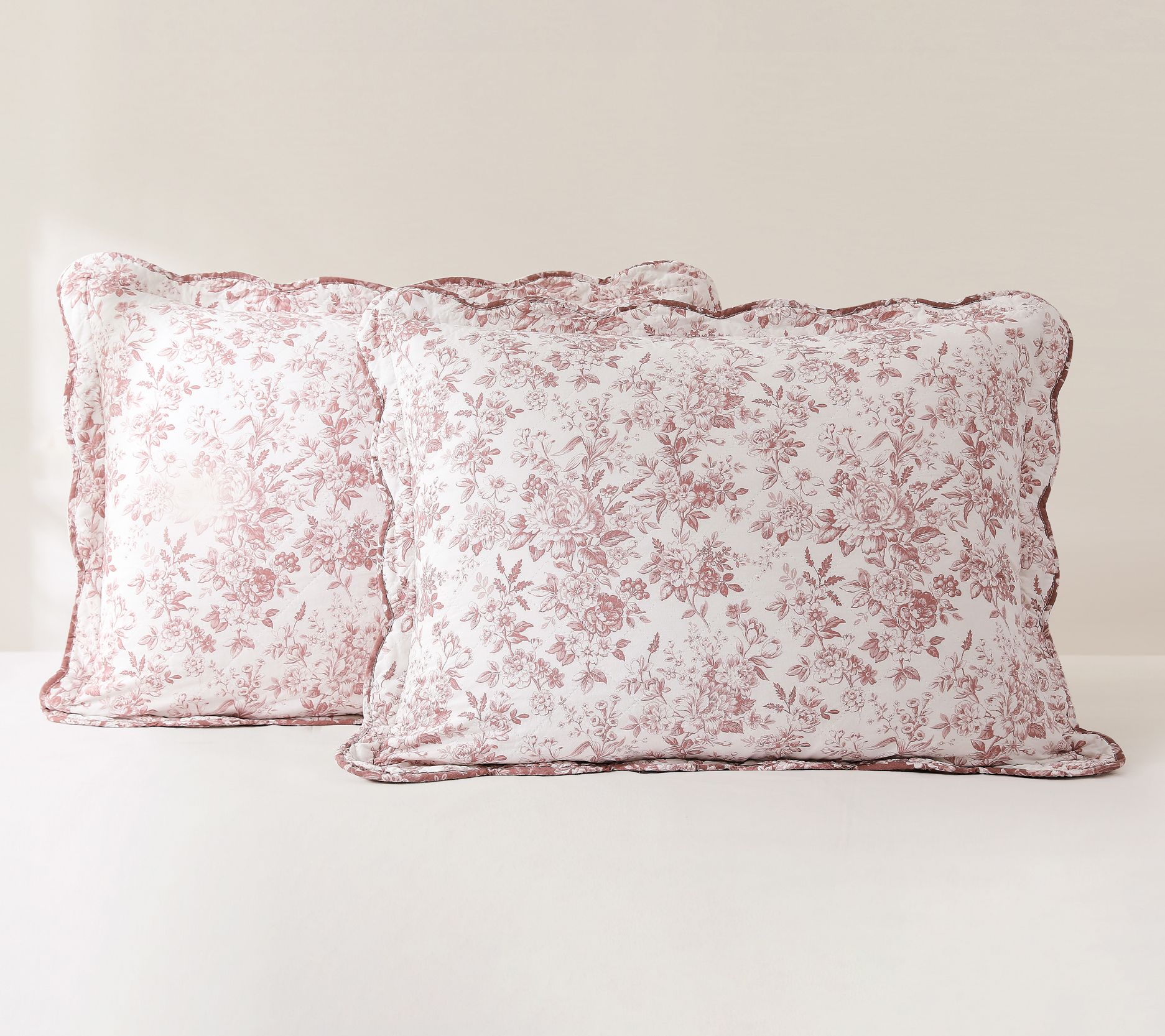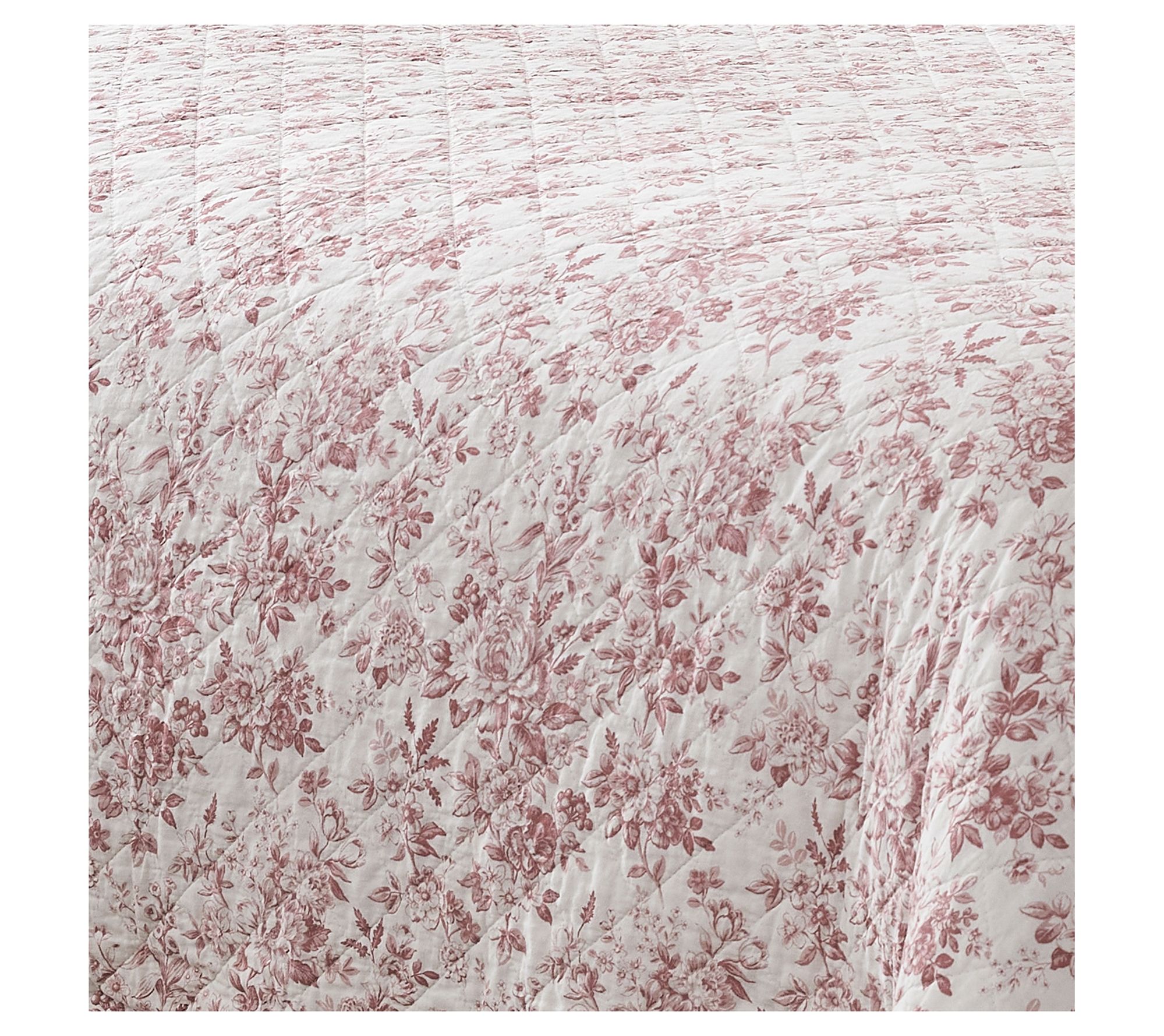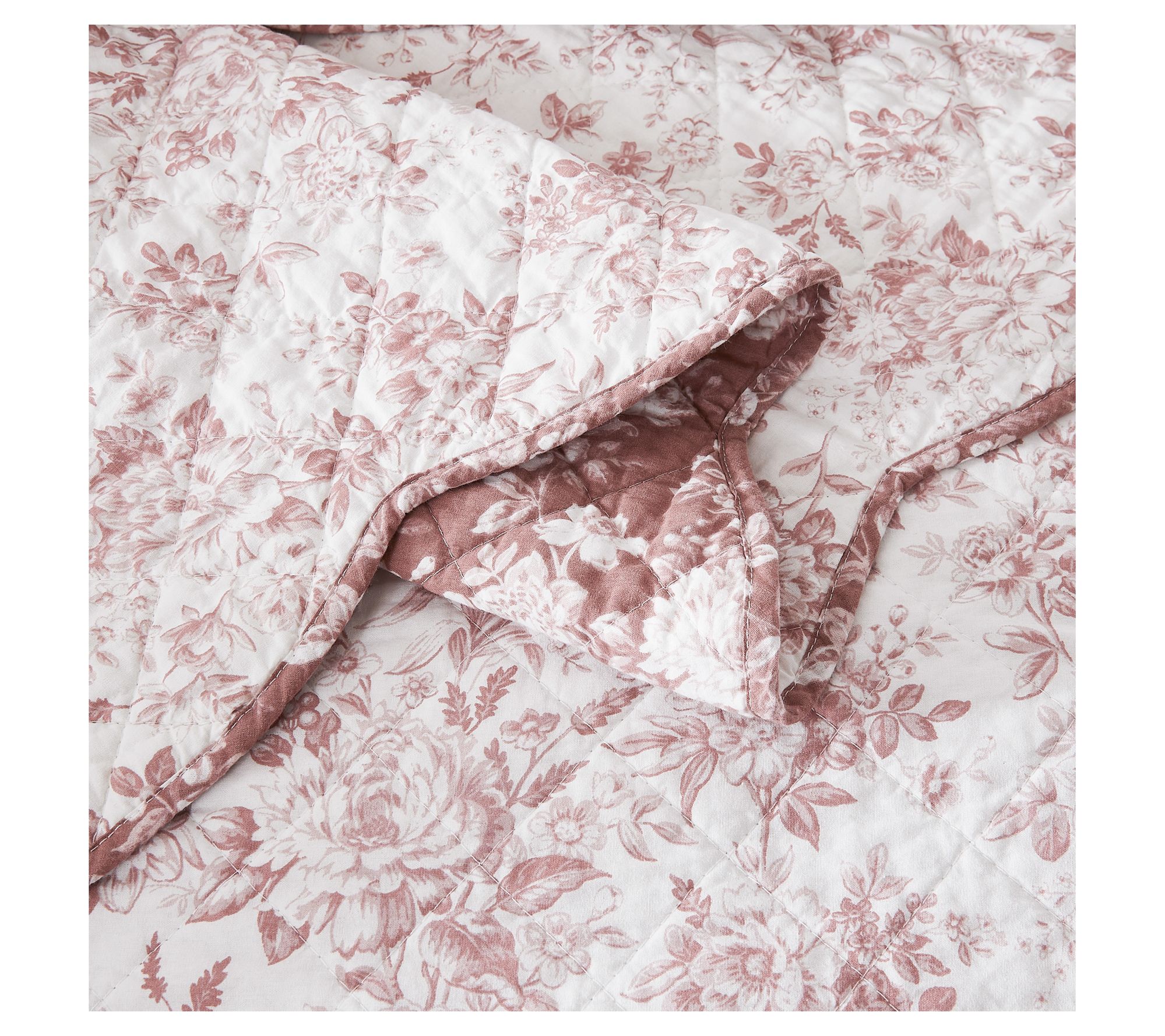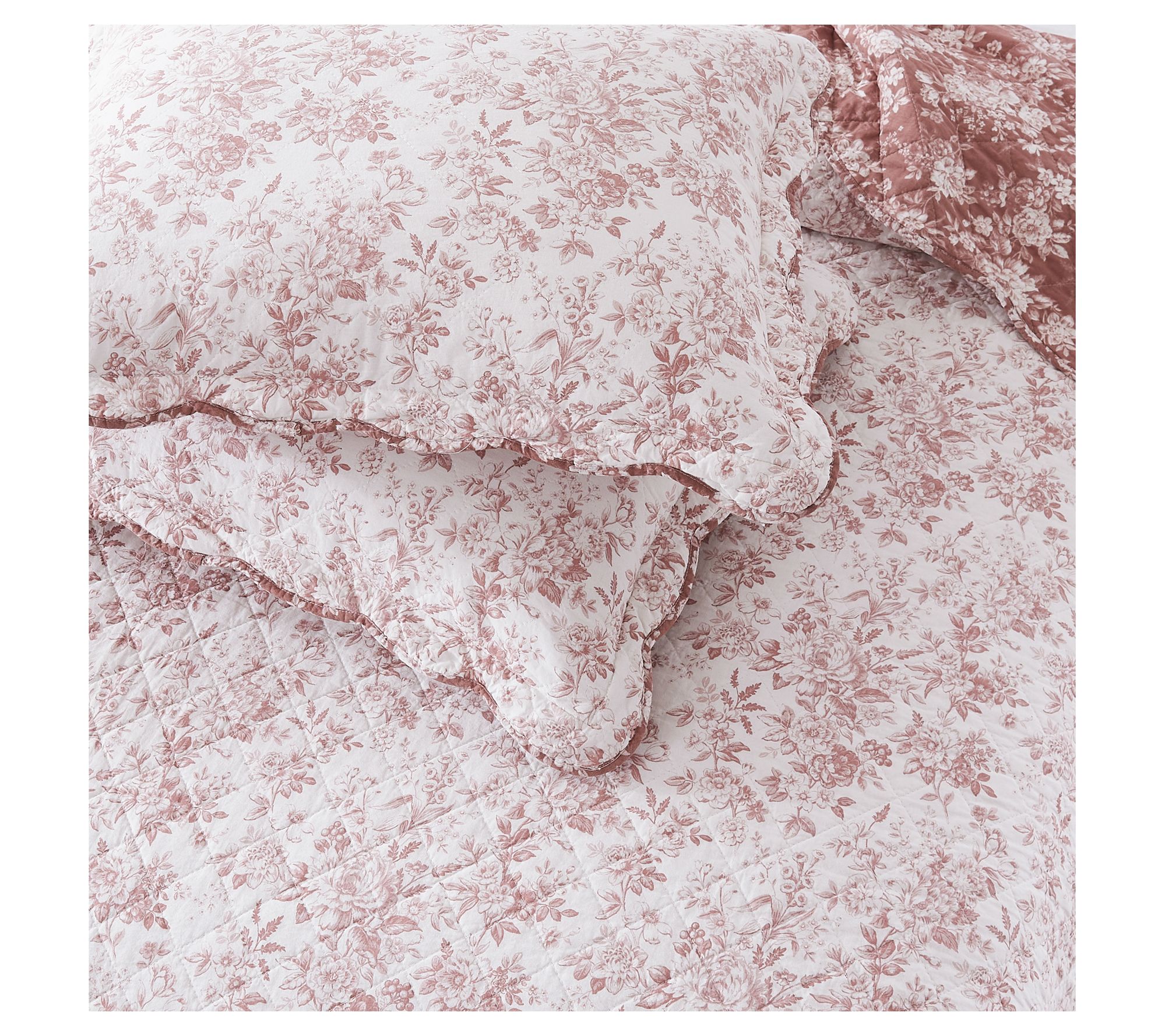 Make your bedroom bloom with the Peony Toile Reversible Cotton Quilt Set, featuring blushing flowers and delicate scalloped edges in a design that transforms your space with each flip. The soft cotton and lightweight polyfill offer cozy comfort, while two color options make it easy to update your look whenever the mood strikes. From Lush Decor.